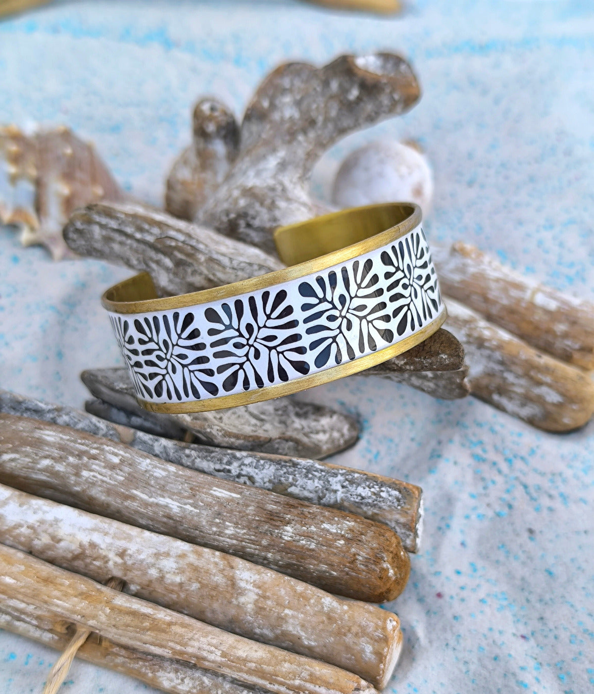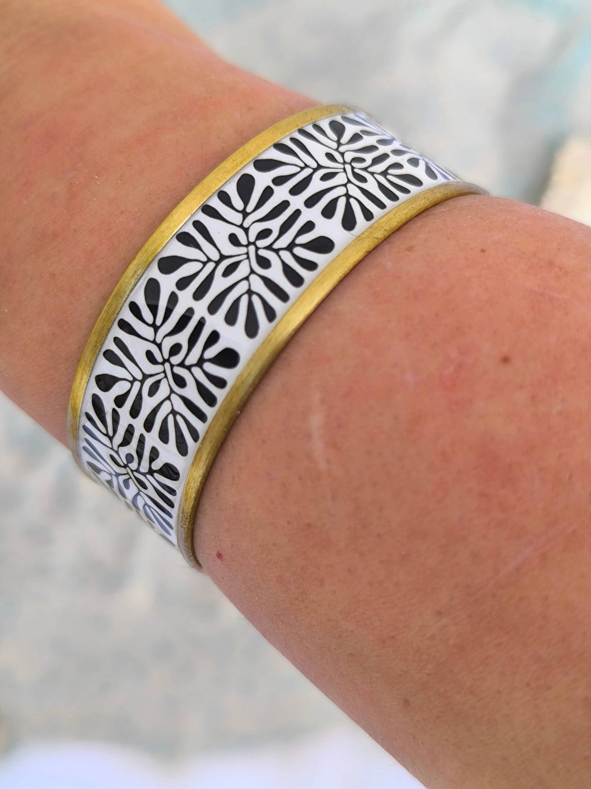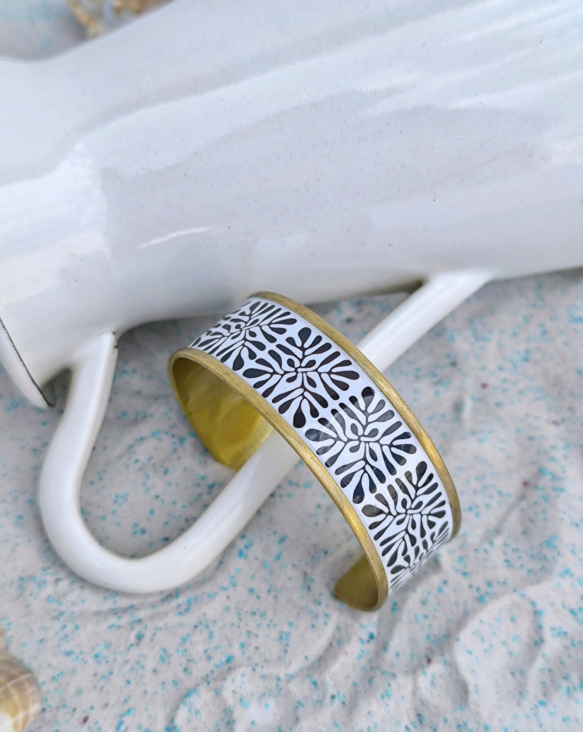 Ολόκληρο το μεσογειακό καλοκαίρι σε ένα κόσμημα! Ανοιχτό βραχιόλι χειροπέδα από μπρούτζο, ζωγραφισμένο με γεωμετρικά σχέδια. Ιδανικό για κάθε σας καλοκαιρινή εμφάνιση. Μέρος της συλλογής μας "Τα Παλιά Πλακάκια", ξυπνά αναμνήσεις από ηλιόλουστες διακοπές, φθαρμένα ψηφιδωτά δάπεδα και μεσογειακά σπίτια γεμάτα ιστορία και συναίσθημα.