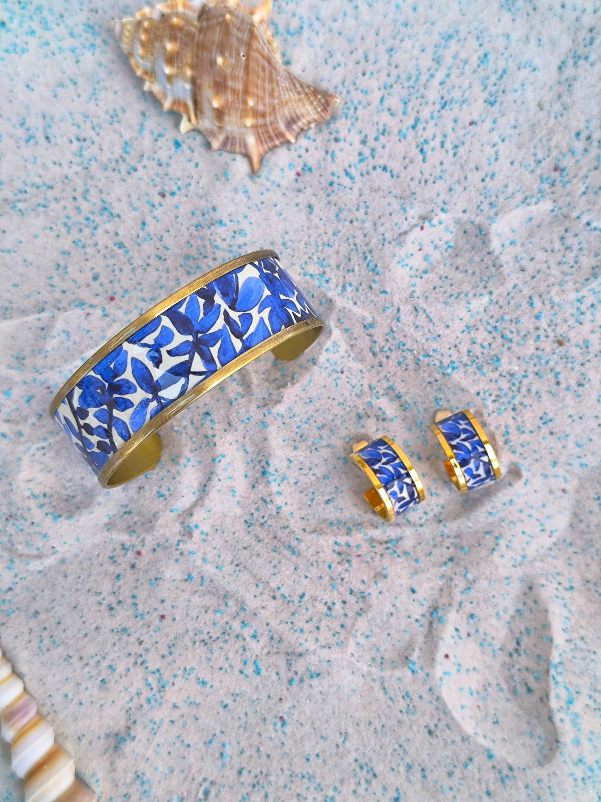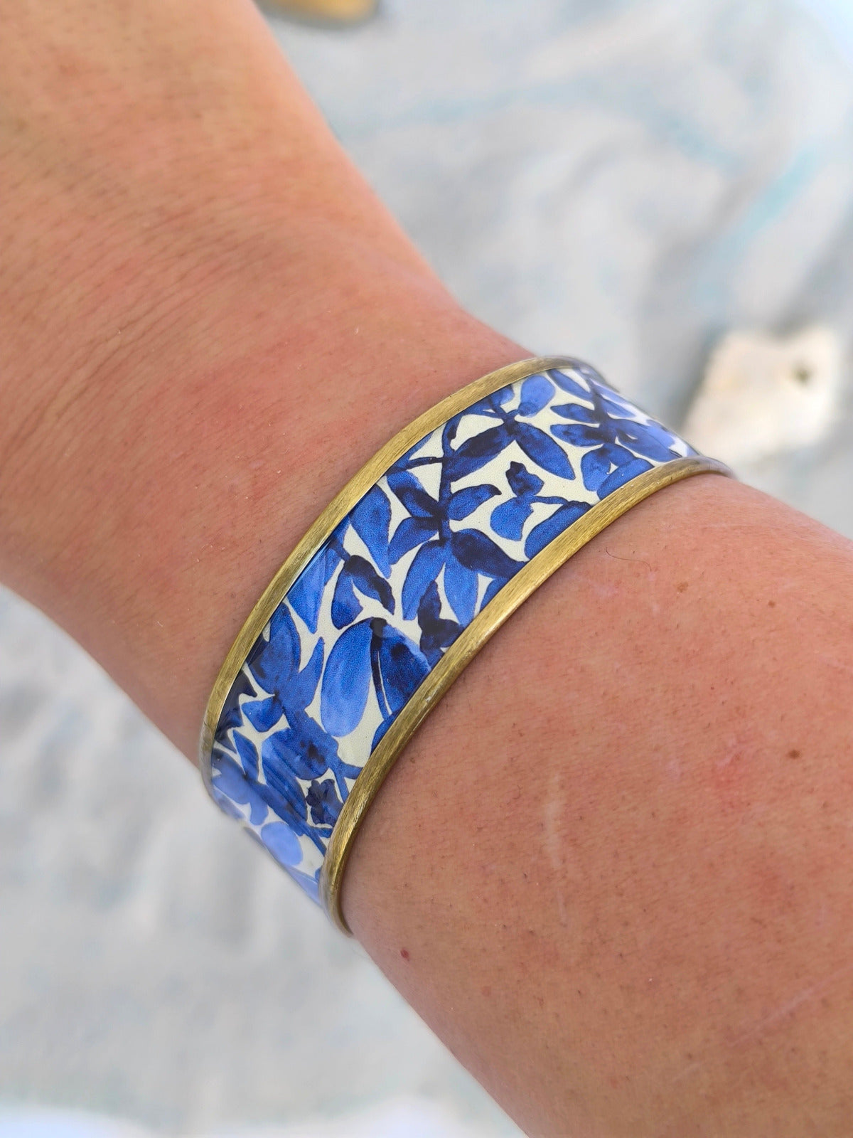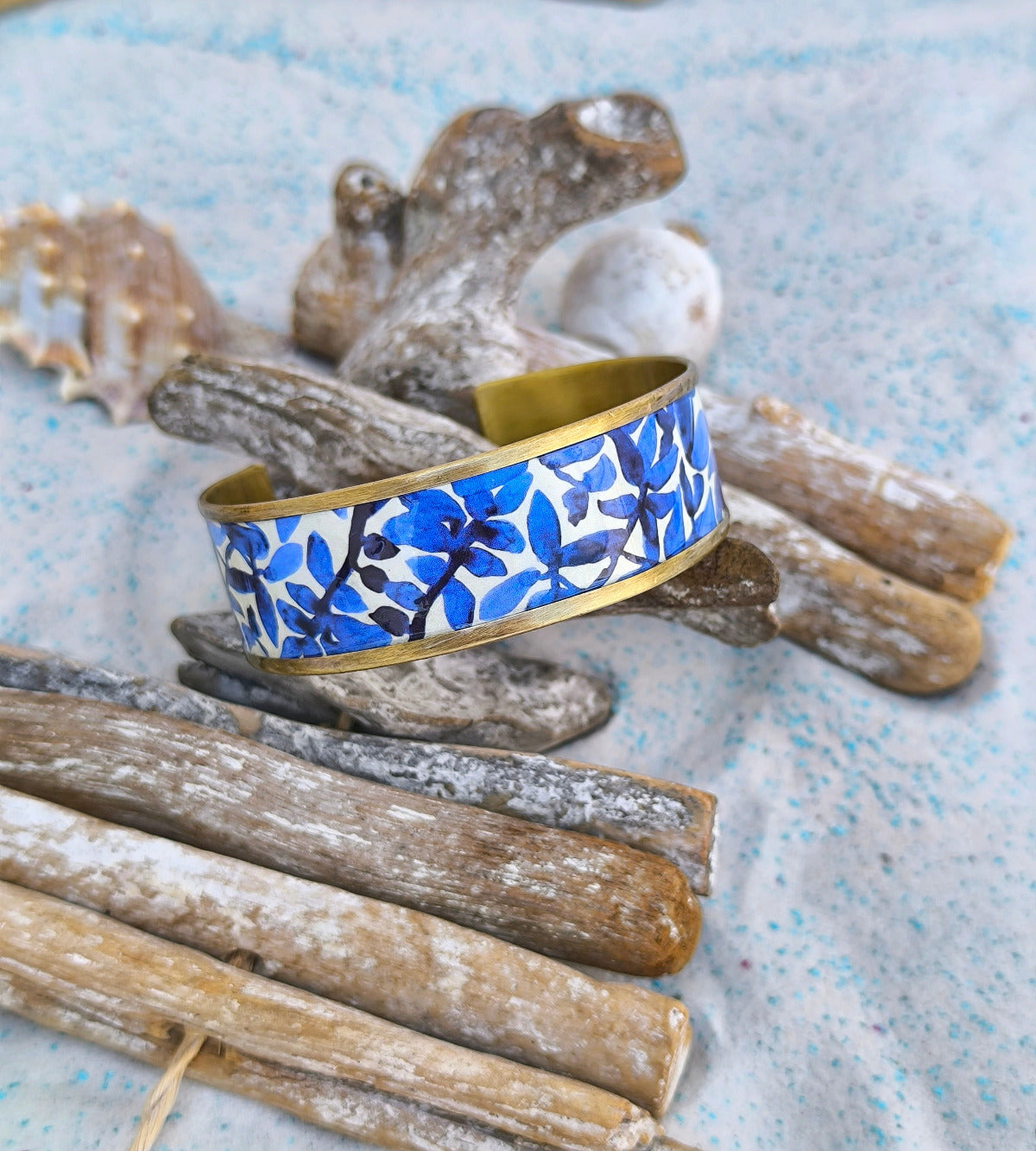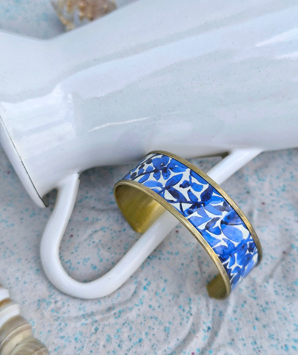 Ολόκληρο το μεσογειακό καλοκαίρι σε ένα κόσμημα! Ανοιχτό βραχιόλι χειροπέδα από μπρούτζο, ζωγραφισμένο με μπλε φλοράλ σχέδια. Ιδανικό για κάθε σας καλοκαιρινή εμφάνιση. Μέρος της συλλογής μας "Τα Παλιά Πλακάκια", ξυπνά αναμνήσεις από ηλιόλουστες διακοπές, φθαρμένα ψηφιδωτά δάπεδα και μεσογειακά σπίτια γεμάτα ιστορία και συναίσθημα.