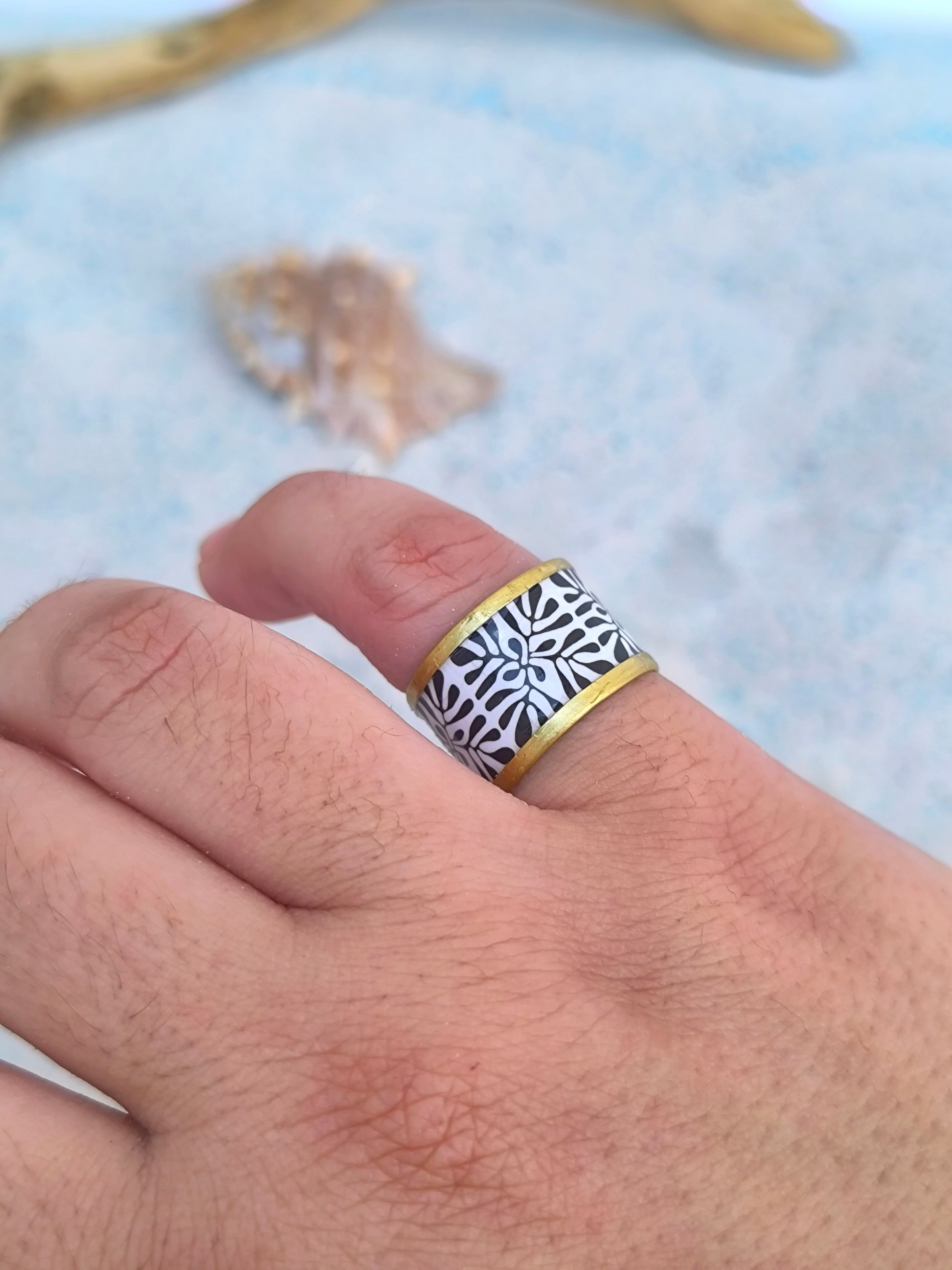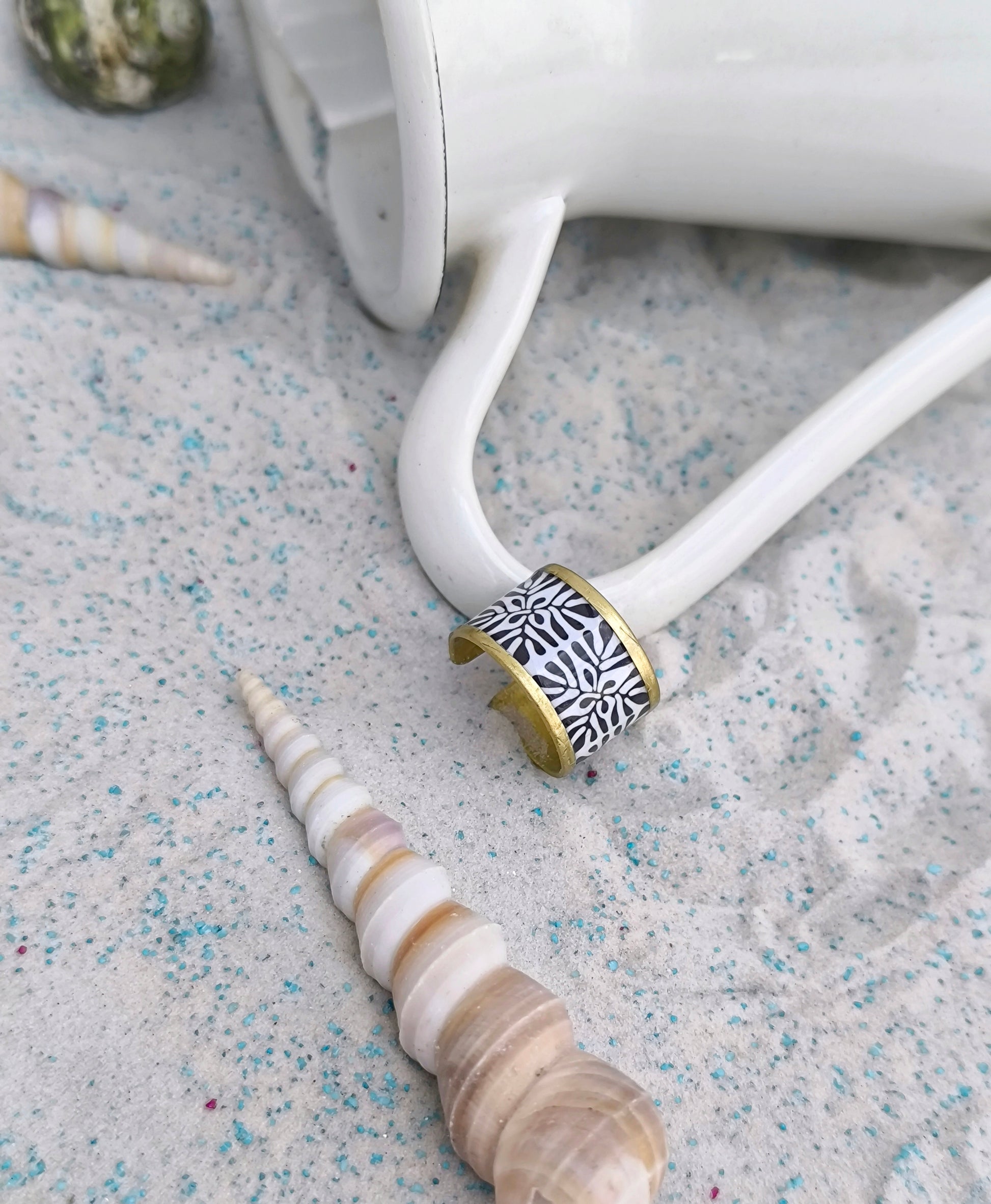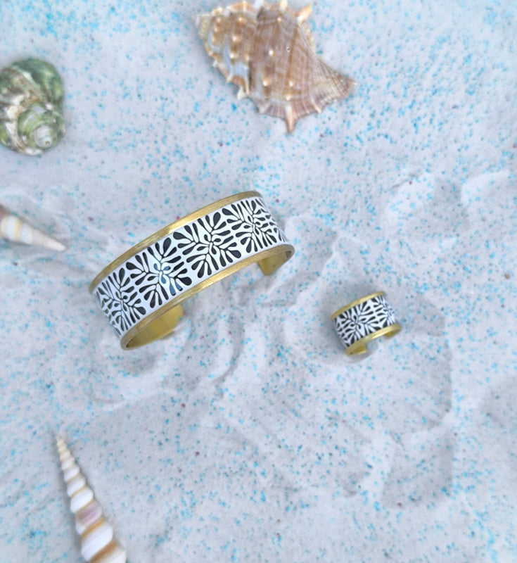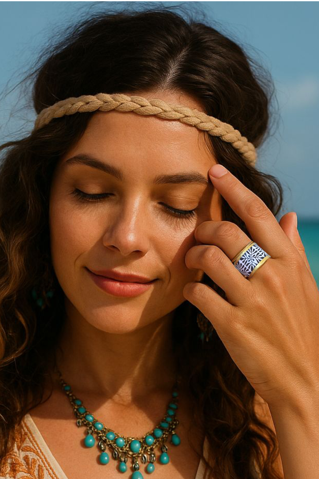 Ολόκληρο το μεσογειακό καλοκαίρι σε ένα κόσμημα! Ανοιχτό δαχτυλίδι από μπρούτζο, ζωγραφισμένο στο χέρι, εμπνευσμένο από παλιά πλακάκια με γεωμετρικά σχέδια. Ιδανικό για κάθε σας καλοκαιρινή εμφάνιση. Μέρος της συλλογής μας "Τα Παλιά Πλακάκια", ξυπνά αναμνήσεις από ηλιόλουστες διακοπές, φθαρμένα ψηφιδωτά δάπεδα και μεσογειακά σπίτια γεμάτα ιστορία και συναίσθημα.