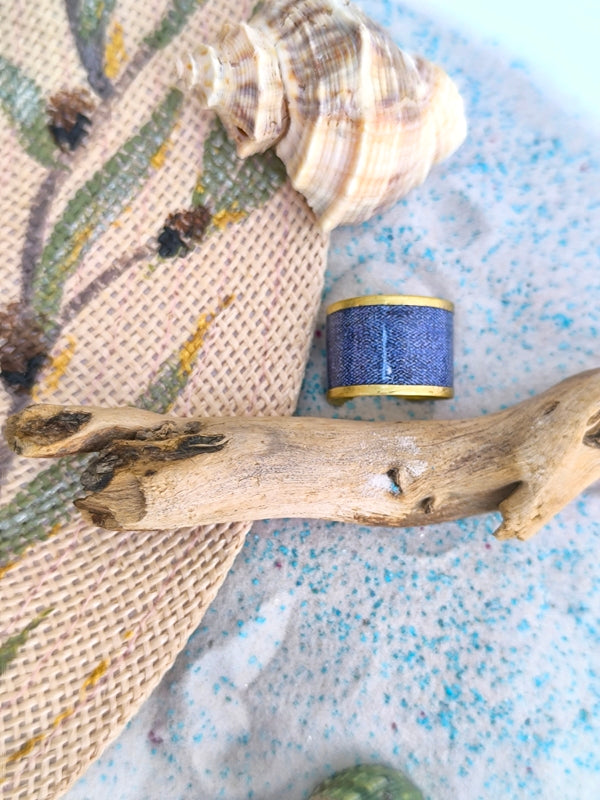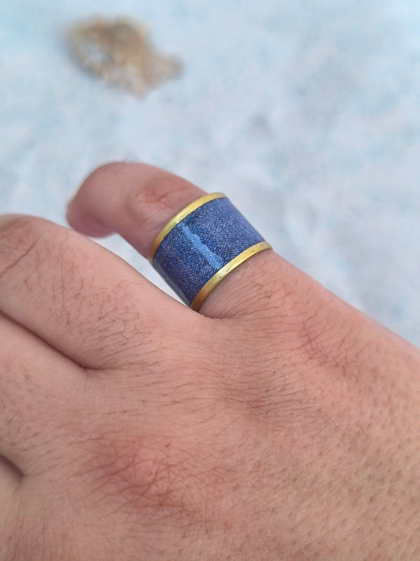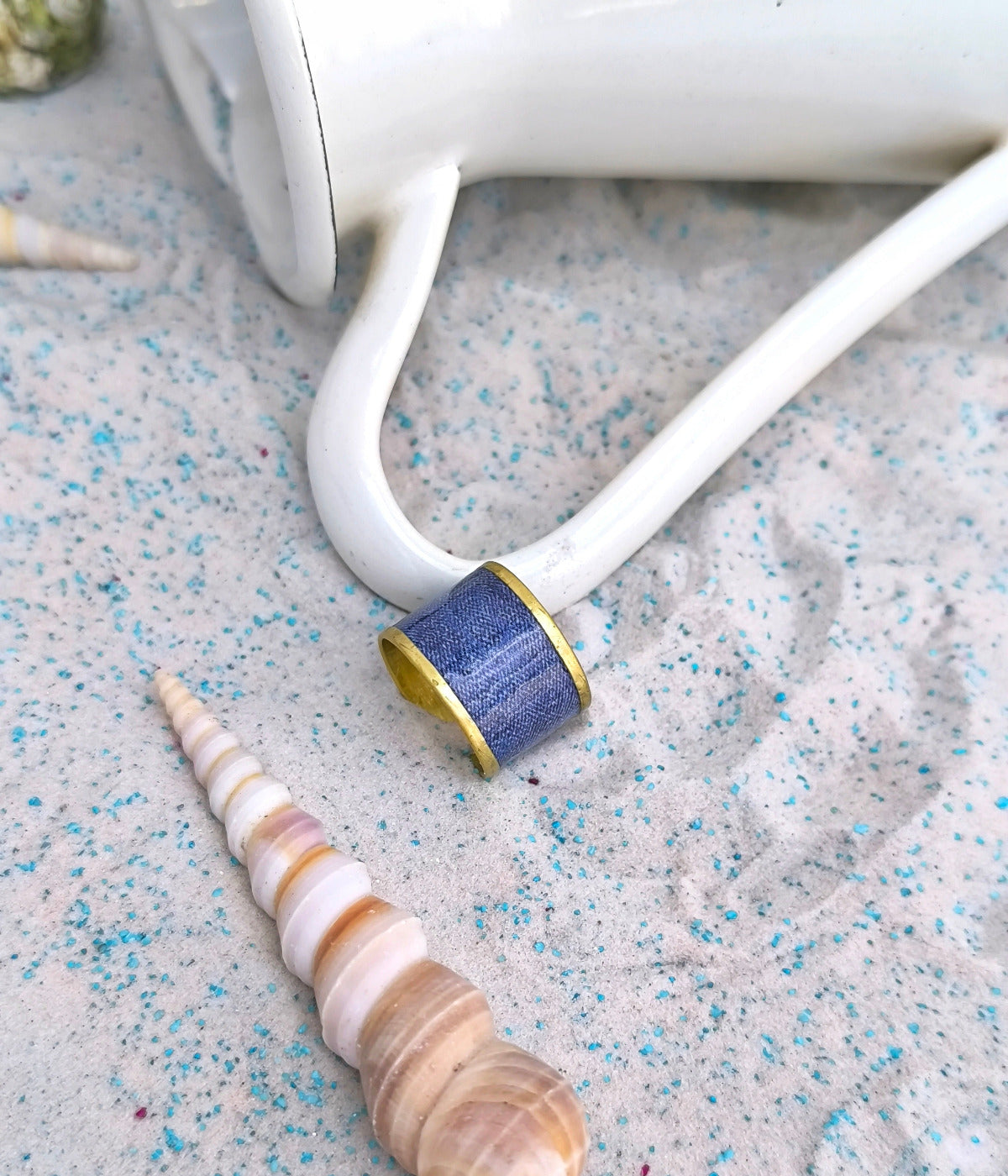 Ολόκληρο το μεσογειακό καλοκαίρι σε ένα κόσμημα! Ανοιχτό δαχτυλίδι από μπρούτζο, ζωγραφισμένο για να δίνει την ψευδαίσθηση του τζιν. Ιδανικό για κάθε σας καλοκαιρινή εμφάνιση. Μέρος της συλλογής μας "Τα Παλιά Πλακάκια", ξυπνά αναμνήσεις από ηλιόλουστες διακοπές, φθαρμένα ψηφιδωτά δάπεδα και μεσογειακά σπίτια γεμάτα ιστορία και συναίσθημα.