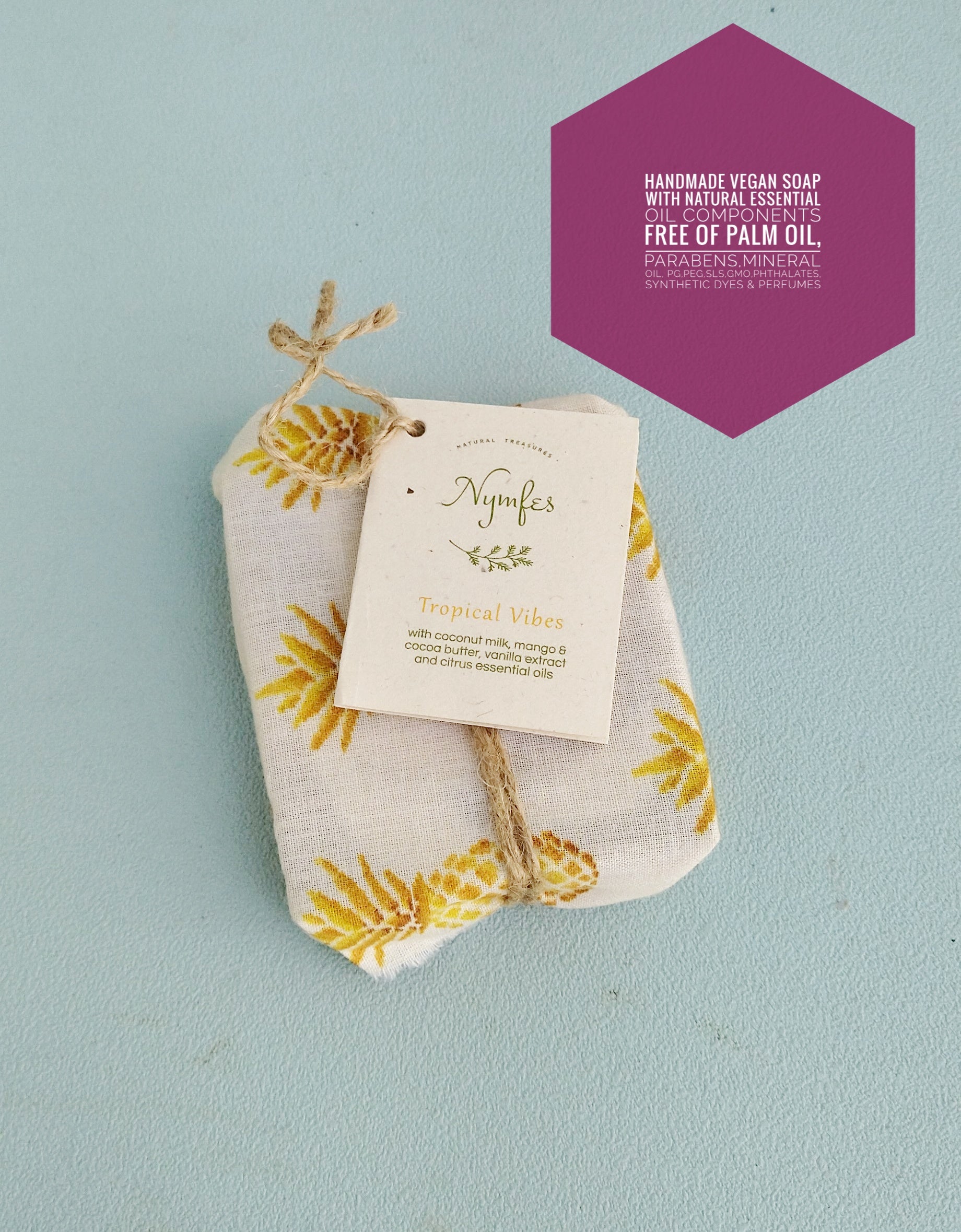 ❊ Χειροποίητο Σαπουνάκι: Χειροποίητο σαπουνάκι με φυσικά συστατικά και αιθέρια έλαια από τις αγαπημένες μας "Nymfes Cosmetics". Όλα τα σαπούνια τυλίγονται σε πολύχρωμα υφάσματα έτοιμα να γίνουν ένα υπέροχο δώρο! Επιπλέον περιλαμβάνουν ετικέτα με τα συστατικά τους και άλλες χρήσιμες πληροφορίες. FREE OF: PALM OIL, PARABENS, MINERAL OIL, PG, PEG, SLS, GMO, PHTHALATES, SYNTHETIC DYES & PERFUMES
