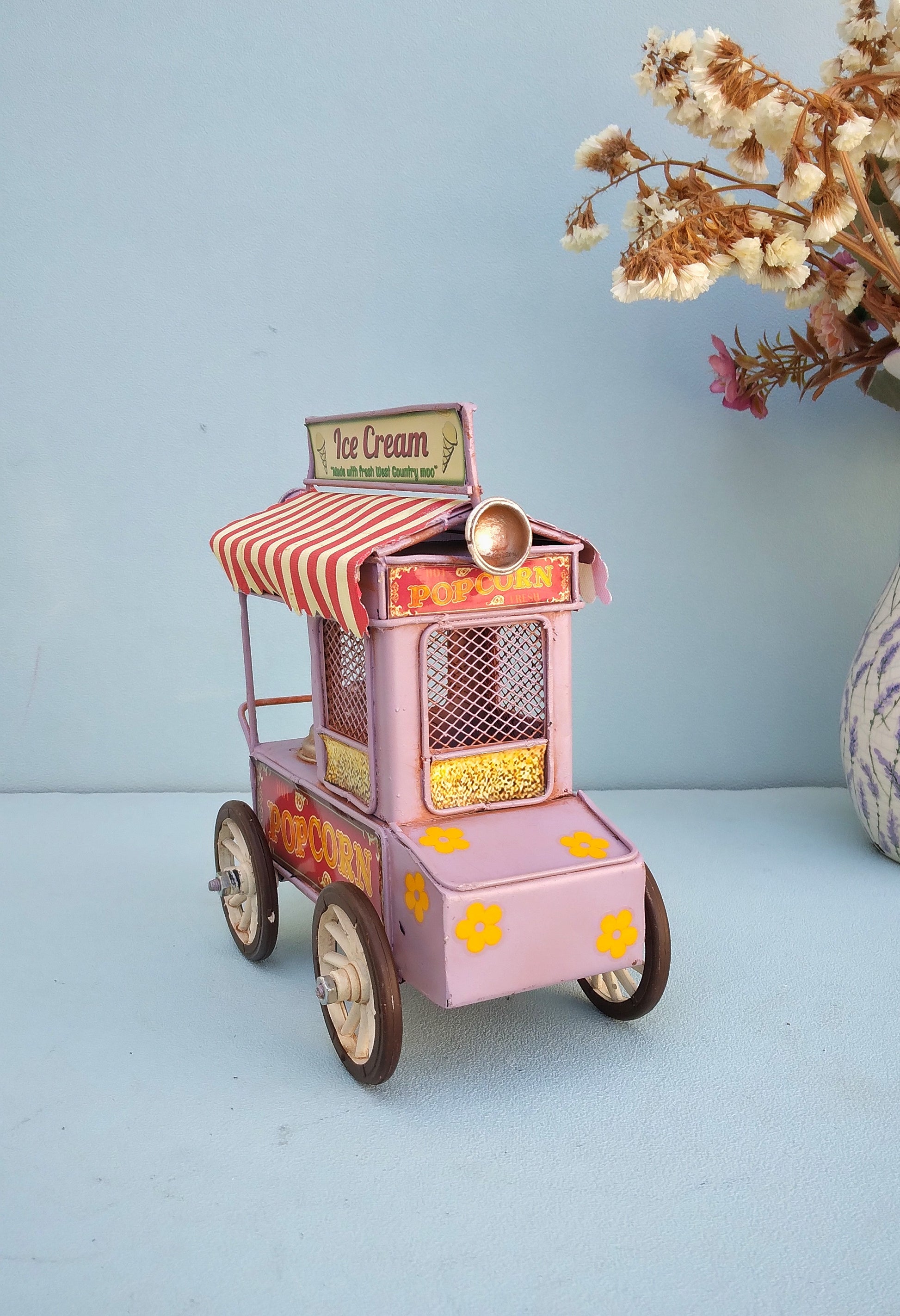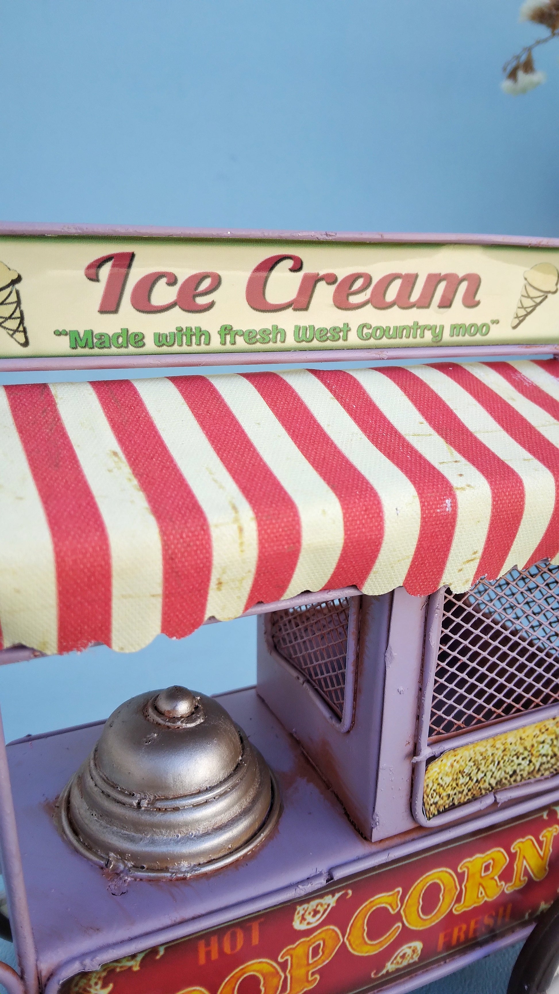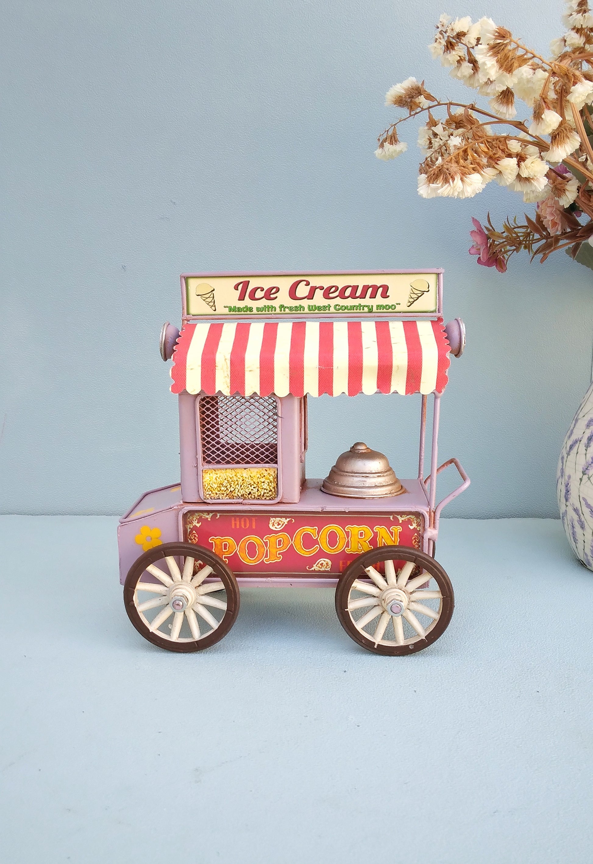 Γλυκύτατη μεταλλική μινιατούρα καροτσάκι παγωτού και ποπ κορν! Φτιαγμένη εξολοκλήρου στο χέρι και βαμμένη σε στυλ της δεκαετίας του 50. Με ιδιαίτερες λεπτομέρειες στο σχεδιασμό, είναι έτοιμη για το λούνα πάρκ! Ιδανικό δώρο για ιδιοκτήτη ζαχαροπλαστείου.