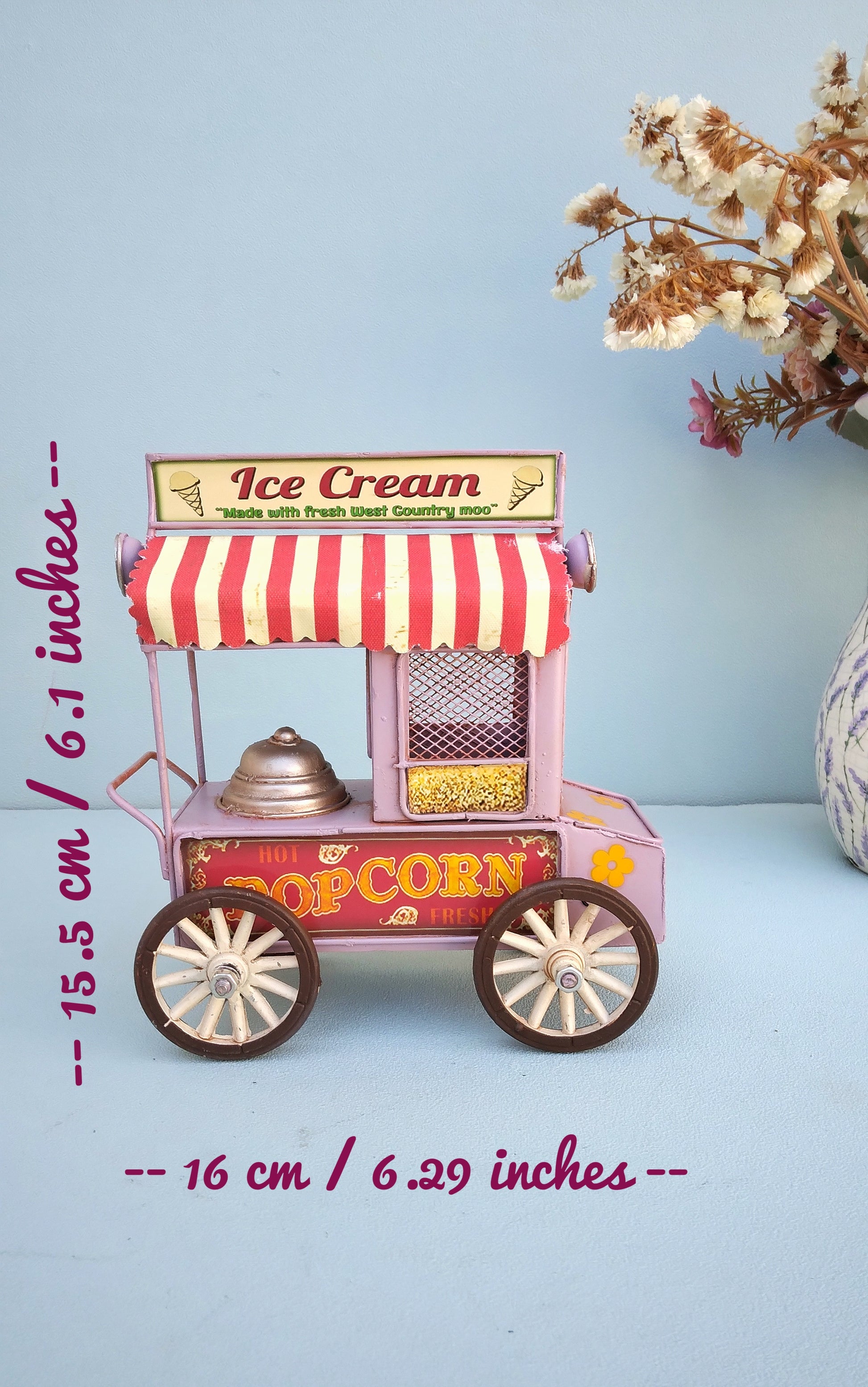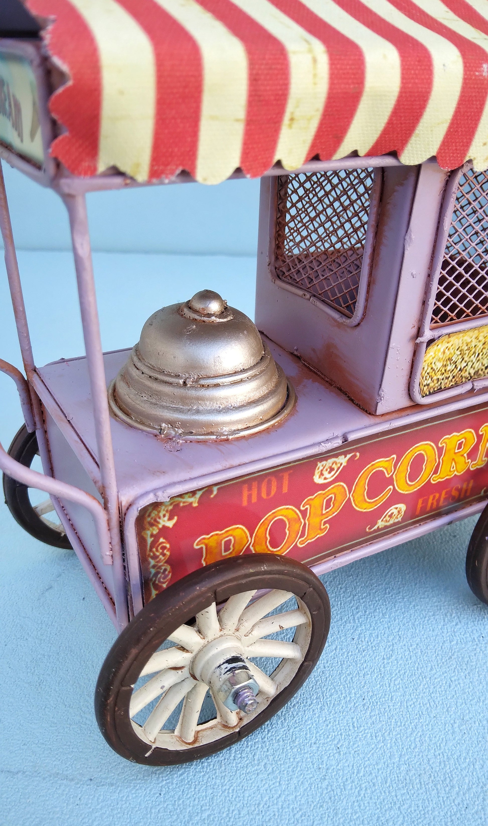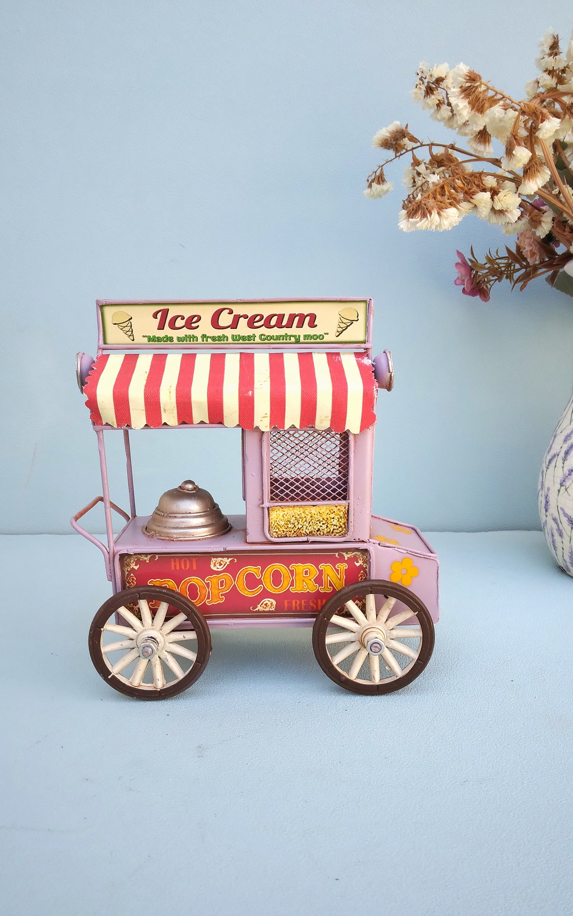 Γλυκύτατη μεταλλική μινιατούρα καροτσάκι παγωτού και ποπ κορν! Φτιαγμένη εξολοκλήρου στο χέρι και βαμμένη σε στυλ της δεκαετίας του 50. Με ιδιαίτερες λεπτομέρειες στο σχεδιασμό, είναι έτοιμη για το λούνα πάρκ! Ιδανικό δώρο για ιδιοκτήτη ζαχαροπλαστείου.
