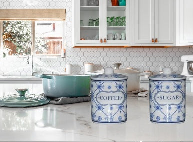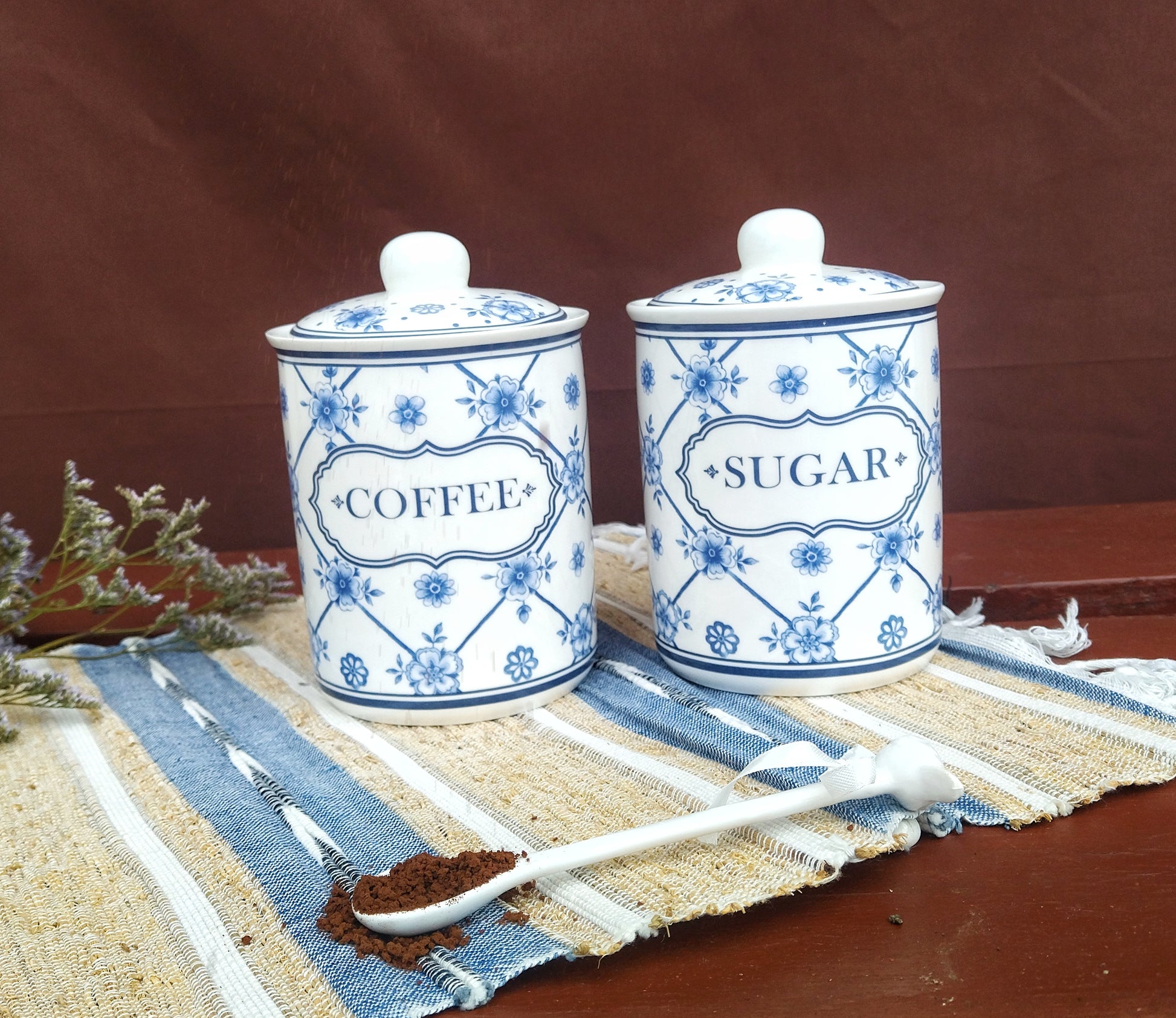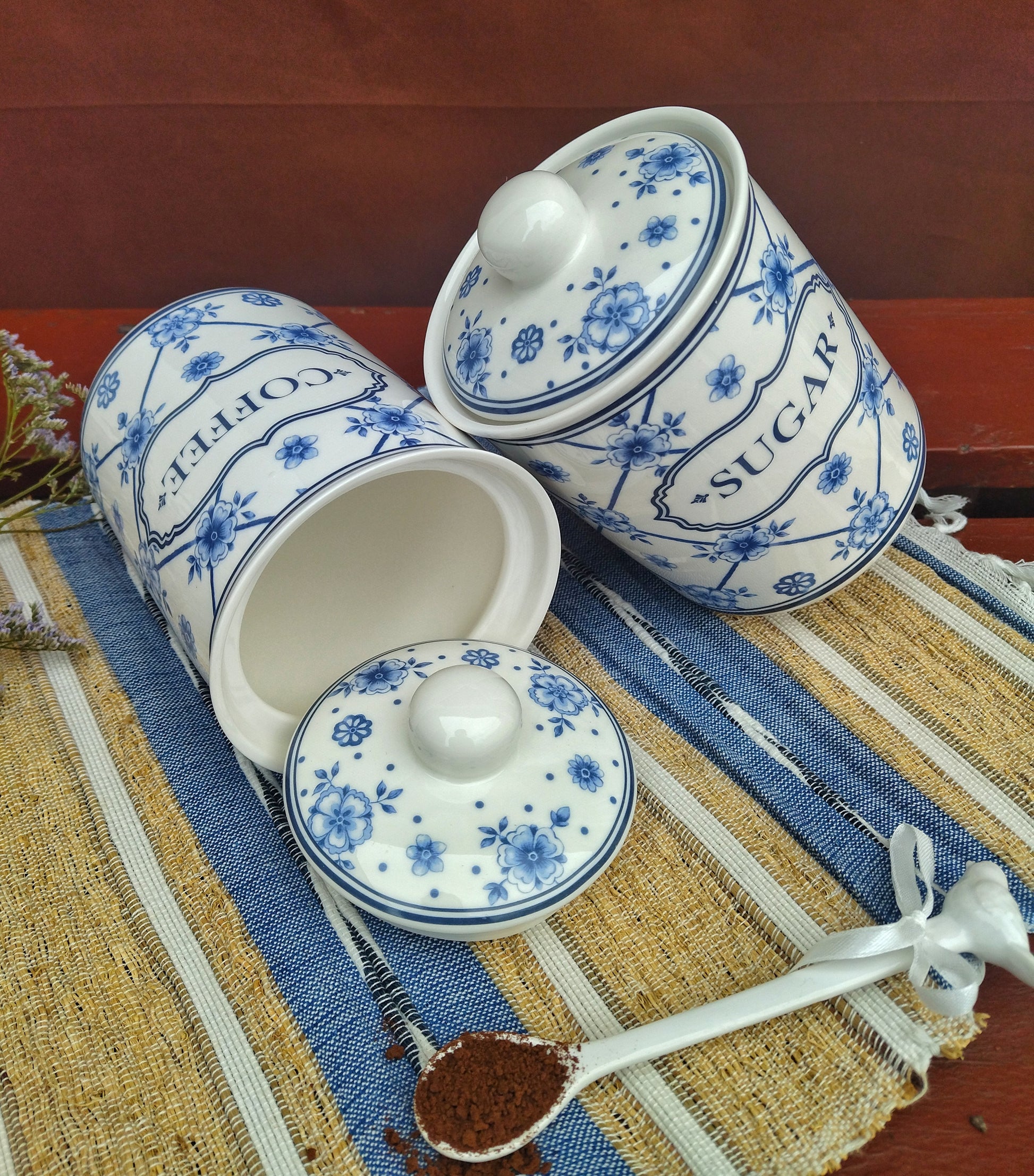Όμορφο κεραμικό σετ για καφέ και ζάχαρη σε 2 μοναδικά σχέδια. Με σιλικόνη στο καπάκι ώστε να κλείνει αεροστεγώς.