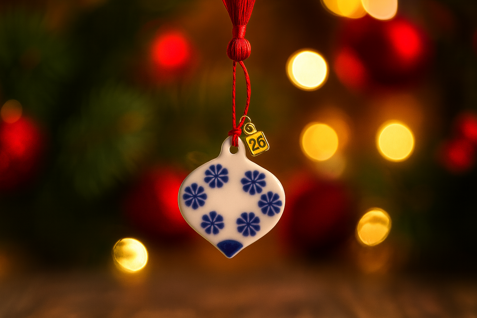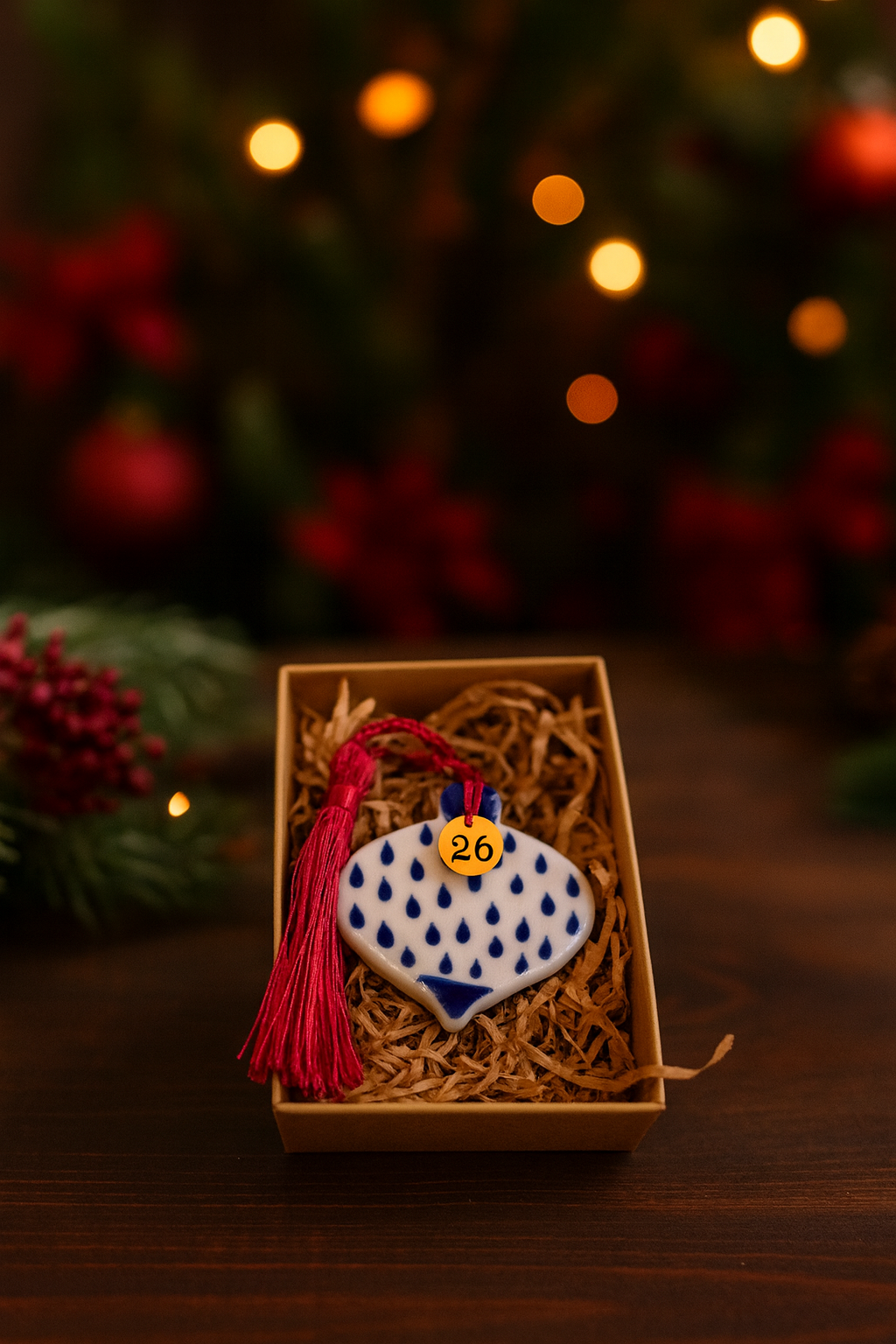 Χαριτωμένη μπαλίτσα από πορσελάνη φτιαγμένη σαν στολίδι για το Χριστουγεννιάτικο σας δέντρο. Σε λευκούς και μπλε χρωματισμούς, ιδανικό μικροδωράκι για τις γιορτές για τις δασκάλες και τους δασκάλους των παιδιών σας. Χρηστικό μιας και τις υπόλοιπες χρονιές μπορείτε απλά να αφαιρέσετε το 26 και να το στολίζετε απλά στο δέντρο σας.