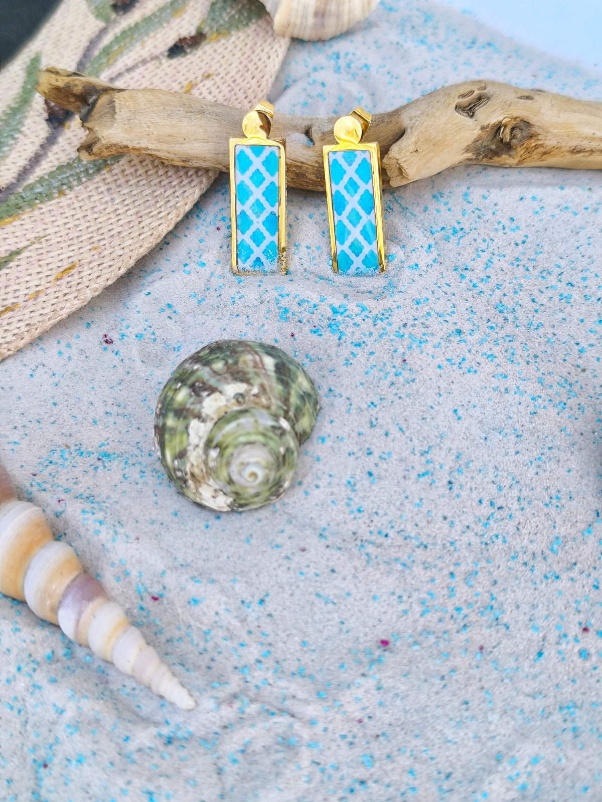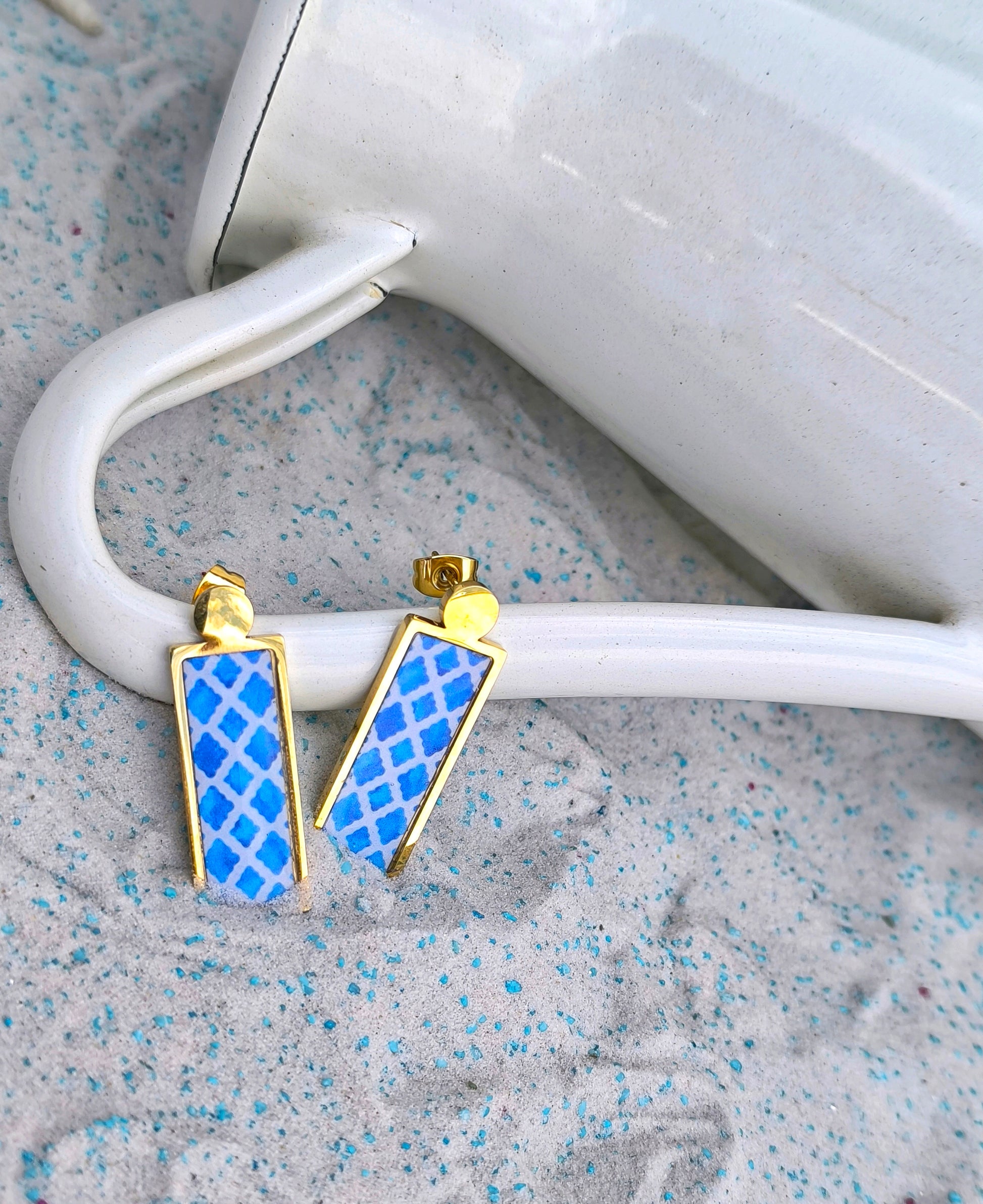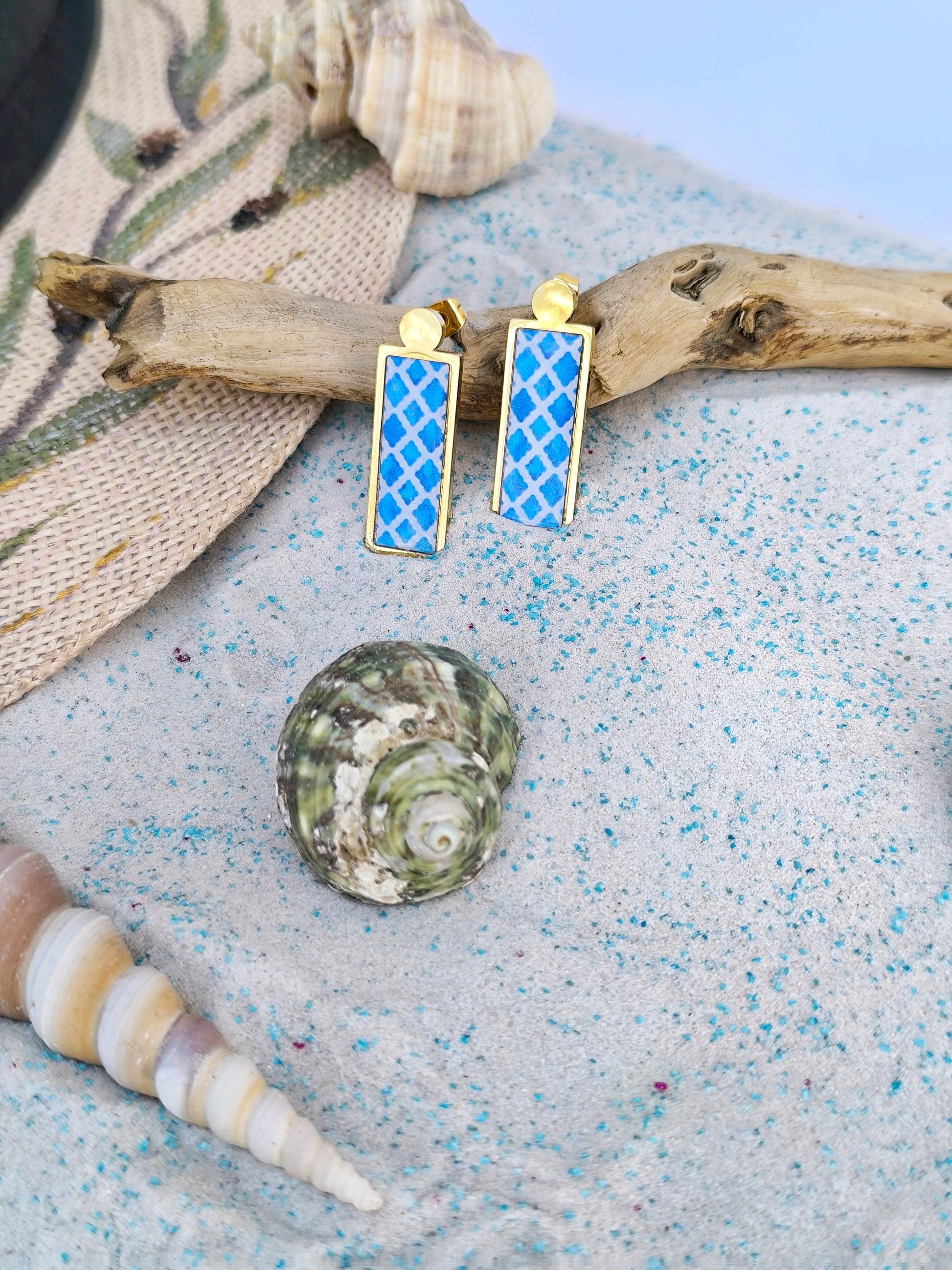 Εμπνευσμένα από την διαχρονική ομορφιά των μεσογειακών πλακιδίων, αυτά τα χειροποίητα σκουλαρίκια σε οριζόντιο σχέδιο συνδυάζουν την παράδοση με τη μοντέρνα κομψότητα. Με κλασικά μπλε και λευκά μοτίβα πάνω σε χρυσό ανοξείδωτο ατσάλι, φέρνουν μαζί τους τη γοητεία της παραλίας και τη νοσταλγία του καλοκαιριού.. Μέρος της συλλογής μας "Τα Παλιά Πλακάκια", ξυπνούν αναμνήσεις από ηλιόλουστες διακοπές, φθαρμένα ψηφιδωτά δάπεδα και μεσογειακά σπίτια γεμάτα ιστορία και συναίσθημα.