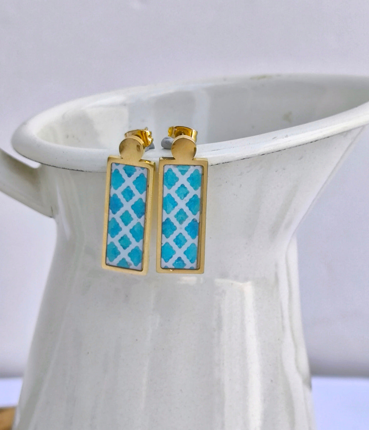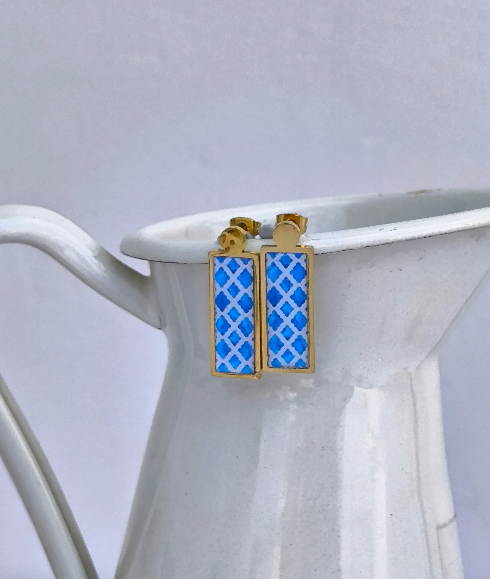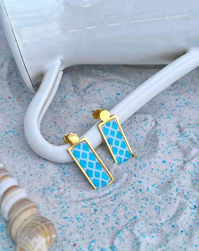 Σκουλαρίκια Πλακάκι με Λευκό και Μπλε ,Επιχρυσωμένα Σκουλαρίκια από Ανοξείδωτο Ατσάλι