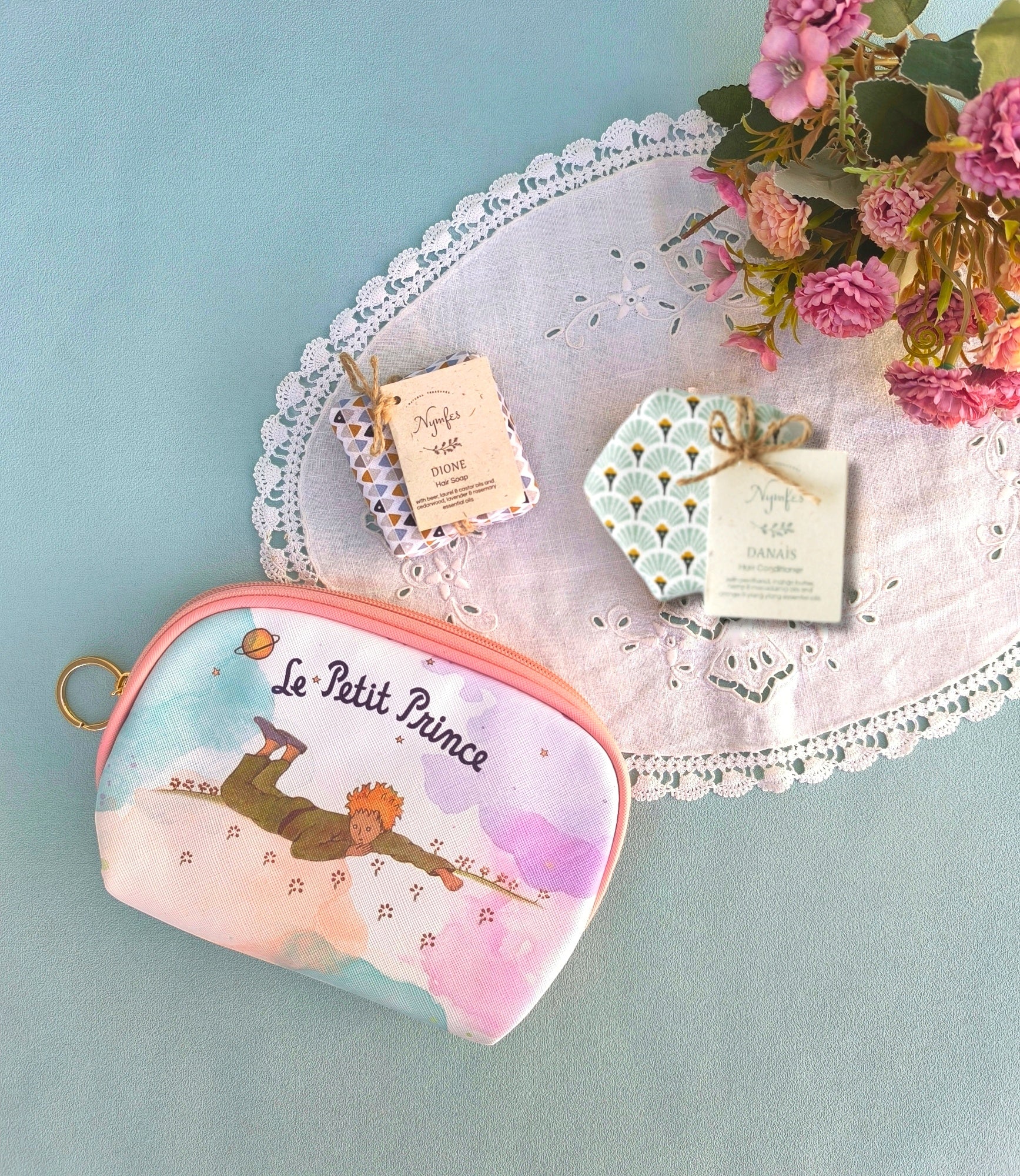 Ένα χαριτωμένο τσαντάκι καλλυντικών με το Μικρό Πρίγκιπα, το οποίο περιλαμβάνει δύο οικολογικά προϊόντα για τα μαλλιά σε στερεή μορφή – ένα σαμπουάν και ένα conditioner. Ιδανικό για καθημερινή χρήση, ταξίδια ή ως ένα ξεχωριστό δώρο. Τα στερεά προϊόντα μαλλιών προσφέρουν φροντίδα υψηλής ποιότητας με σεβασμό στο περιβάλλον, χωρίς πλαστικές συσκευασίες.