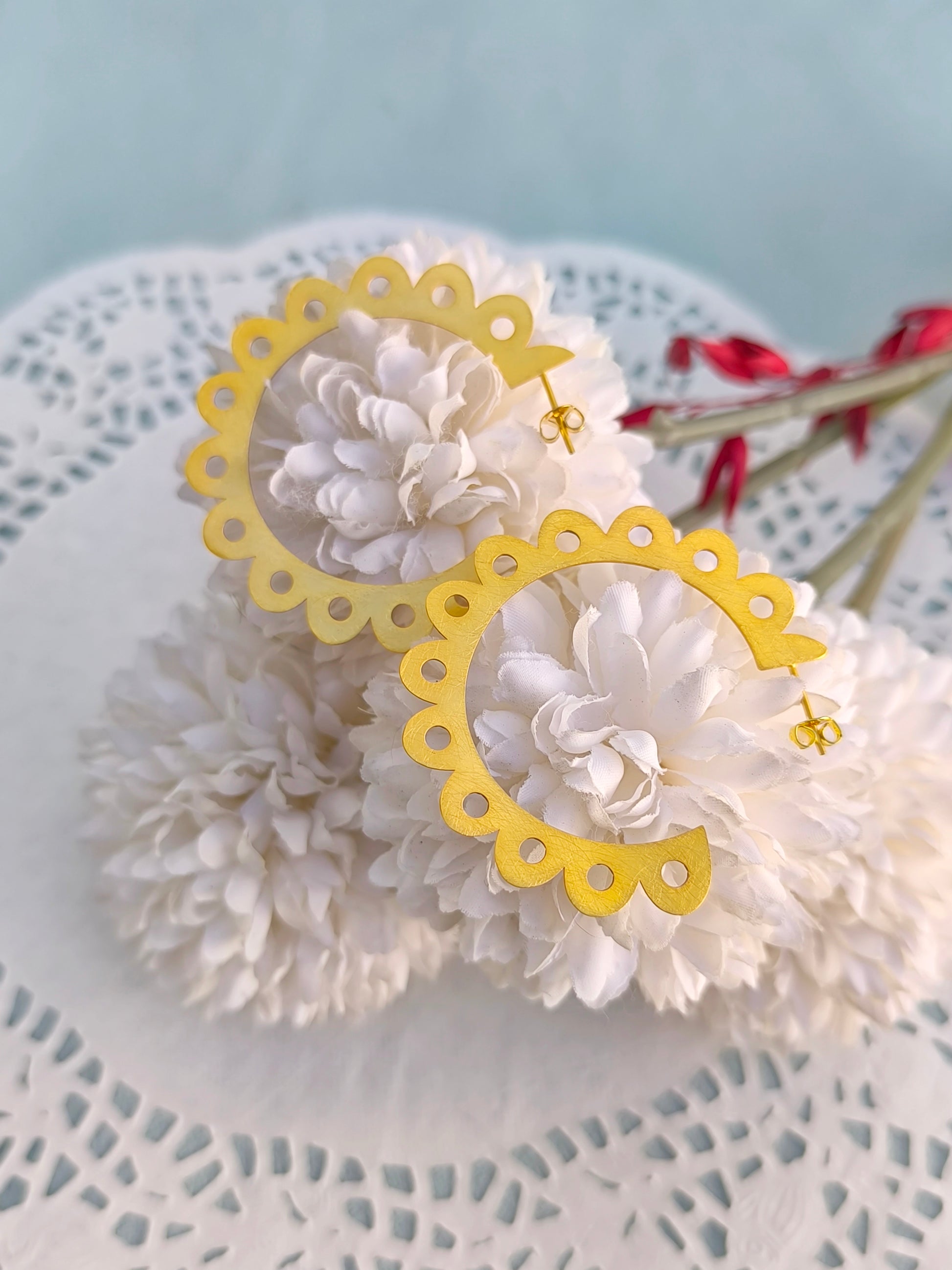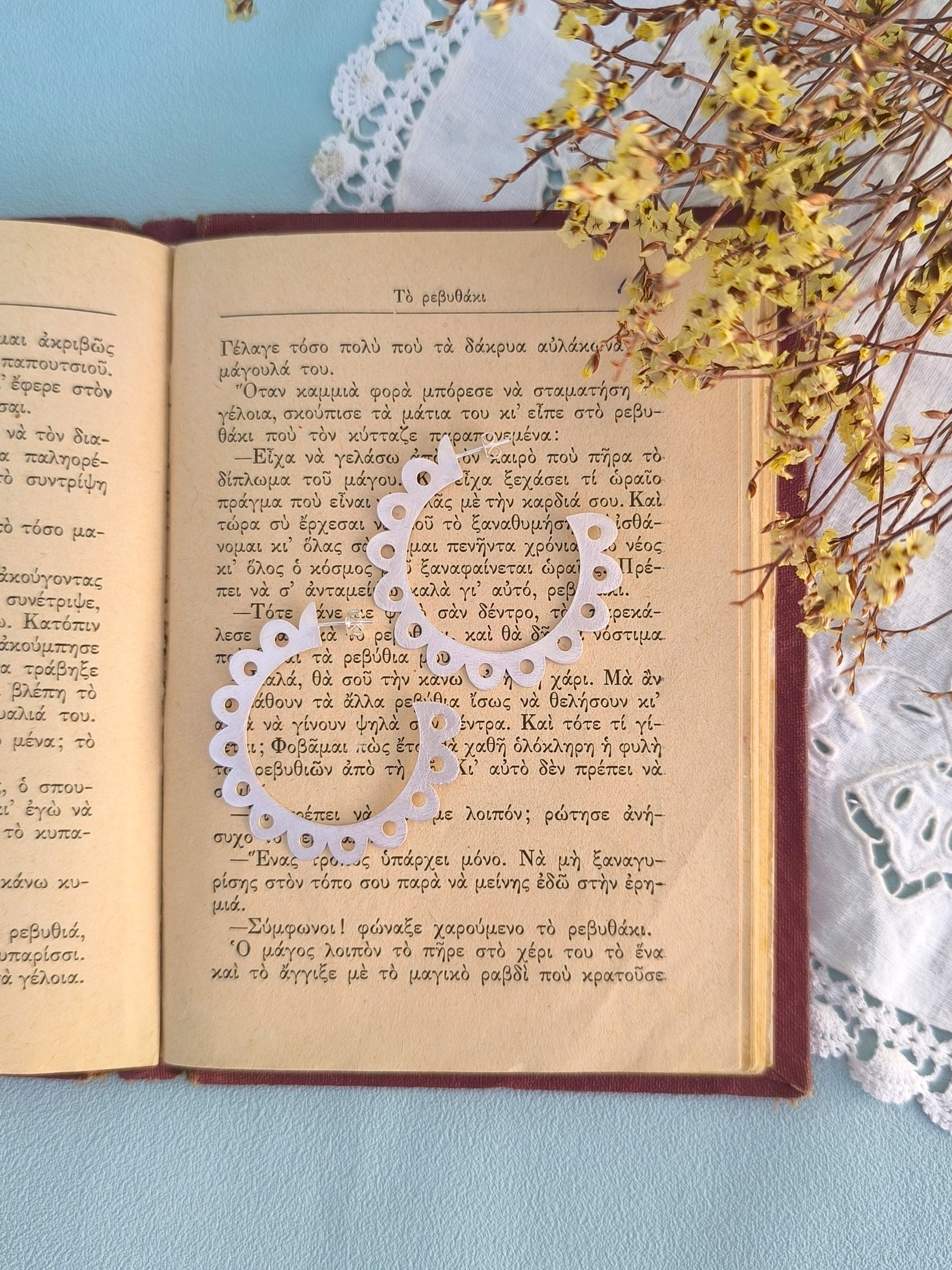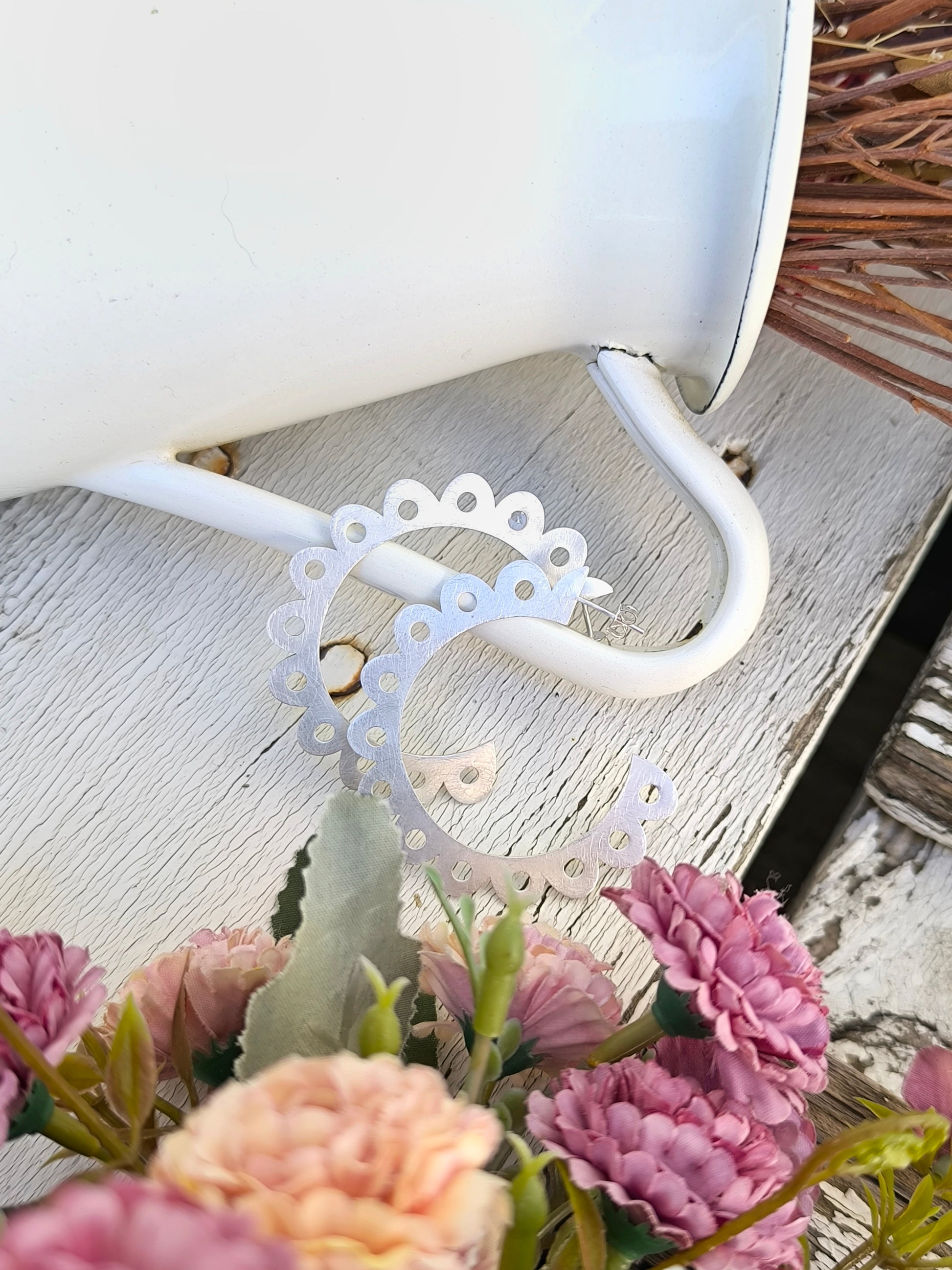 Χρυσοί δαντελωτοί κρίκοι, ένα κομψό και διαχρονικό κόσμημα που συνδυάζει την απλότητα με τη boho chic αισθητική. Με διάμετρο περίπου 5 εκατοστά, αποτελούν την ιδανική επιλογή για καθημερινές αλλά και πιο ιδιαίτερες εμφανίσεις. Το μοναδικό τους σχέδιο, εμπνευσμένο από λεπτομέρειες δαντέλας, προσθέτει θηλυκότητα και χαρακτήρα σε κάθε look. Διατίθενται σε χρυσό και ματ ασημί φινίρισμα, ώστε να επιλέξεις αυτό που ταιριάζει στο προσωπικό σου στυλ. Με μια στρώση βερνικιού από πάνω για να προστατεύει το χρώμα από την υγρασία.