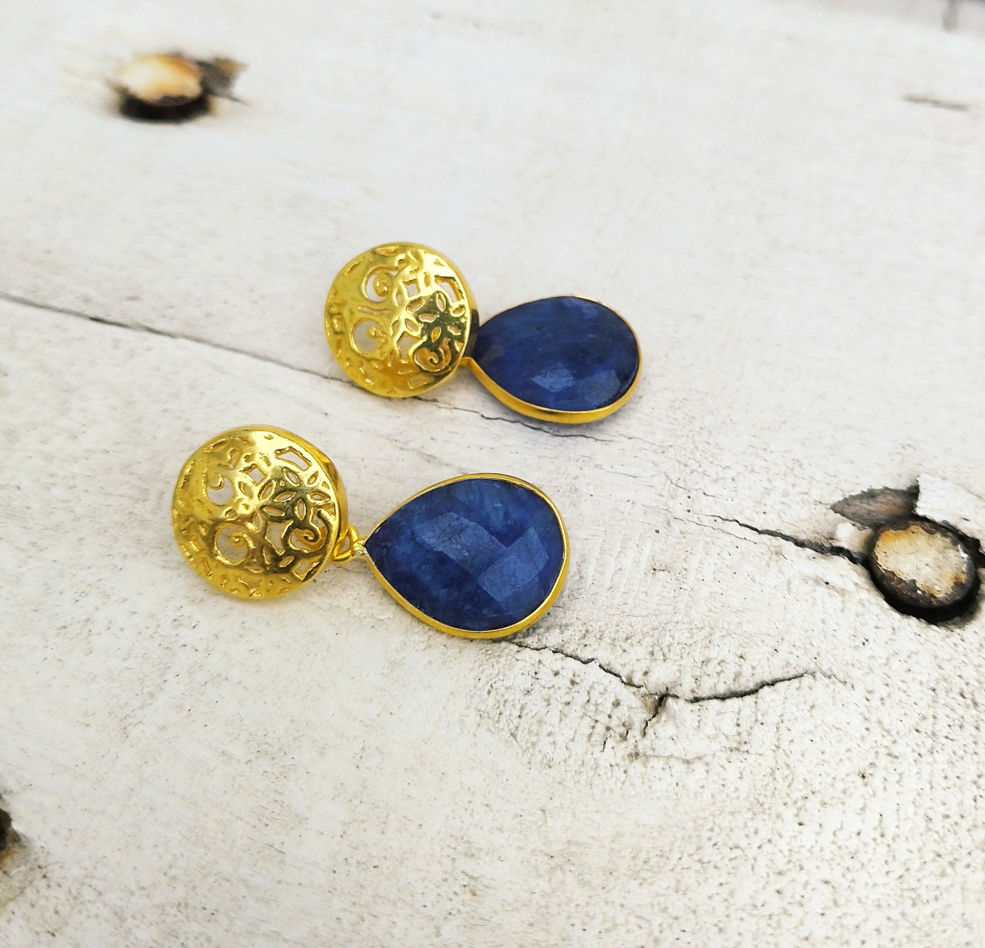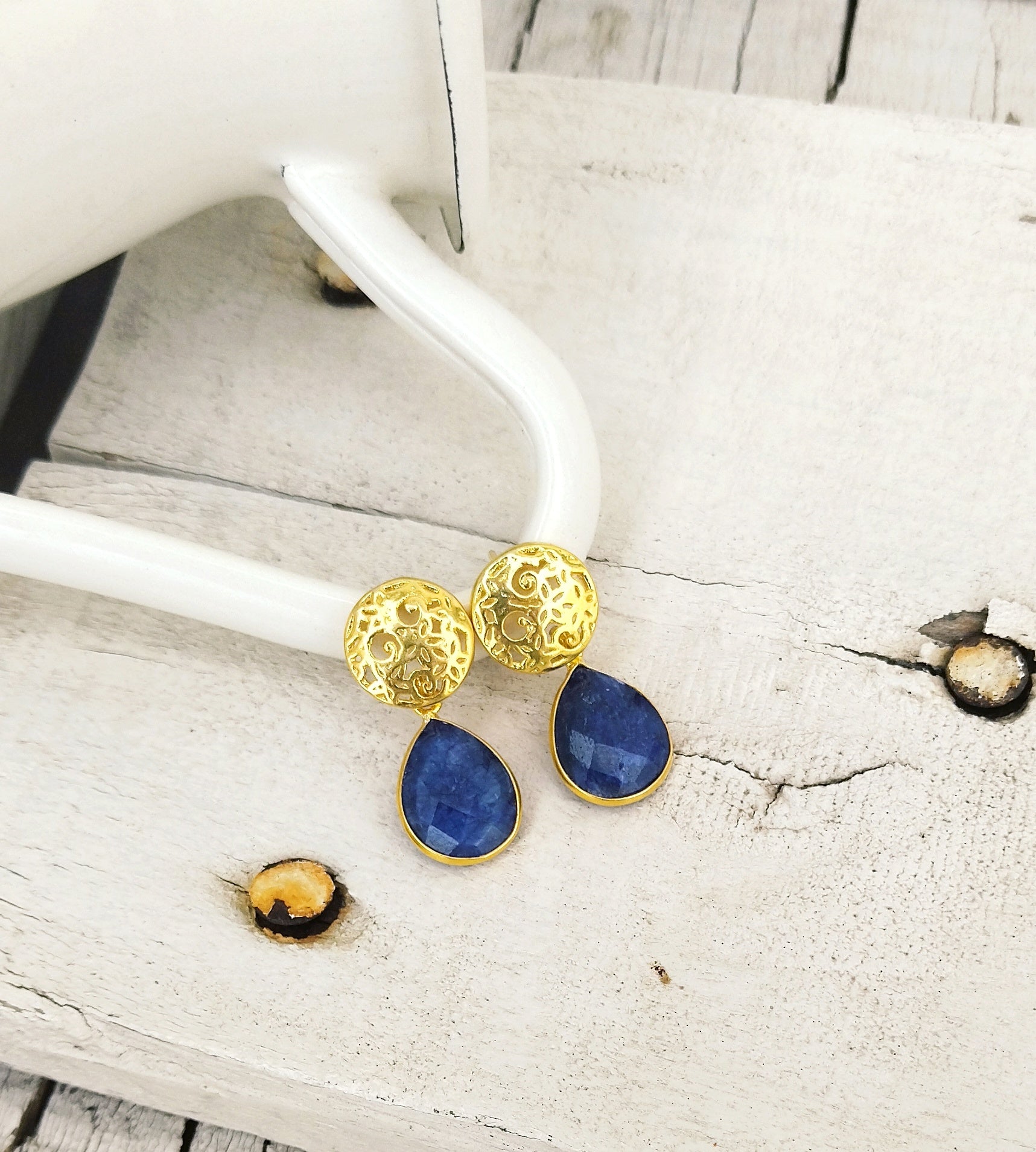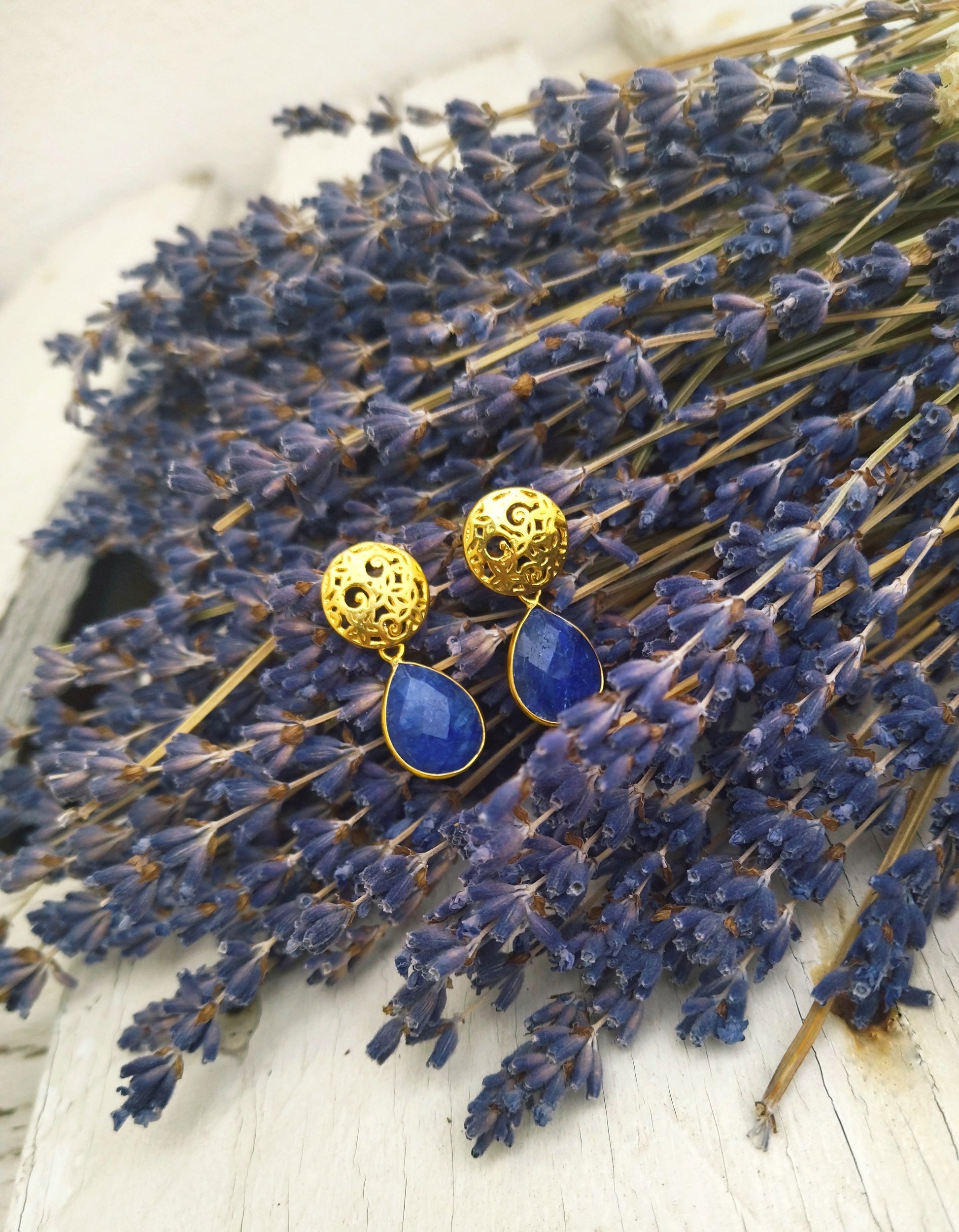Μοναδικής τεχνικής σκουλαρίκια, επιχρυσωμένα με 22 καράτια χρυσό. Φτιαγμένα με παραδοσιακές τεχνικές δημιουργίας βυζαντινών κοσμημάτων. Ένα ζευγάρι δαντελωτών δακρύων με πέτρες λάπις, φτιαγμένο ειδικά για γυναίκες δυνατές, με αυξημένη συναισθηματική νοημοσύνη...