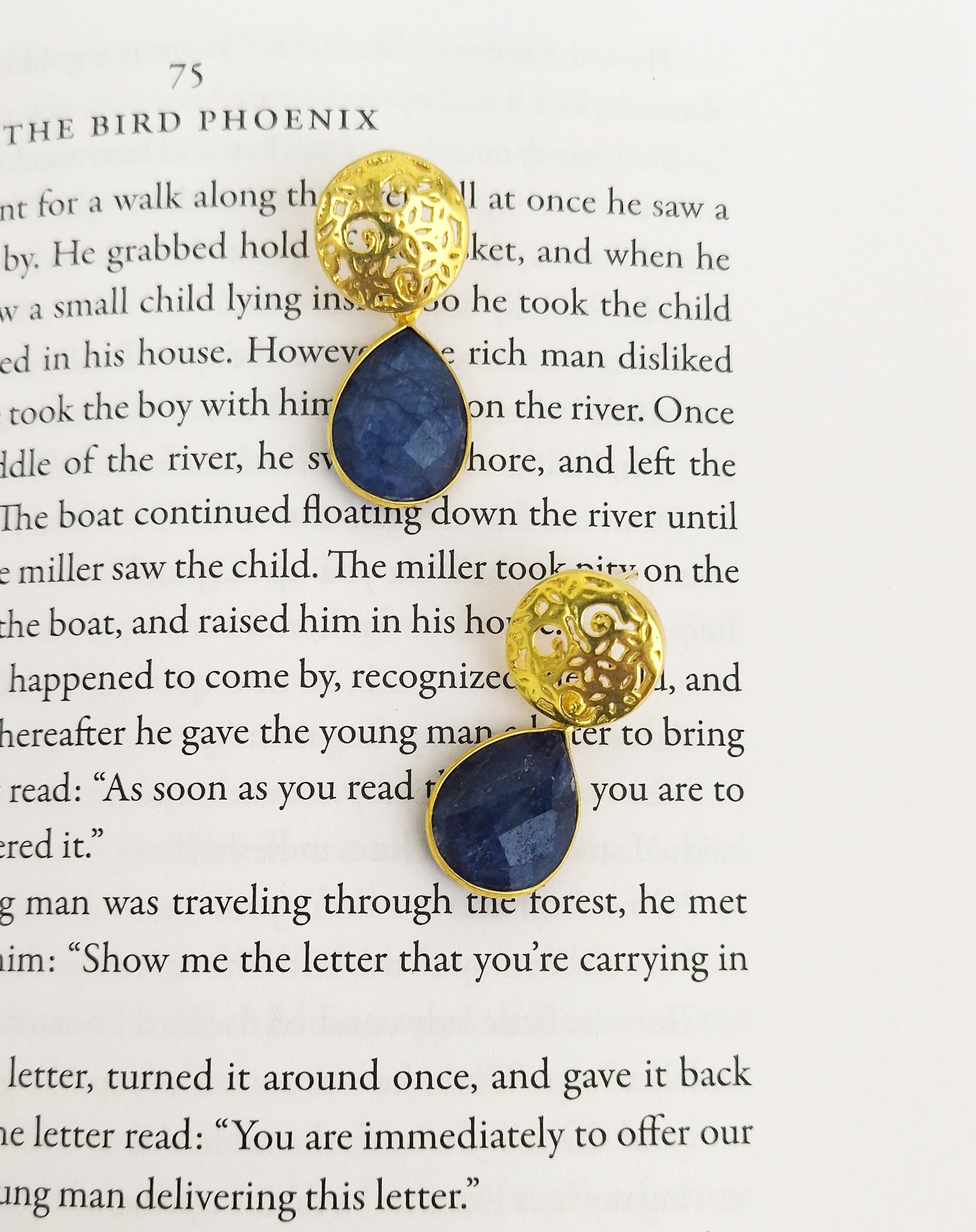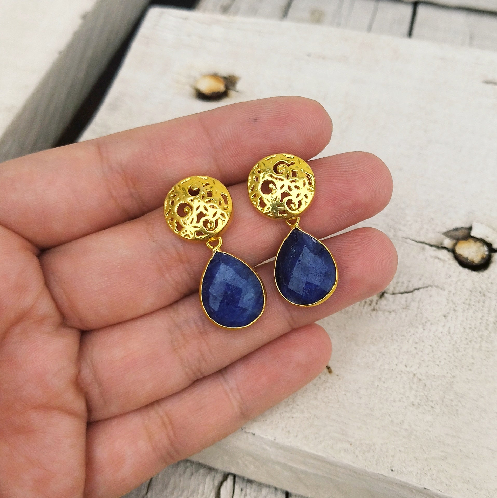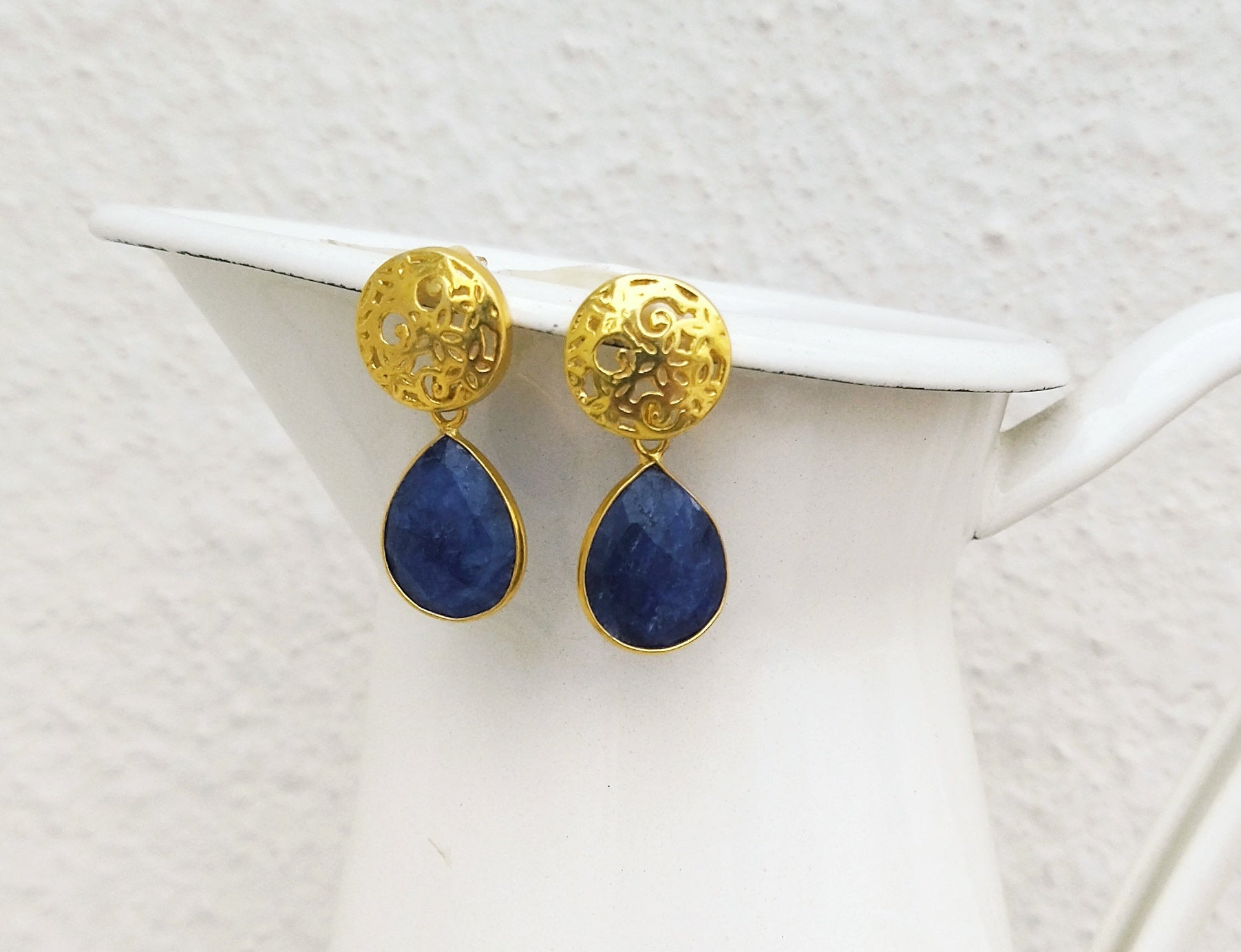 Μοναδικής τεχνικής σκουλαρίκια, επιχρυσωμένα με 22 καράτια χρυσό. Φτιαγμένα με παραδοσιακές τεχνικές δημιουργίας βυζαντινών κοσμημάτων. Ένα ζευγάρι δαντελωτών δακρύων με πέτρες λάπις, φτιαγμένο ειδικά για γυναίκες δυνατές, με αυξημένη συναισθηματική νοημοσύνη...