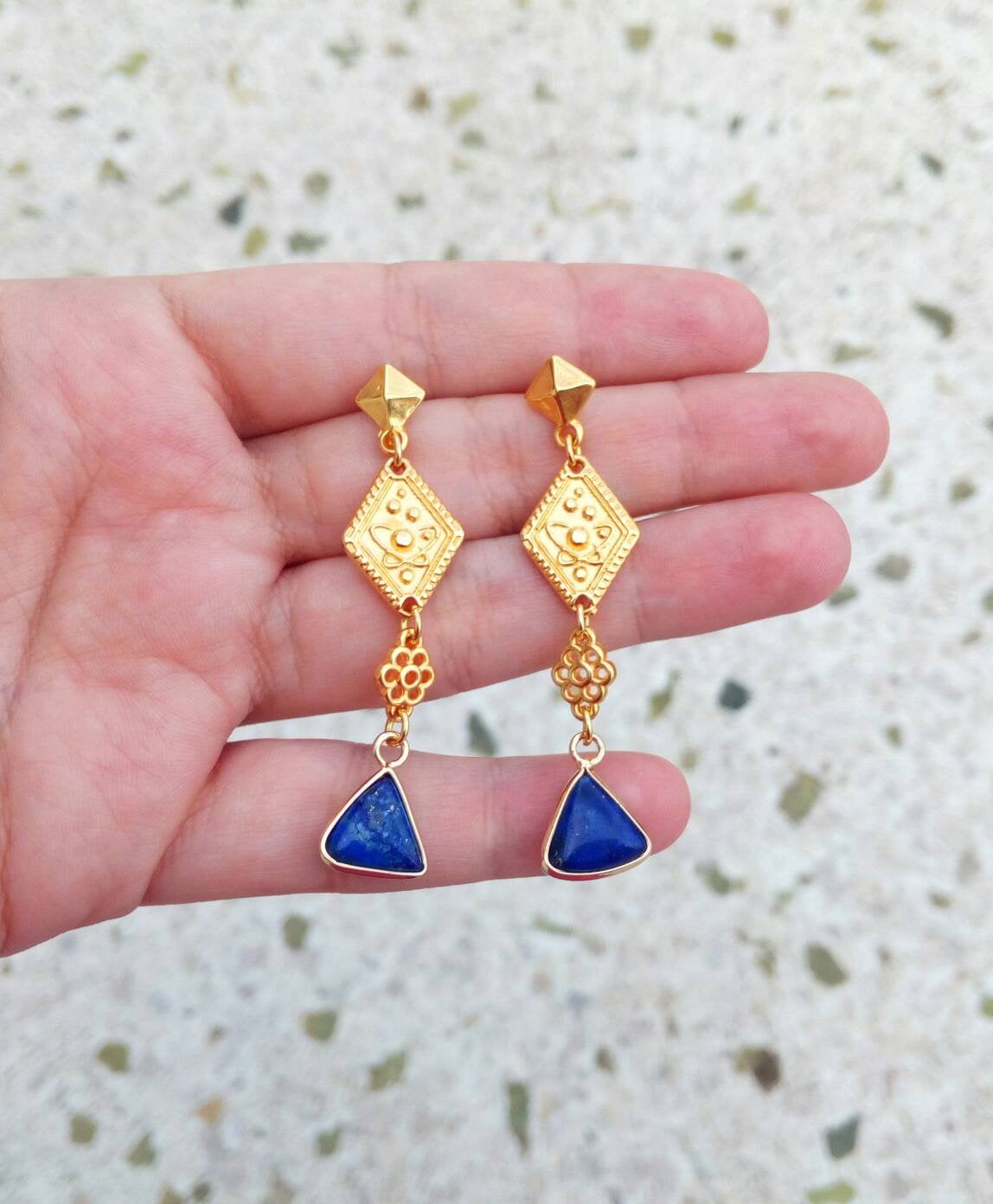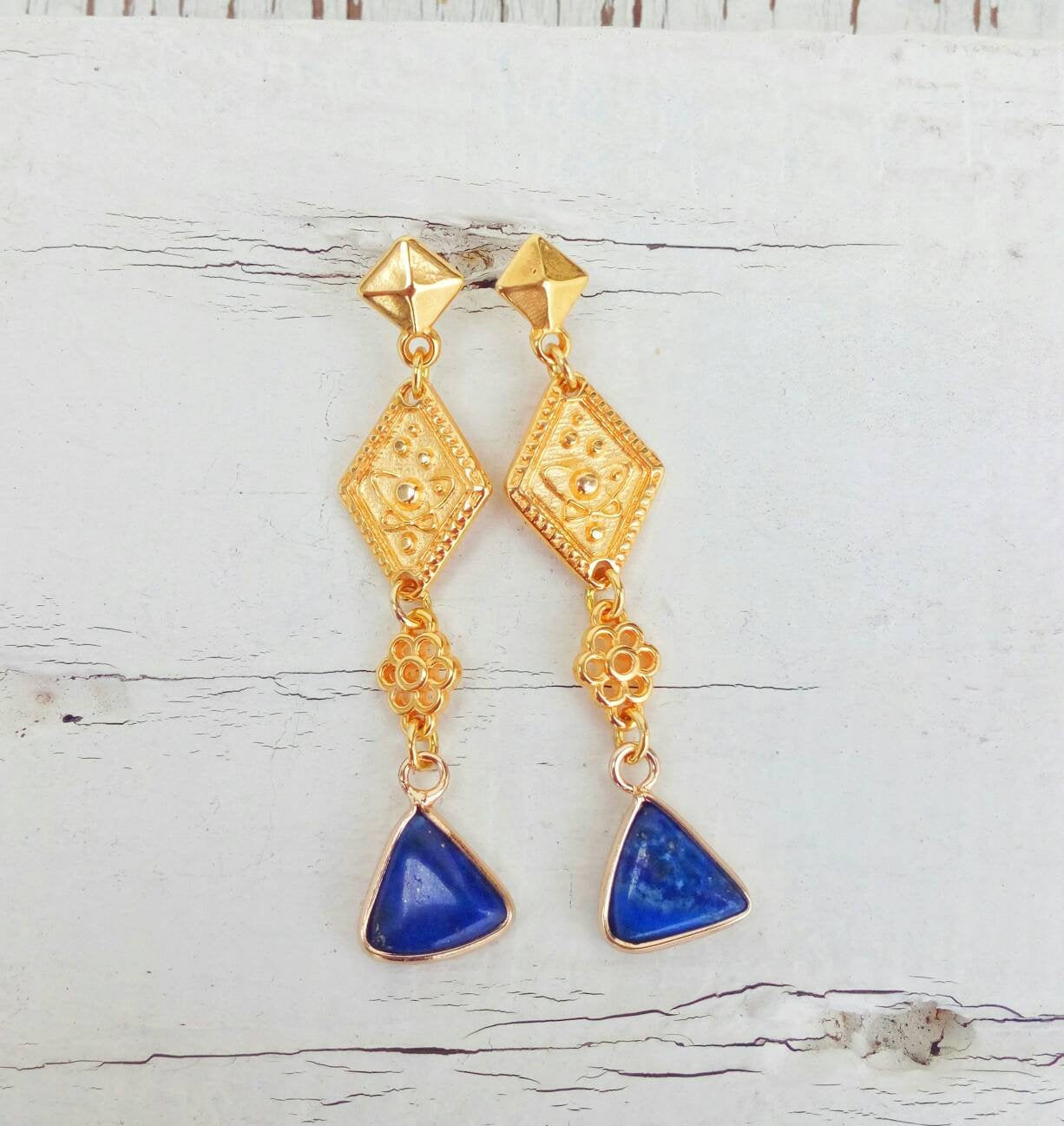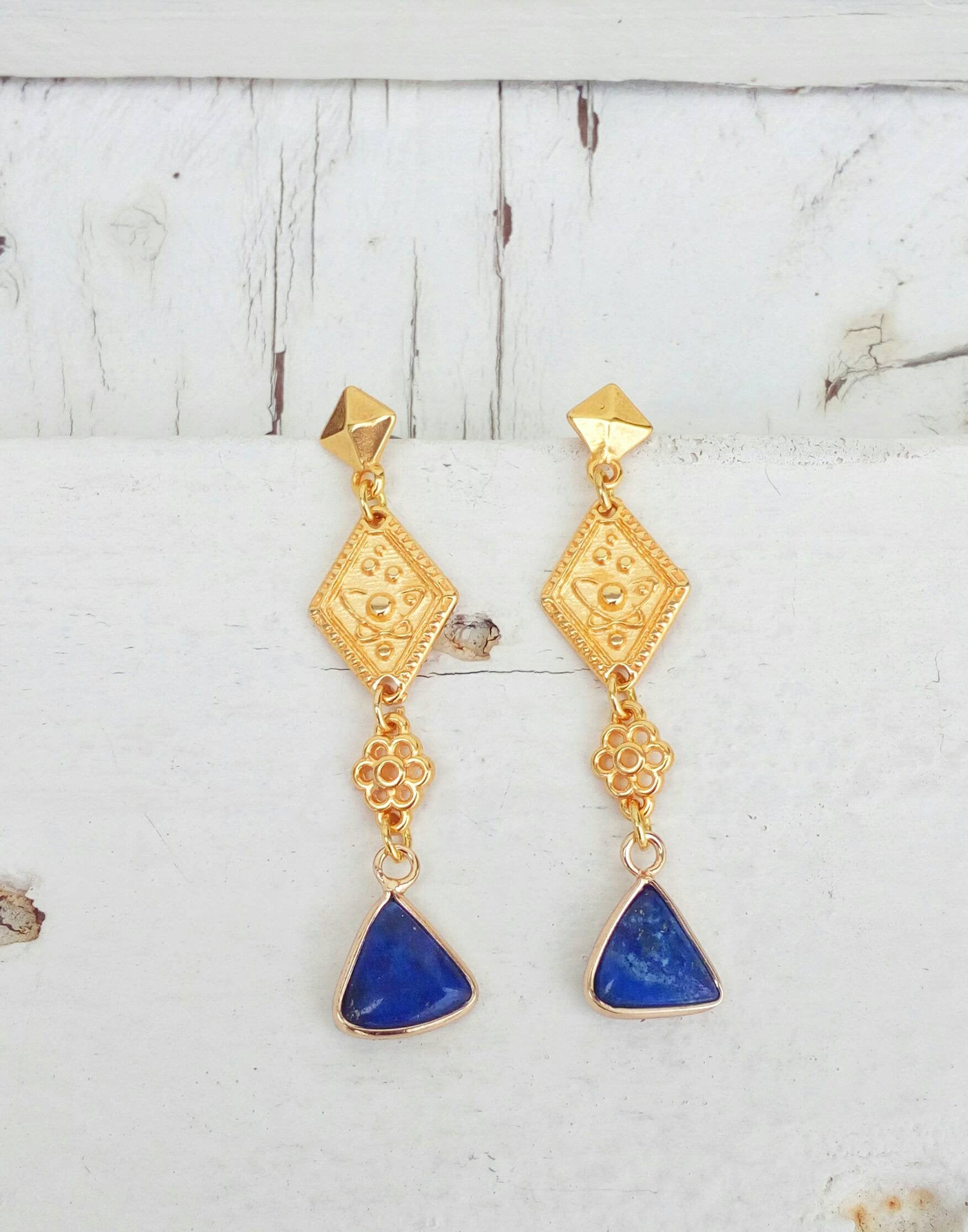 Σκουλαρίκια με ημιπολύτιμες πέτρες λάπις σε 22Κ επιχρυσωμένο μπρούτζο. Ένα υπέροχο κόσμημα σε βυζαντινό στυλ με μια ρομαντική πινελιά...