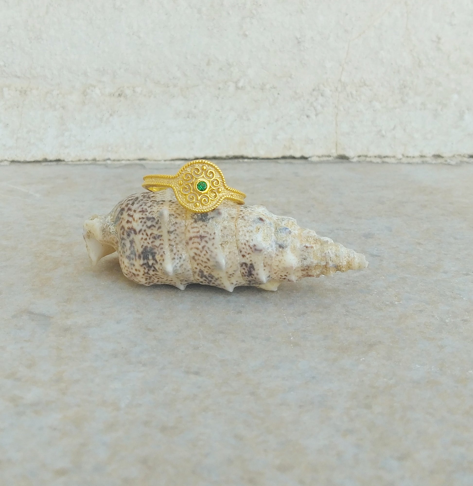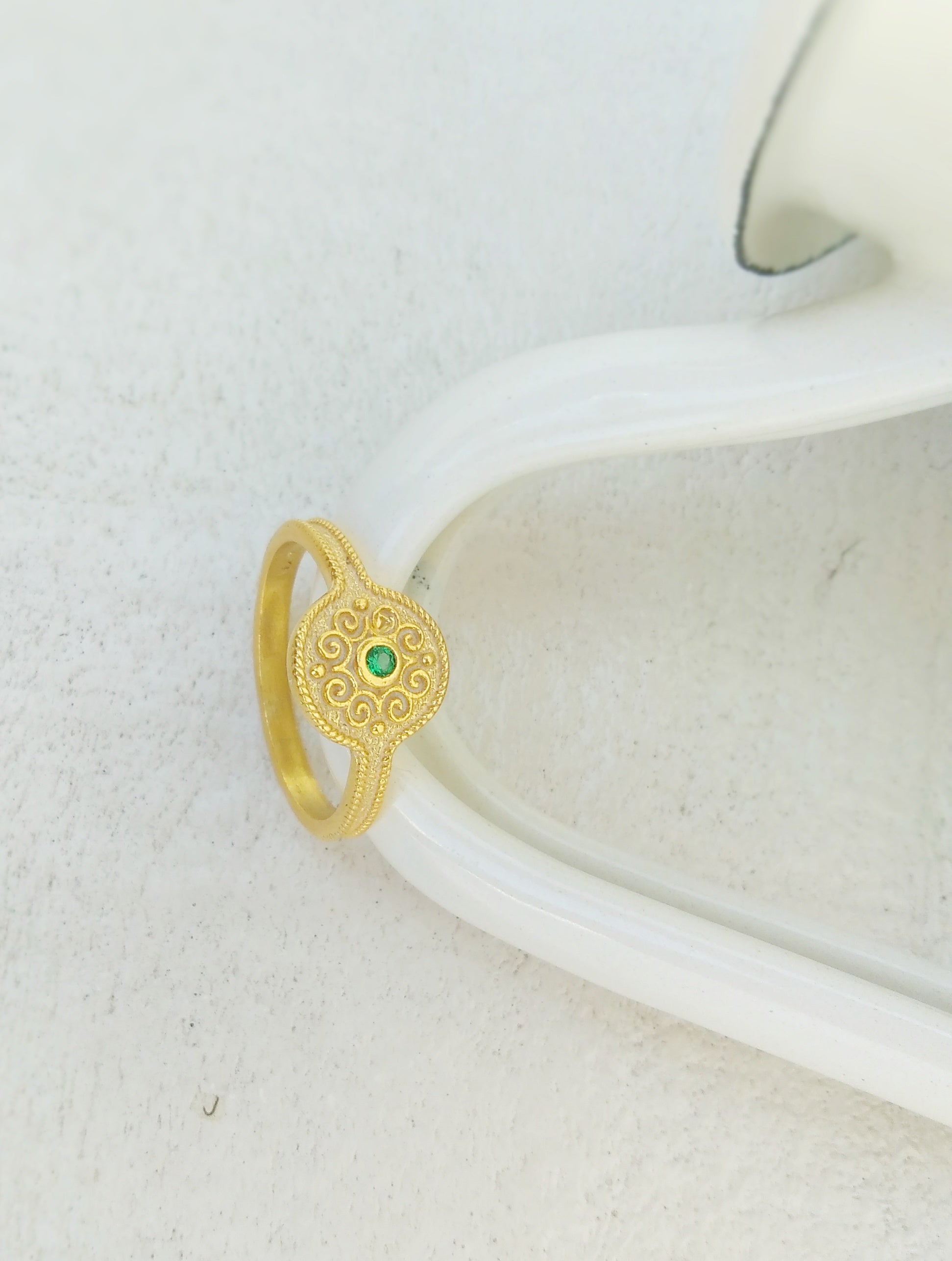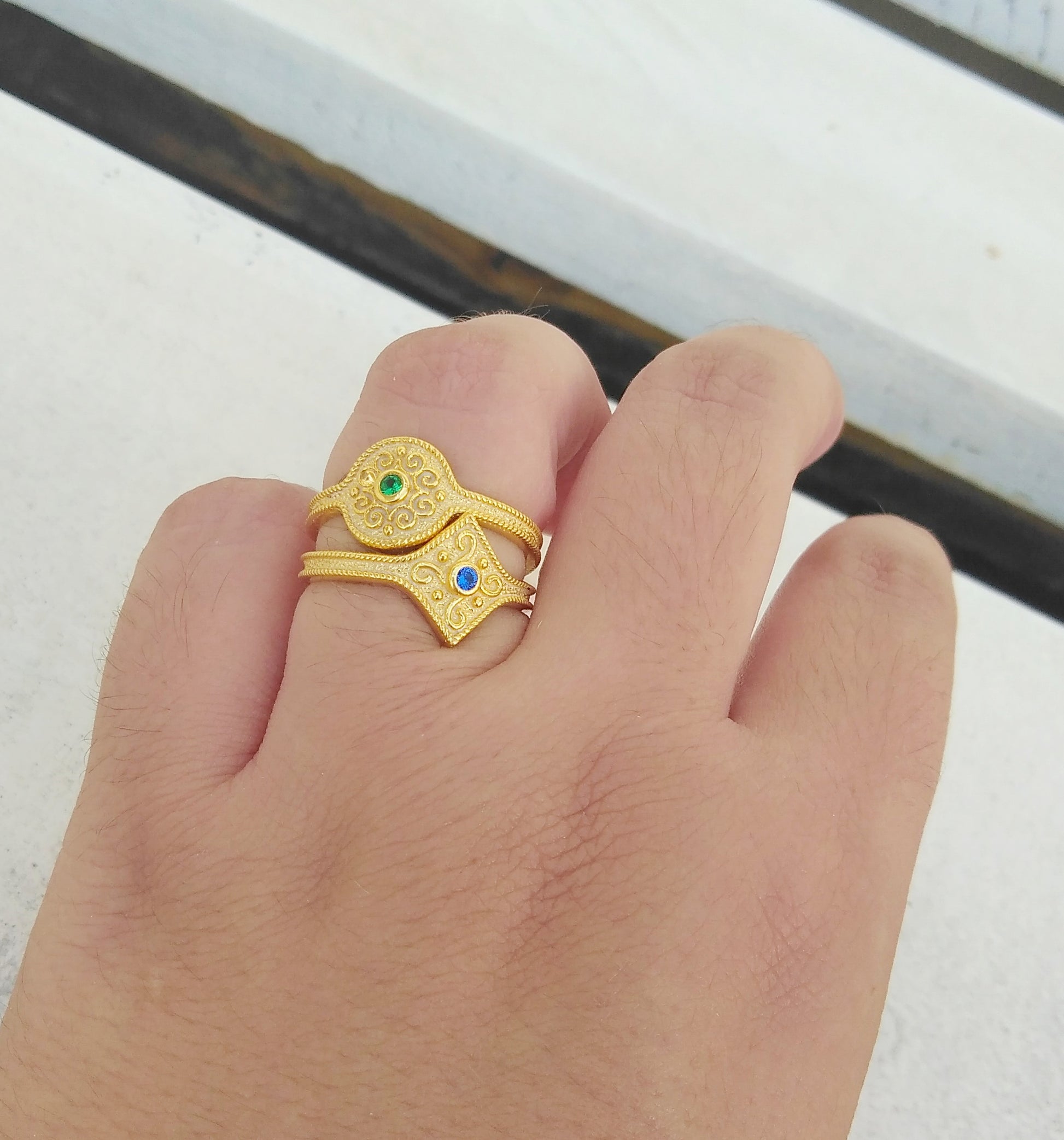 22Κ επίχρυσο δαχτυλίδι φτιαγμένο από ασήμι 925.Ένα μοναδικό κόσμημα βυζαντινής τέχνης! Ντελικάτο και εντυπωσιακό ταυτόχρονα, συνδυάζεται άνετα σε κάθε ώρα της ημέρας. Με χρωματιστό ζιρκόν στο κέντρο.