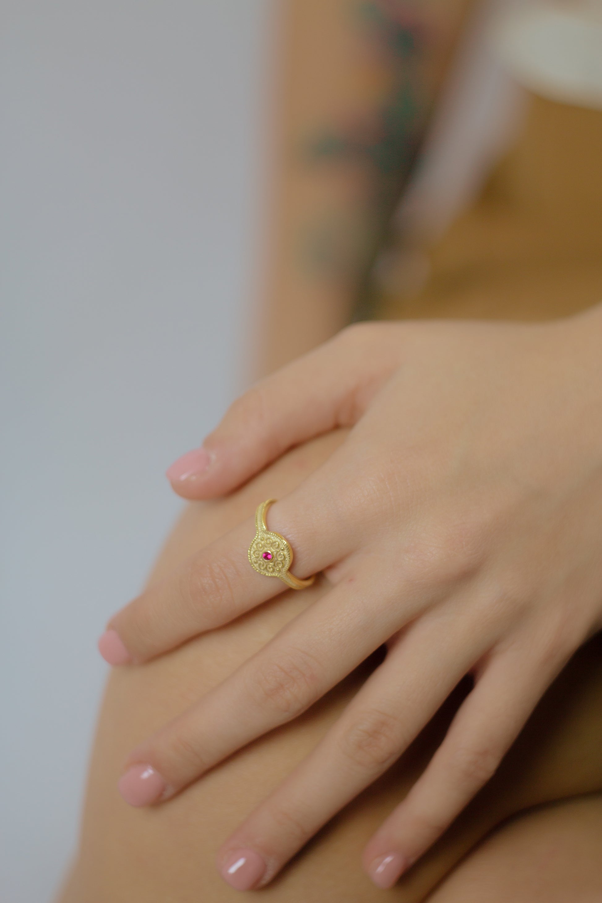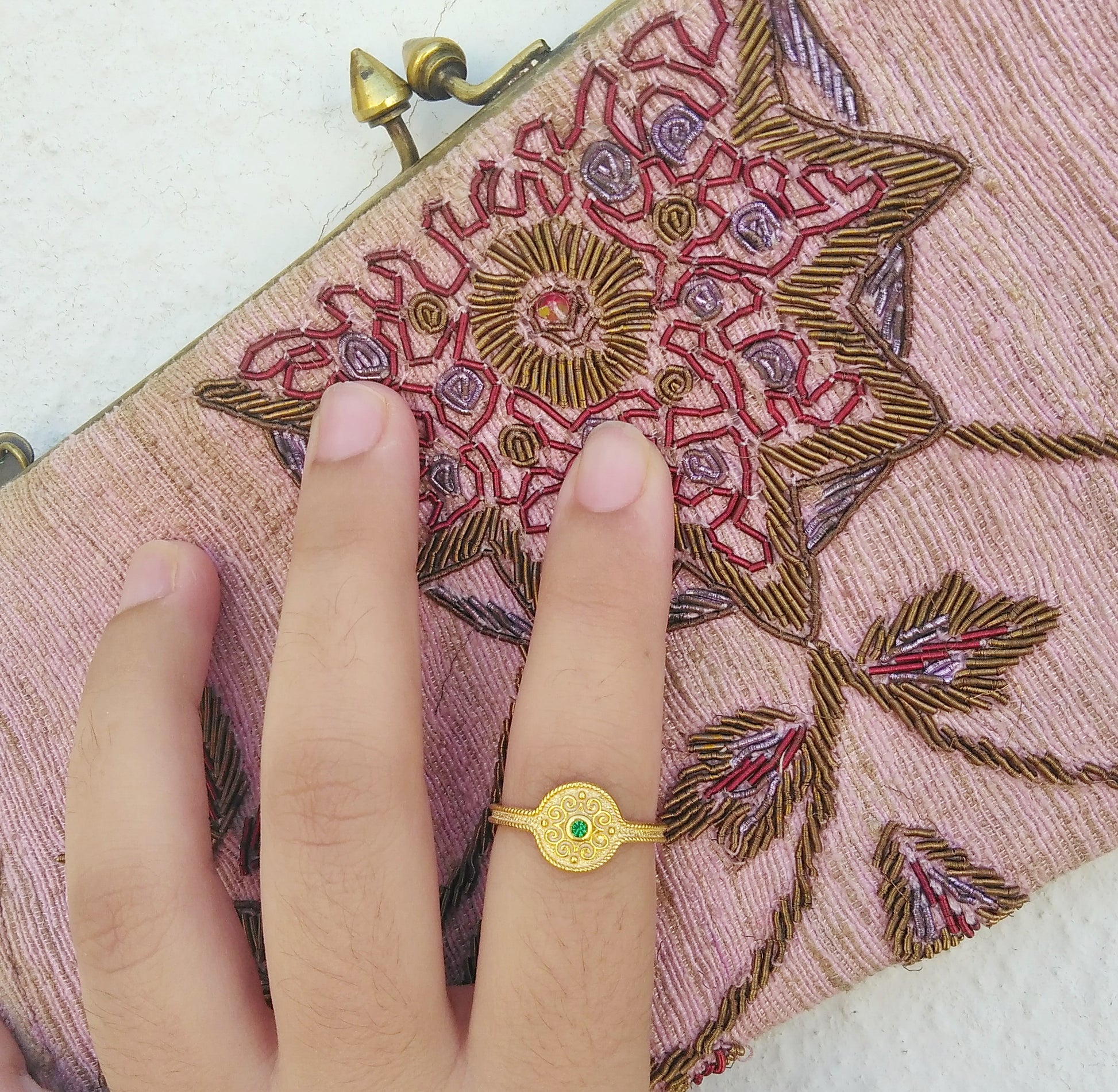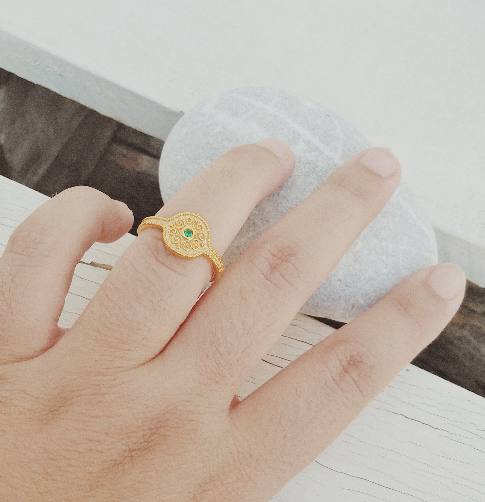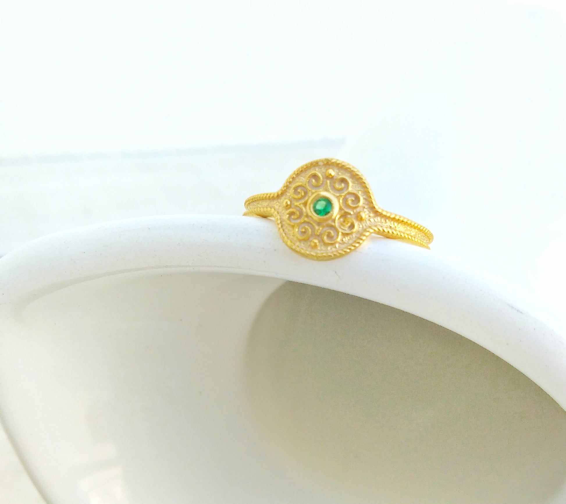 22Κ επίχρυσο δαχτυλίδι φτιαγμένο από ασήμι 925.Ένα μοναδικό κόσμημα βυζαντινής τέχνης! Ντελικάτο και εντυπωσιακό ταυτόχρονα, συνδυάζεται άνετα σε κάθε ώρα της ημέρας. Με χρωματιστό ζιρκόν στο κέντρο.