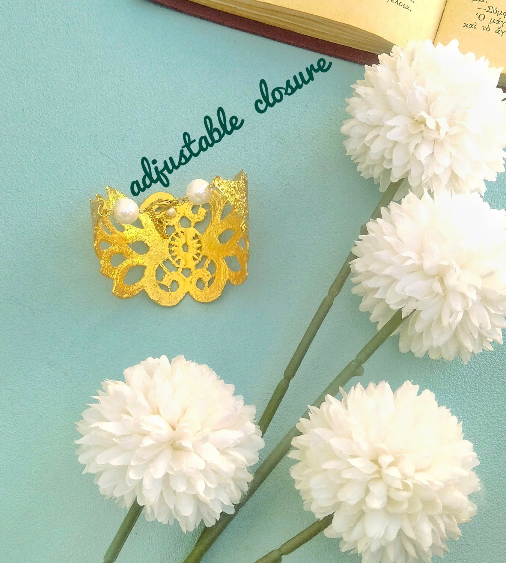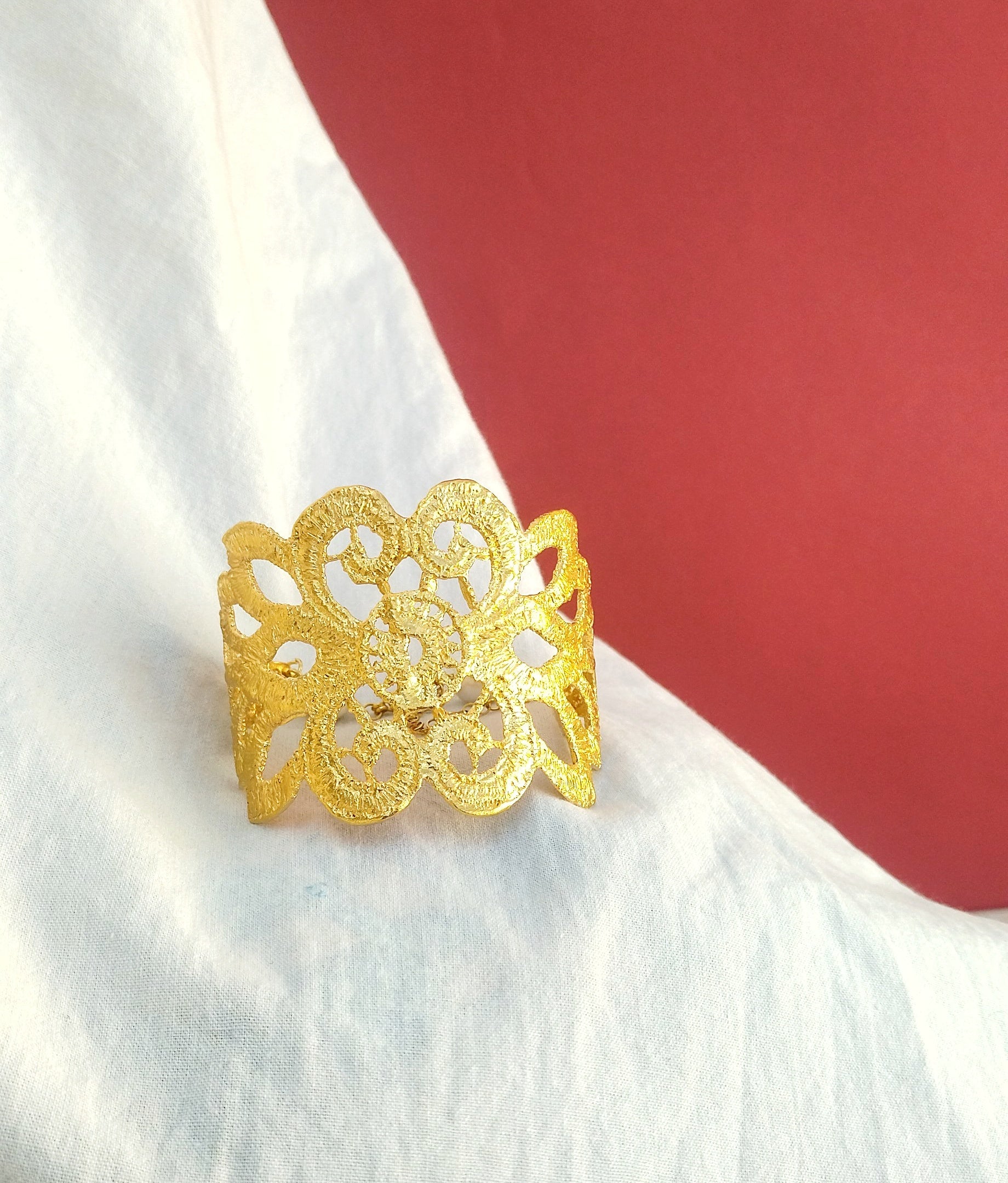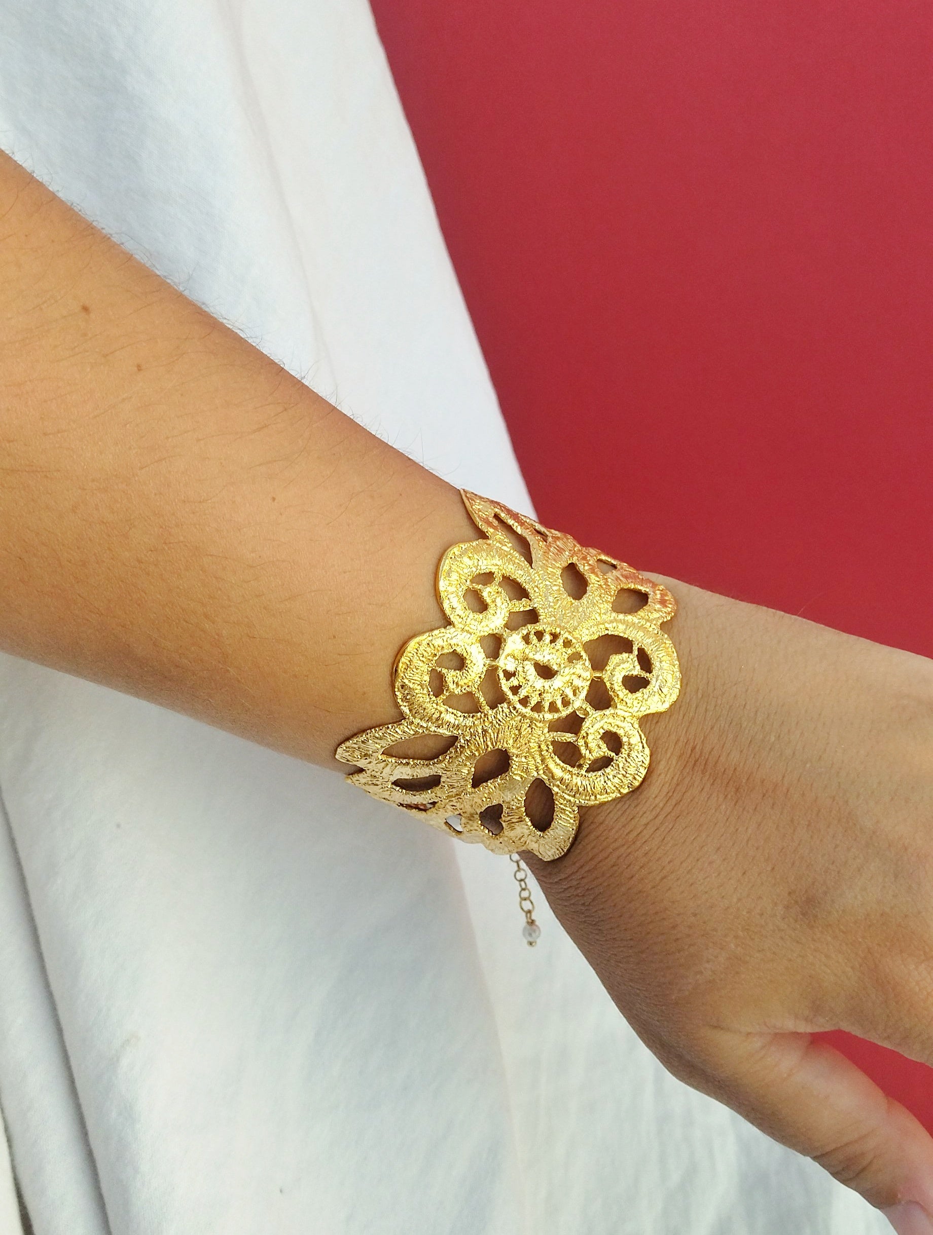 Το δαντελωτό μας βραχιόλι είναι βγαλμένο μέσα από την ελληνική μας παράδοση. Φτιαγμένο από ορείχαλκο, επιχρυσωμένο με 24 καράτια χρυσό και διακοσμημένο με πέρλες. Εμπνευσμένο από τα σεμεδάκια και τα κεντήματα της μαμάς τα οποία πάντα με μάγευαν. Τόση προσοχή στη λεπτομέρεια, τόση ομοιομορφία, σαν κύματα από κλωστές! Θέλοντας λοιπόν να τιμήσουμε αυτή την δεξιοτεχνία μαζί με την αγαπημένη Effie Smyri, δώσαμε νέα ζωή στα σεμεδάκια της μαμάς και της γιαγιάς.