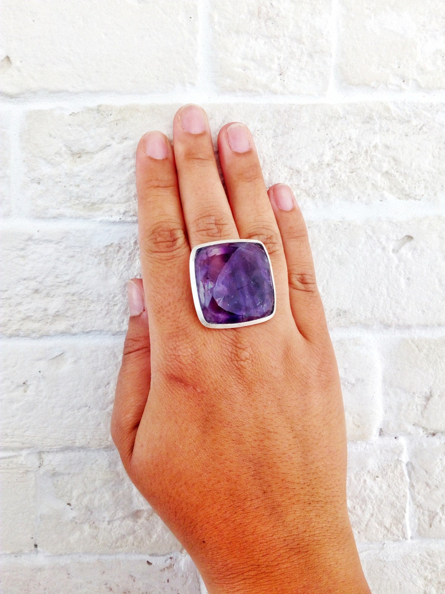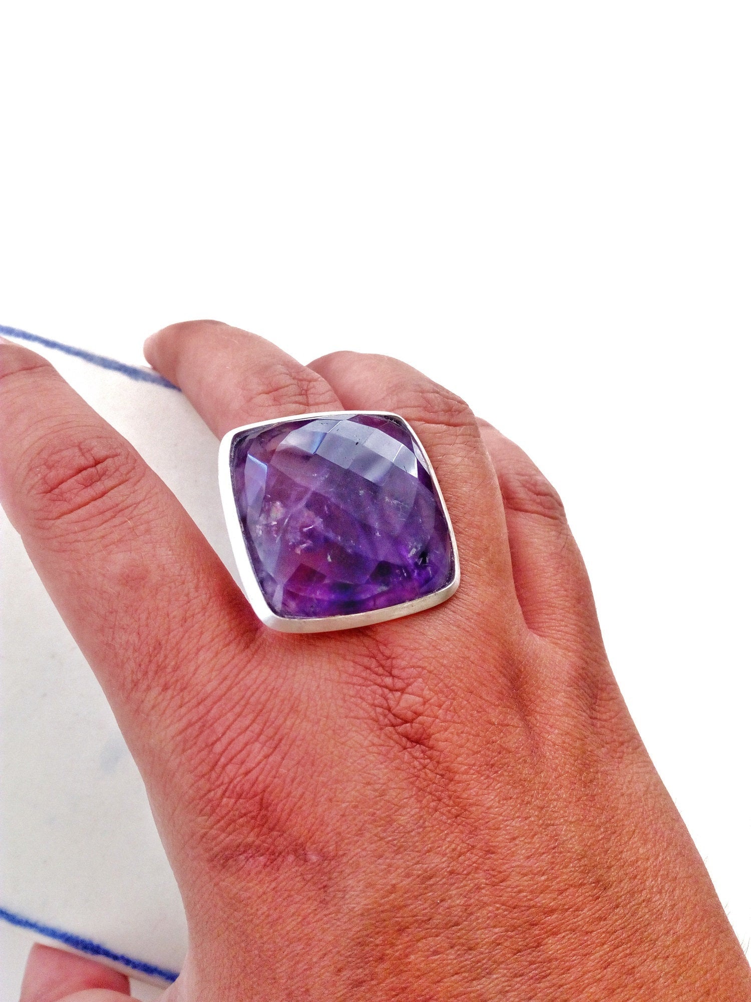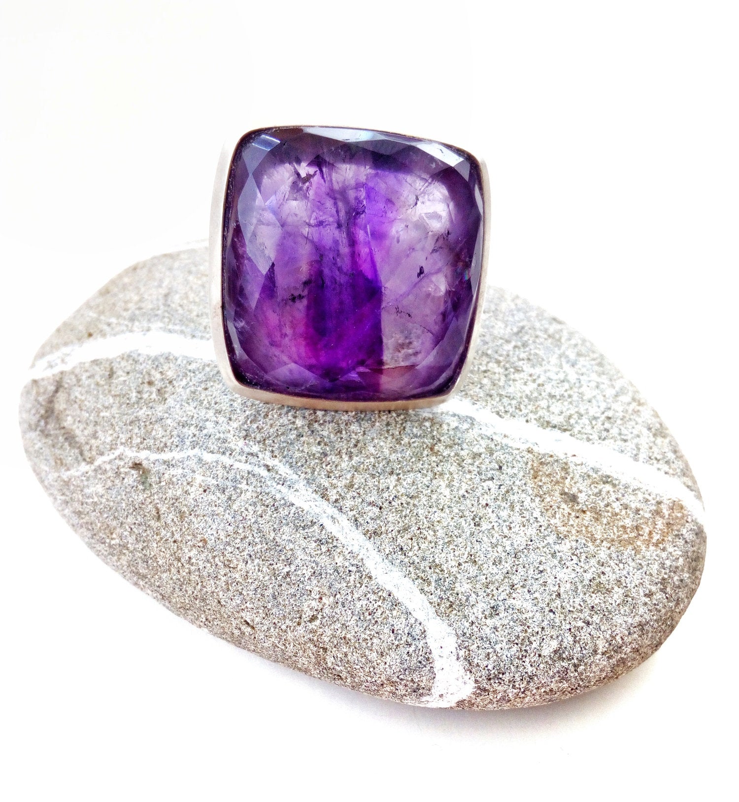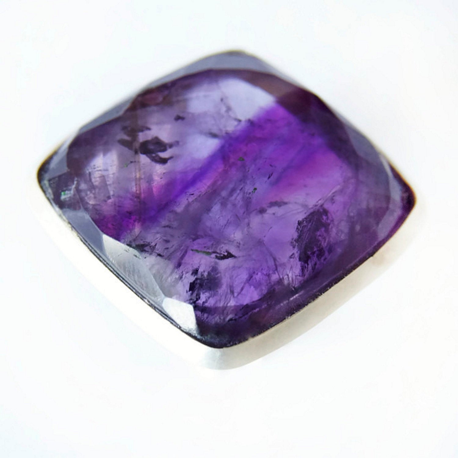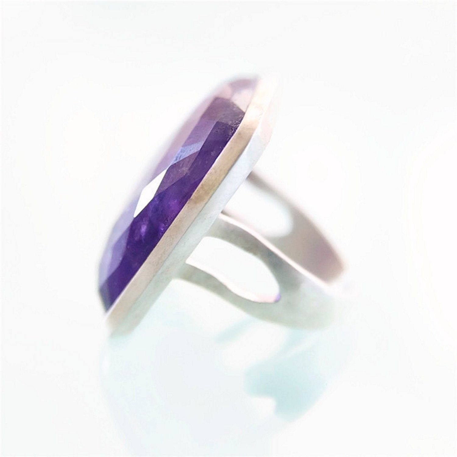 Υπέροχο δαχτυλίδι από μασίφ ασήμι. Μια μεγάλη ημιπολύτιμη πέτρα αμέθυστου 8.55 καρατίων δεσπόζει στο κέντρο του. Ανοιχτό στο πίσω μέρος ώστε το φώς να διαπερνάει την πέτρα και να δημιουργεί διαφορετικές αποχρώσεις.