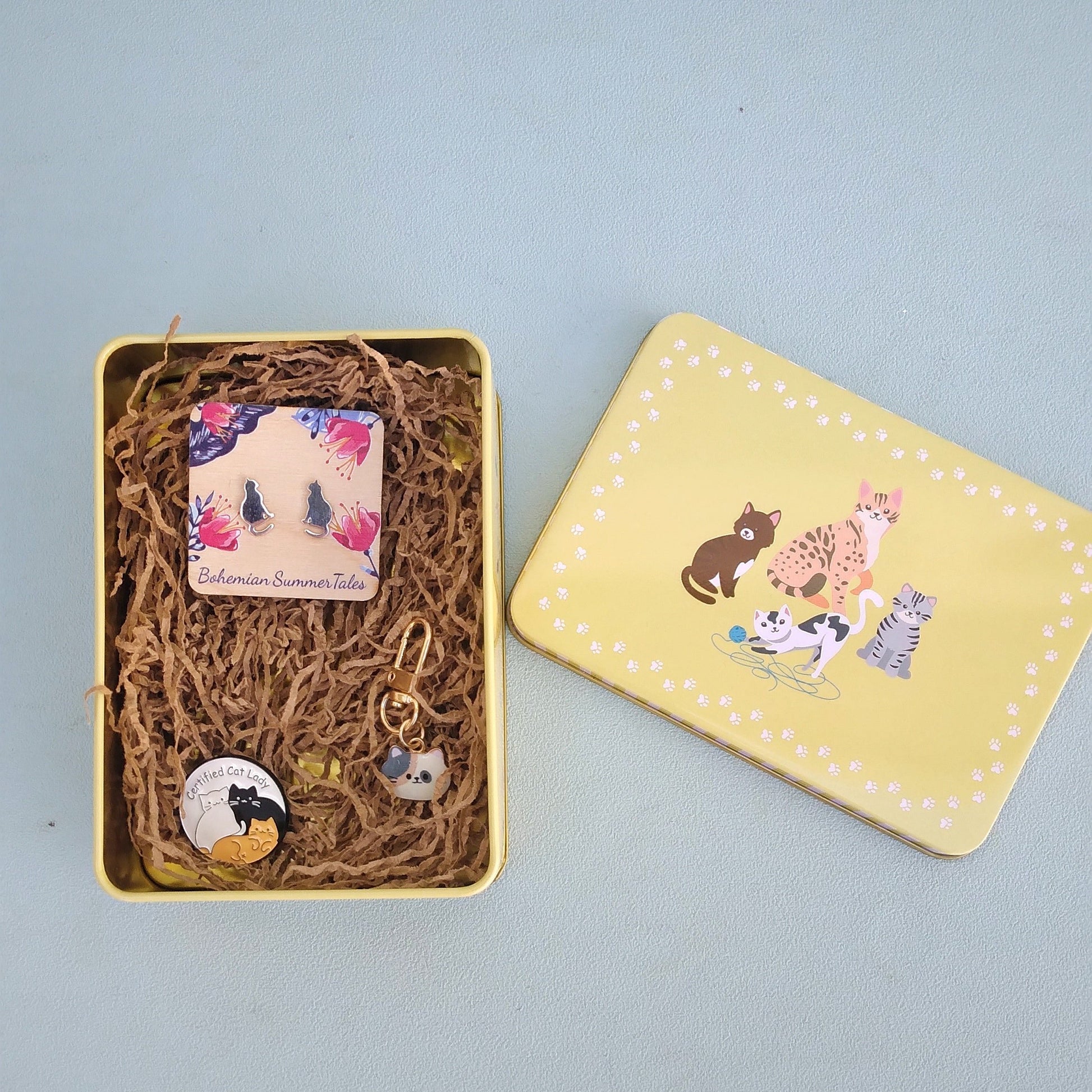Ένα μοναδικό κουτί δώρου για τις περήφανες γατομαμάδες! Περιλαμβάνει 1 ζευγάρι σκουλαρίκια καρφάκι σε σχήμα γατούλα από επαργυρωμένο μπρούτζο, 1 καρφίτσα pin από zinc alloy, και ένα μικρό μπρελοκάκι ψιψινάκι επίσης από zinc alloy. Όλα αυτά μαζί σε ένα γλυκύτατο μεταλλικό αποθηκευτικό κουτάκι γεμάτο γατούλες !
