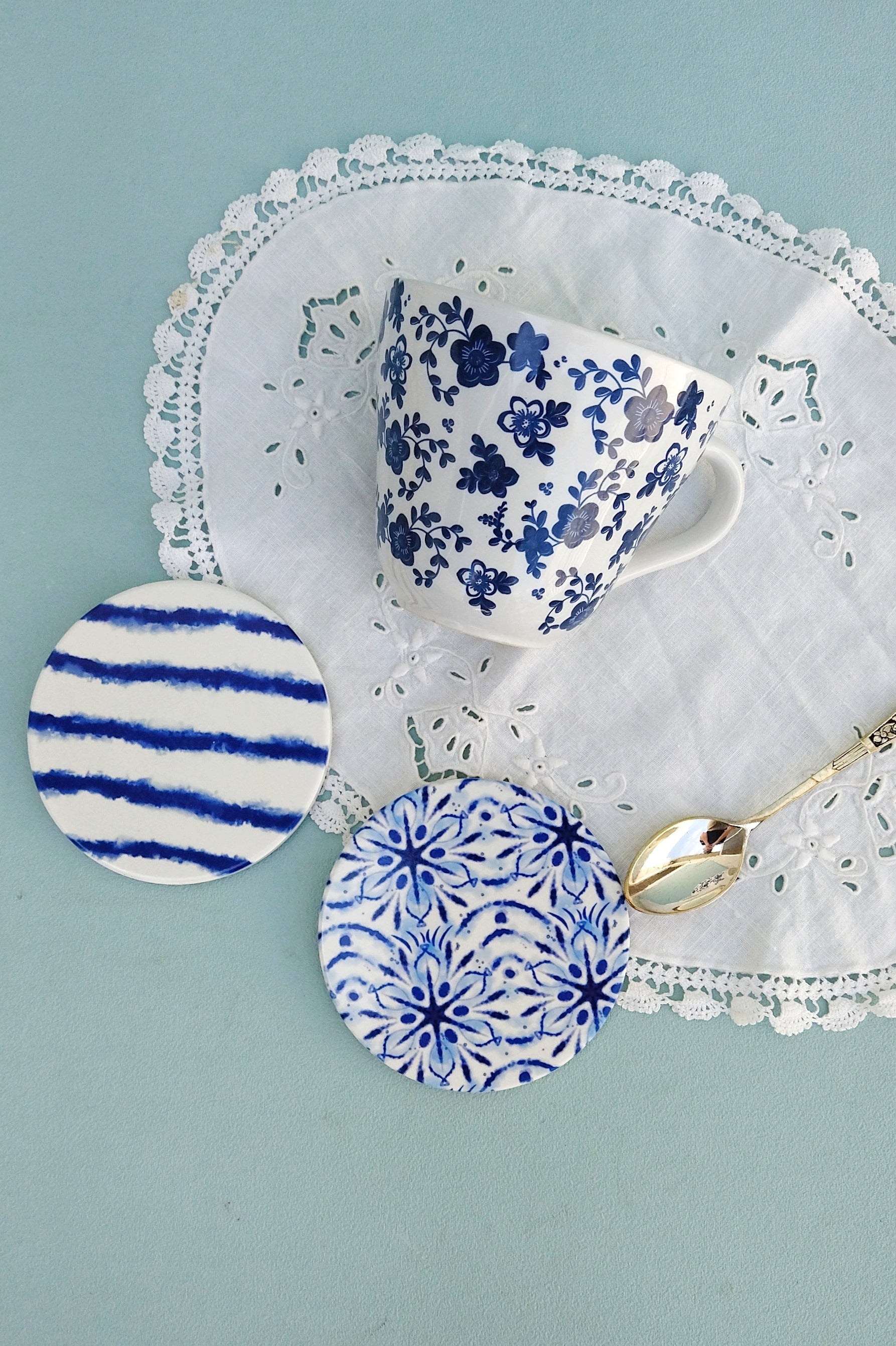 Υπέροχα κεραμικά σουβέρ σε μπλε και λευκές αποχρώσεις. Εμπνευσμένα από Μεσογειακά και Μαροκινά μοτίβα πλακιδίων. Ιδανικό δώρο για ένα καινούργιο σπίτι.
