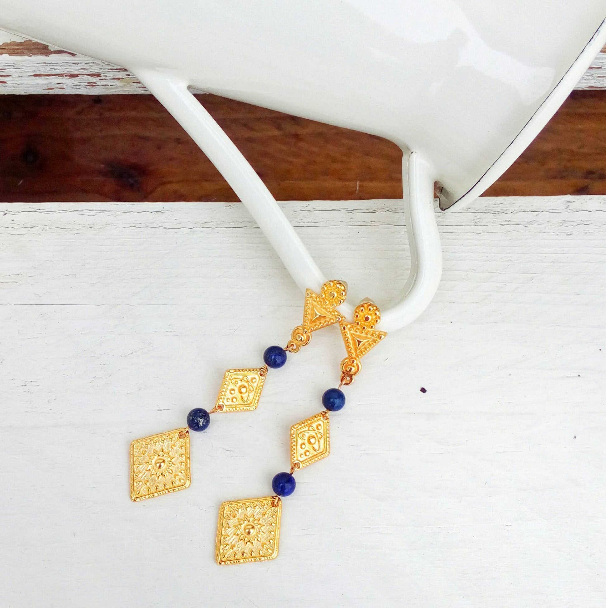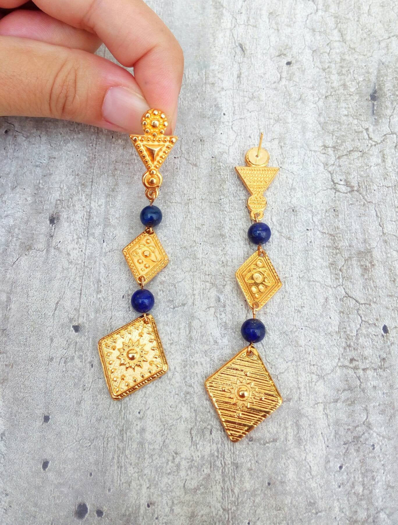 Αριστοκρατικά και γεμάτα λάμψη! Μακριά σκουλαρίκια με πέτρες λάπις σε μπλέ του κοβαλτίου. Φτιαγμένα από 22Κ επιχρυσωμένο μπρούτζο.
