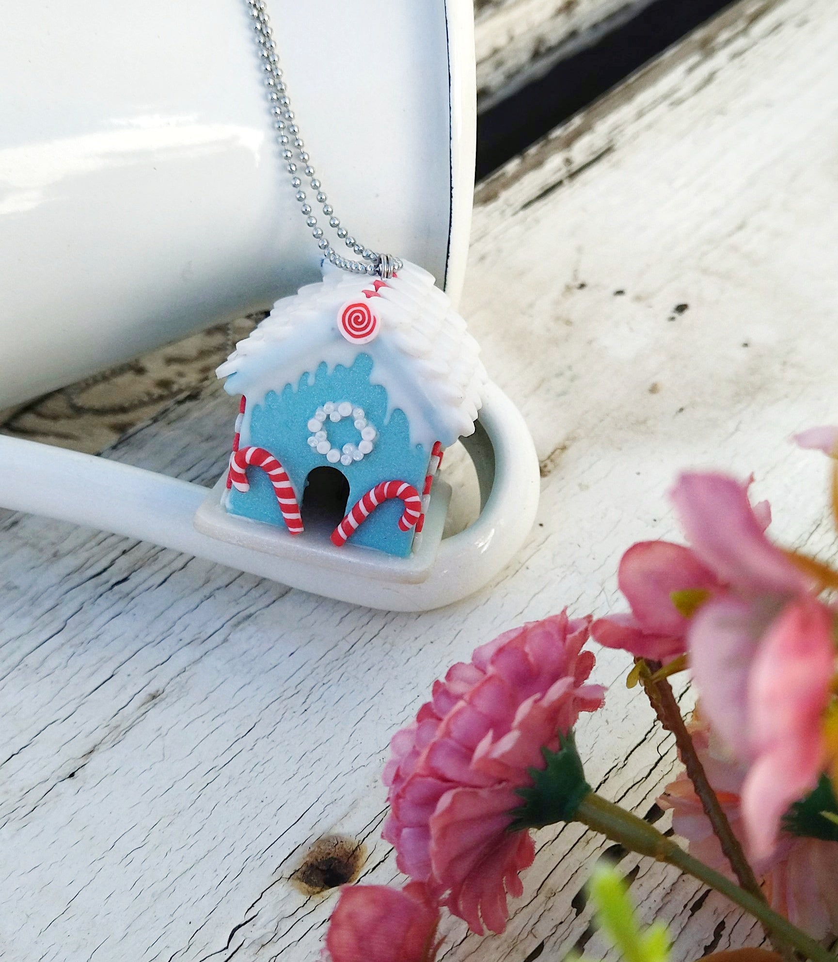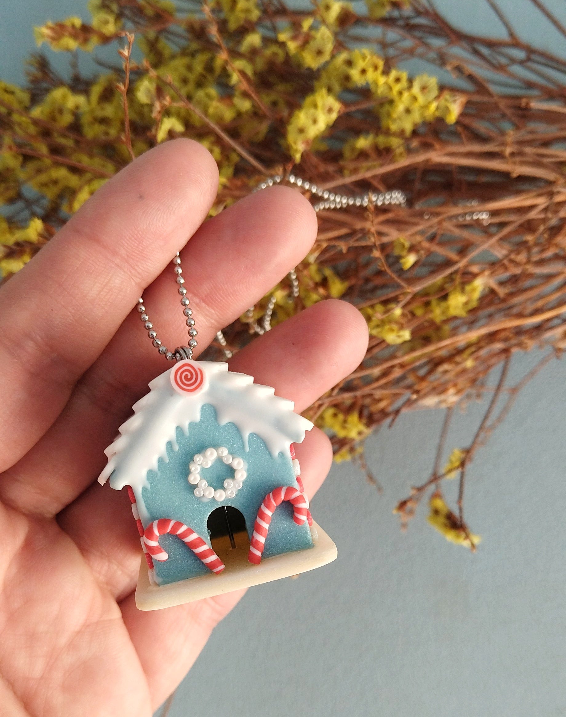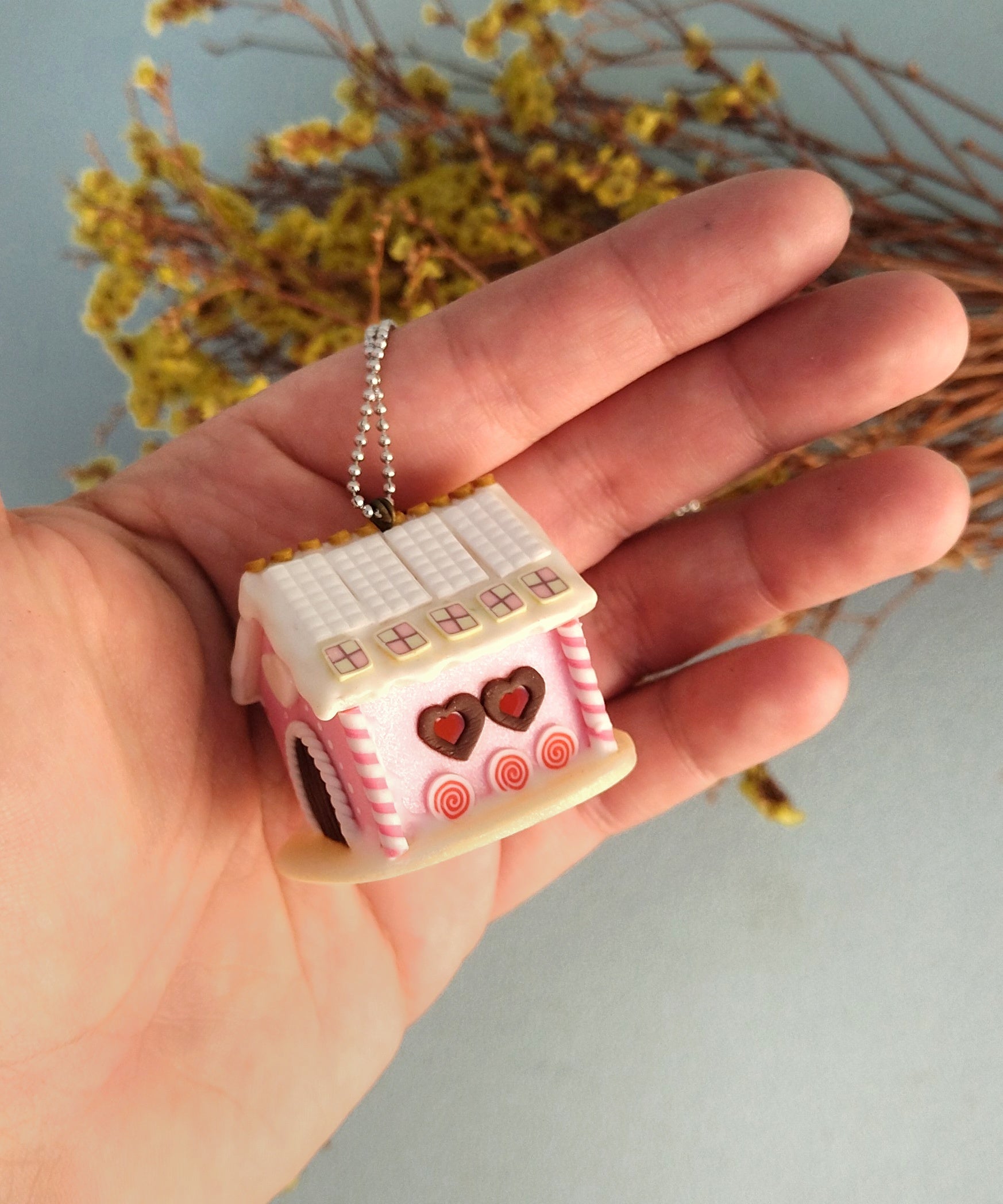Μοναδικό κολιέ μπισκοτόσπιτο φτιαγμένο εξολοκλήρου στο χέρι από πολυμερικό πηλό. Εμπνευσμένο από το παραμύθι "Χάνσελ και Γκρέτελ" των Αδελφών Γκρίμμ, δίνει μια νότα άκρως Χριστουγεννιάτικη και λαχταριστή! Είναι περίπου 3x2.5x3.5 εκατοστά και συνοδεύεται από 80 εκατοστά ατσάλινη αλυσίδα.