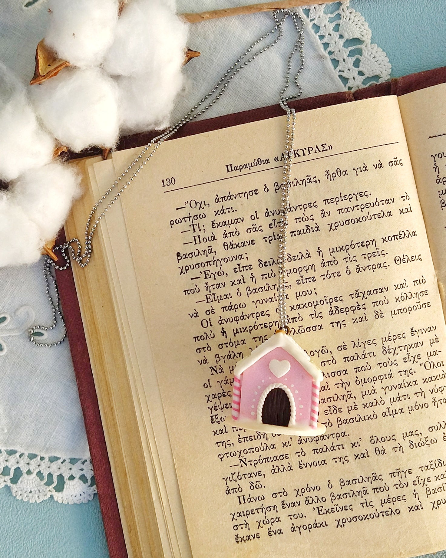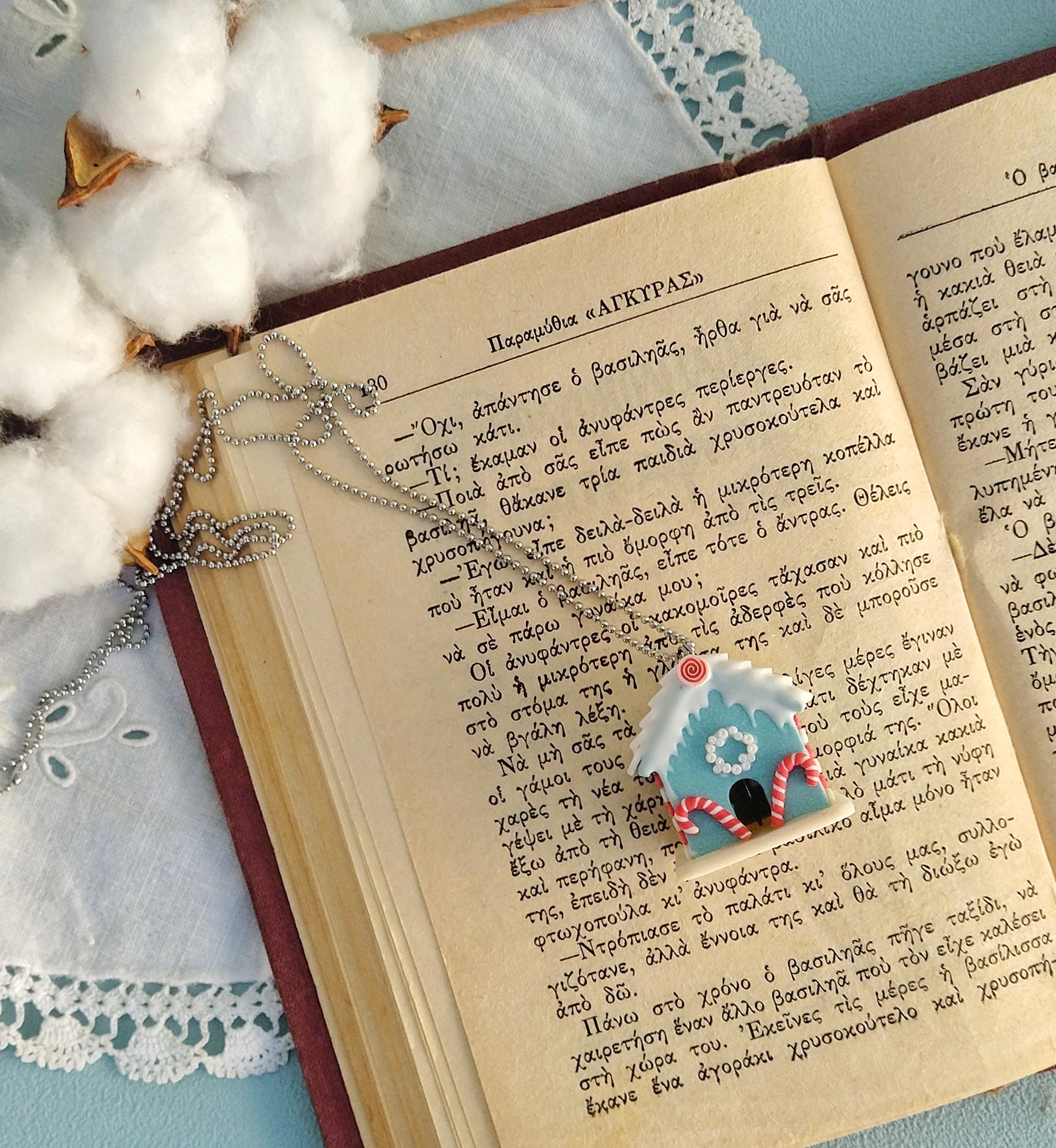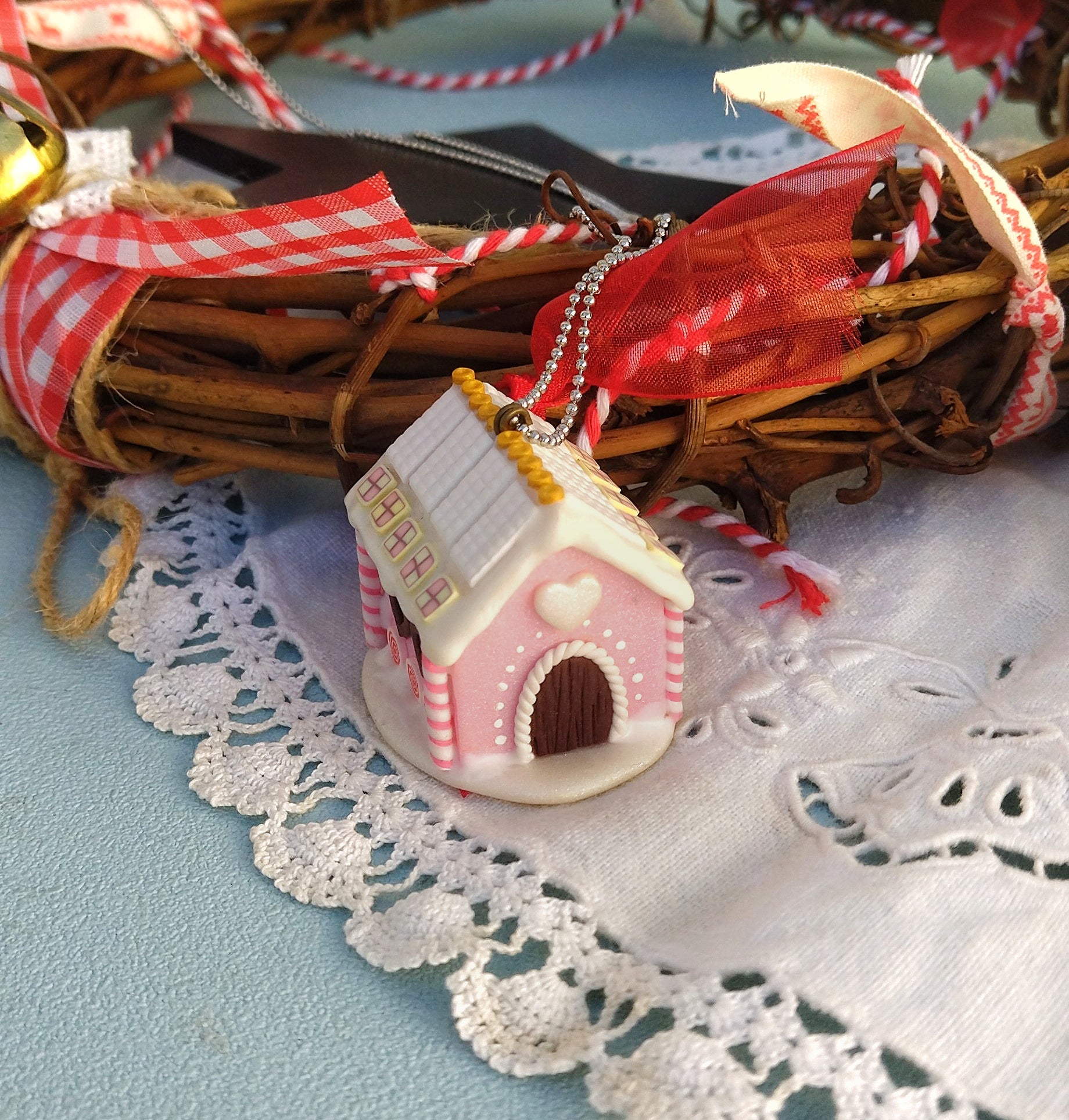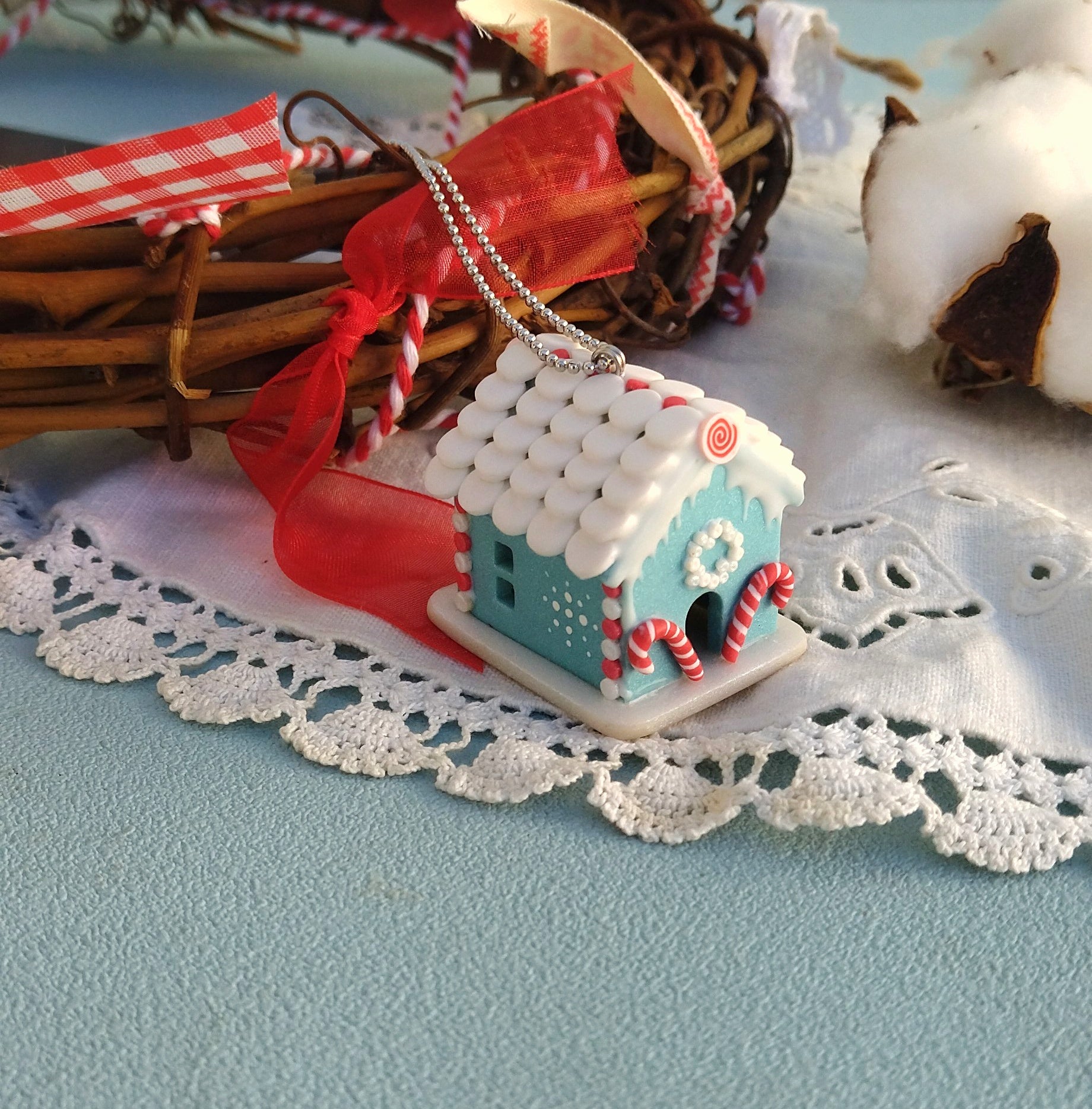 Μοναδικό κολιέ μπισκοτόσπιτο φτιαγμένο εξολοκλήρου στο χέρι από πολυμερικό πηλό. Εμπνευσμένο από το παραμύθι "Χάνσελ και Γκρέτελ" των Αδελφών Γκρίμμ, δίνει μια νότα άκρως Χριστουγεννιάτικη και λαχταριστή! Είναι περίπου 3x2.5x3.5 εκατοστά και συνοδεύεται από 80 εκατοστά ατσάλινη αλυσίδα.