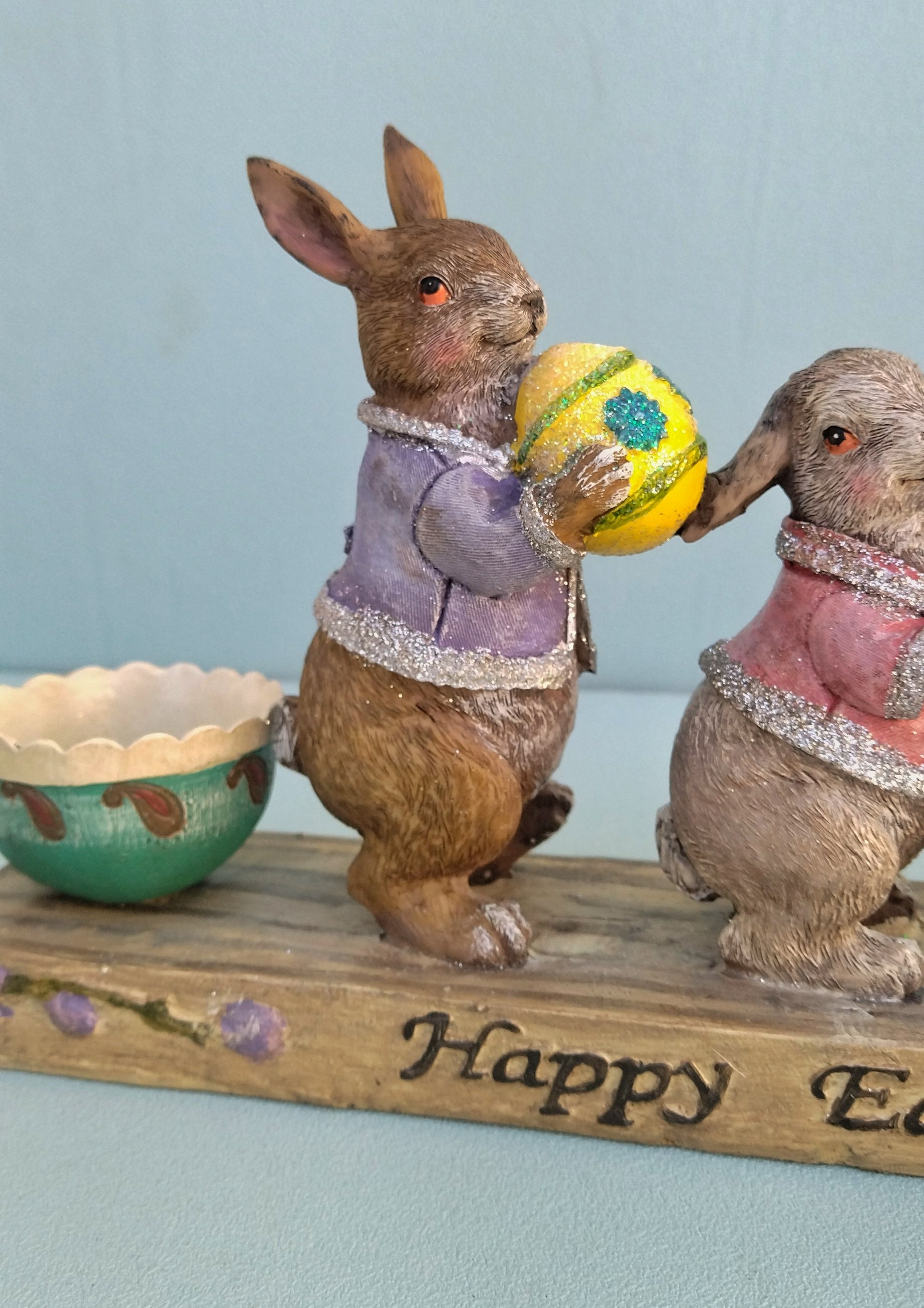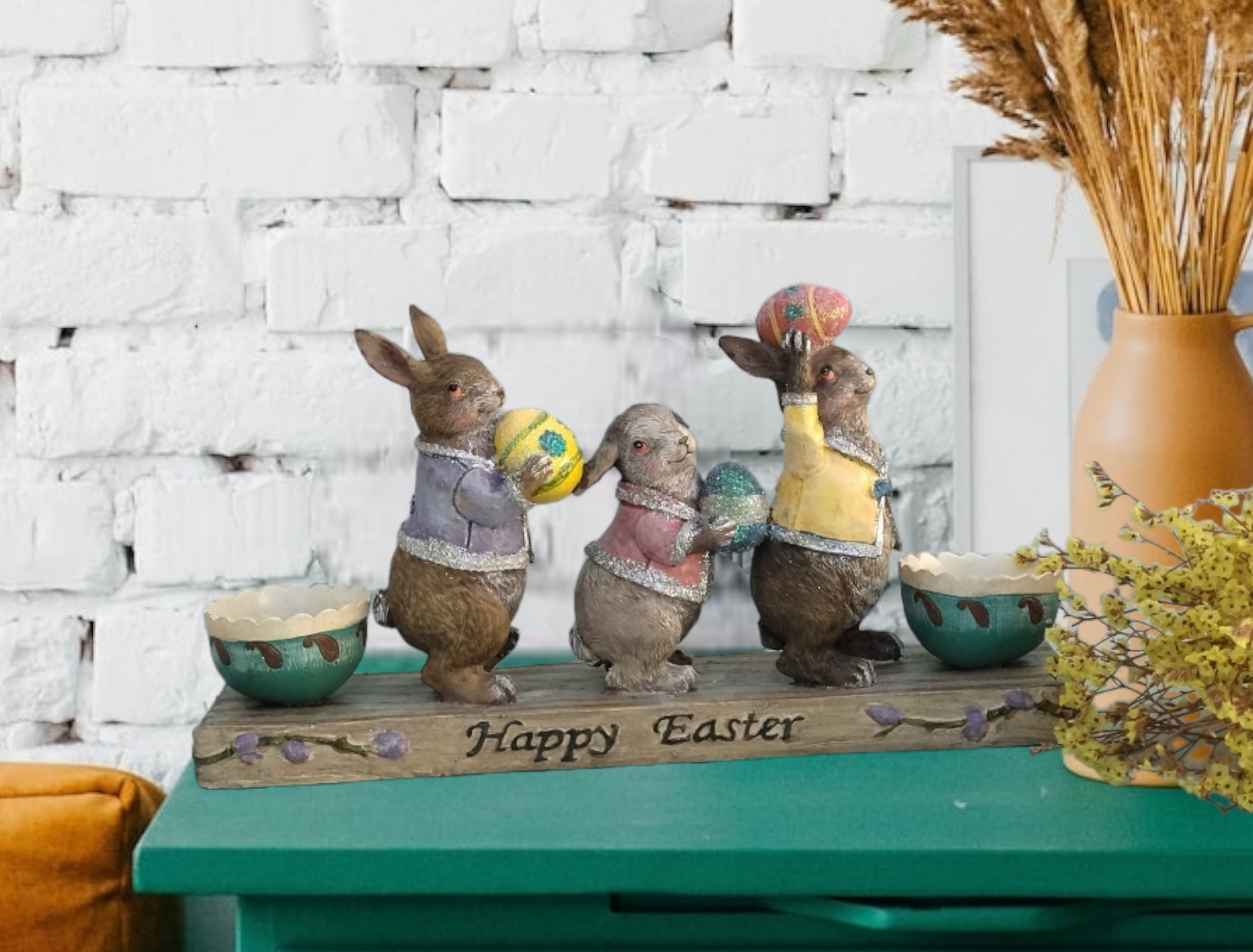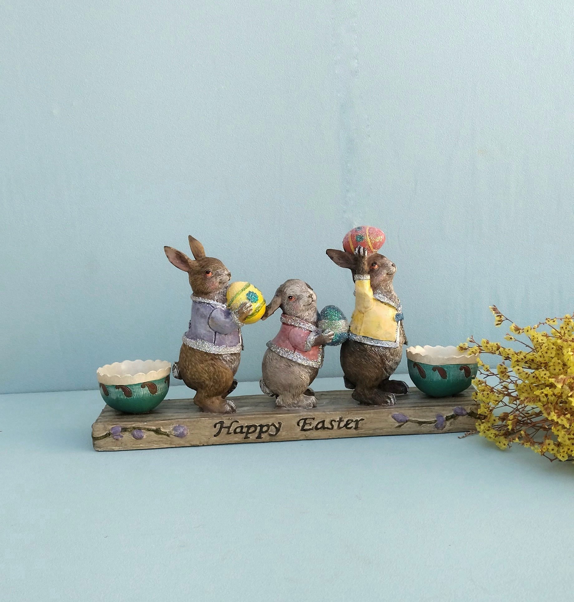 Καλωσορίστε την πασχαλινή περίοδο με τα πιο χαριτωμένα λαγουδάκια! Με δύο θήκες δεξιά και αριστερά για να μπουν τα πασχαλινά σας αυγουλάκια. Φτιαγμένο από ρητίνη, με απίθανες λεπτομέρειες.