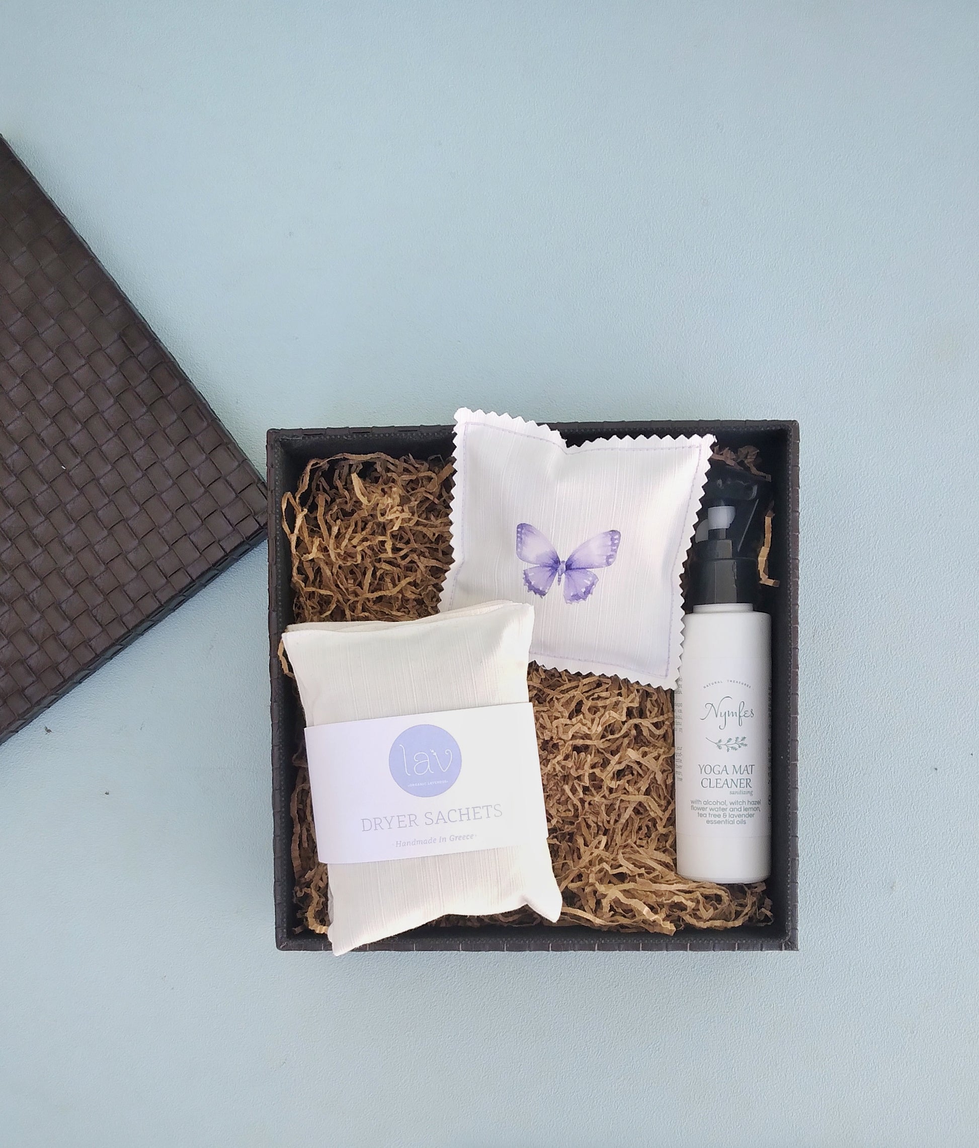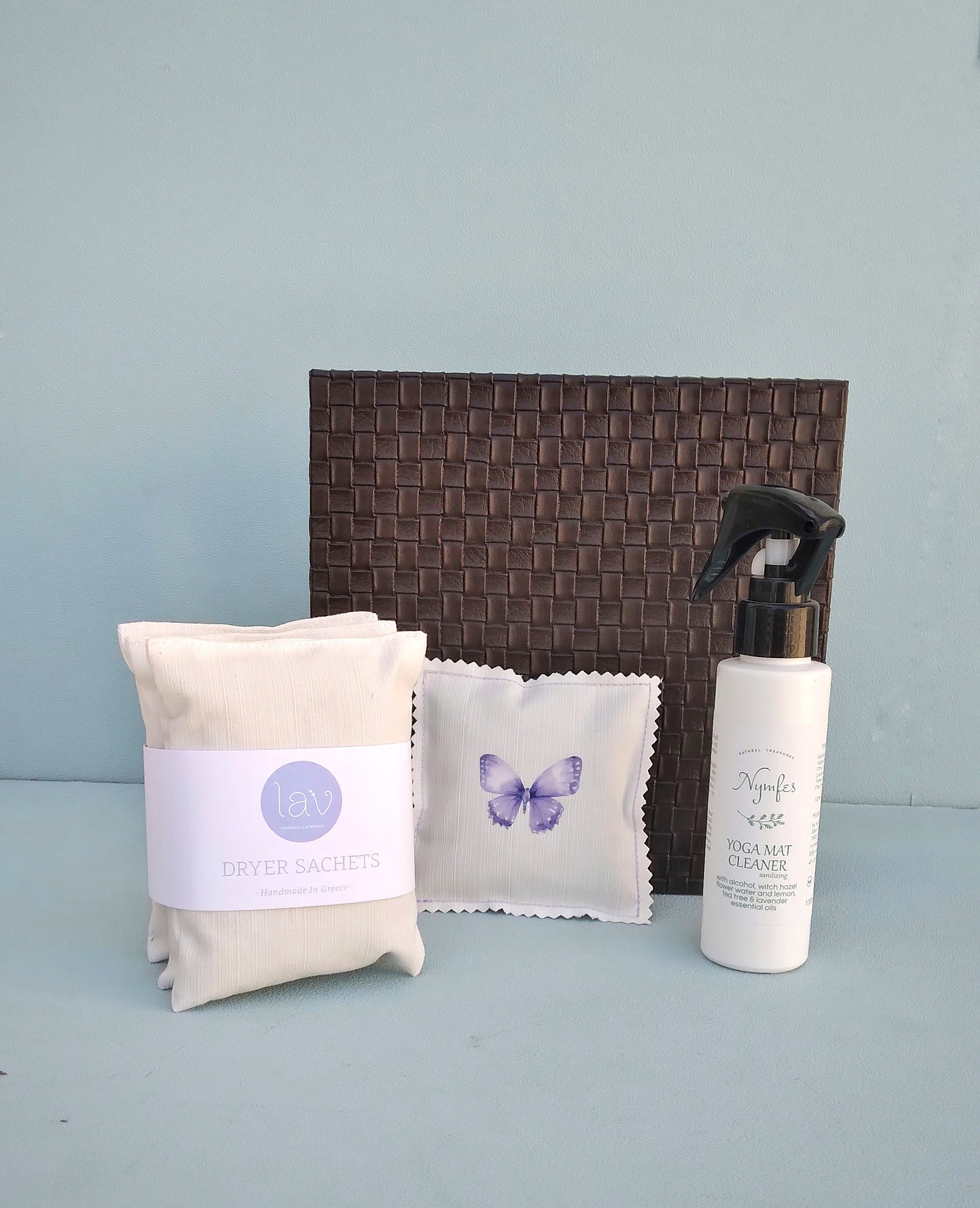❊ 1 μαξιλαράκι πεταλούδα με αποξηραμένη λεβάντα για τα συρτάρια σας ή το γραφείο σας ❊ 1 σετ των 3 τεμαχίων για το στεγνωτήριό σας με άνθη λεβάντας (κάθε τεμάχιο μπορεί να χρησιμοποιηθεί έως και 5 φορές) και ❊ ένα αλκοολούχο καθαριστικό για το χαλάκι της yoga με αιθέρια έλαια λεμονιού, λεβάντας και τειόδενδρου.