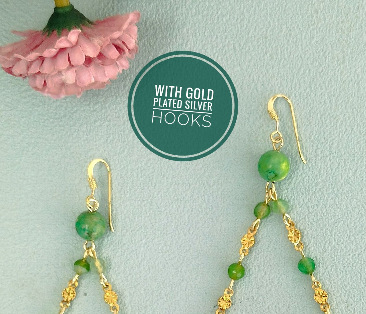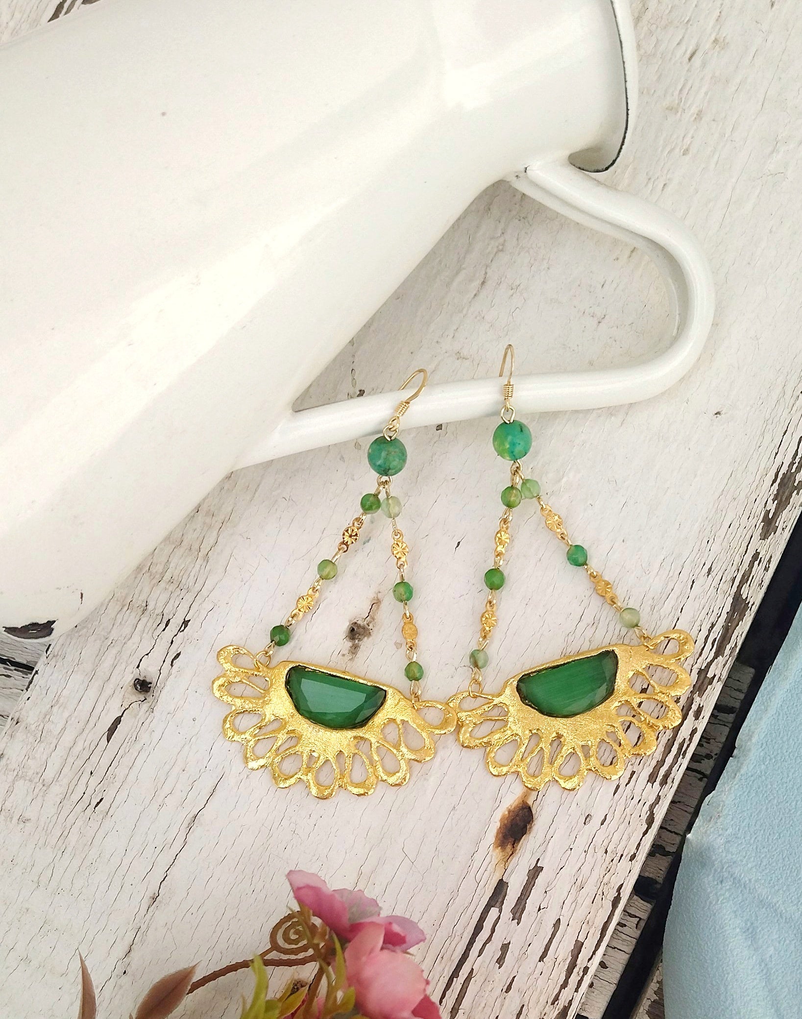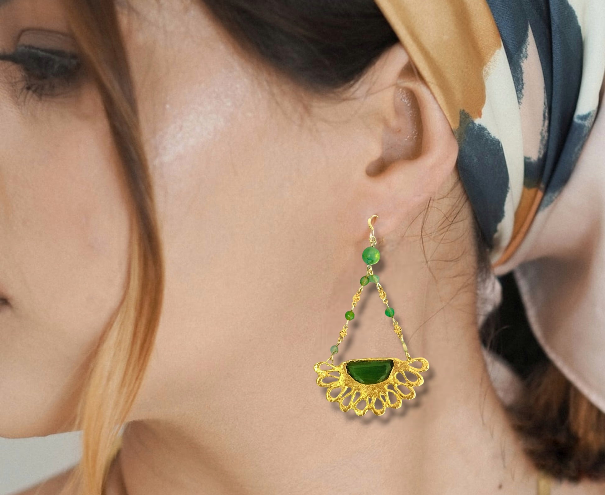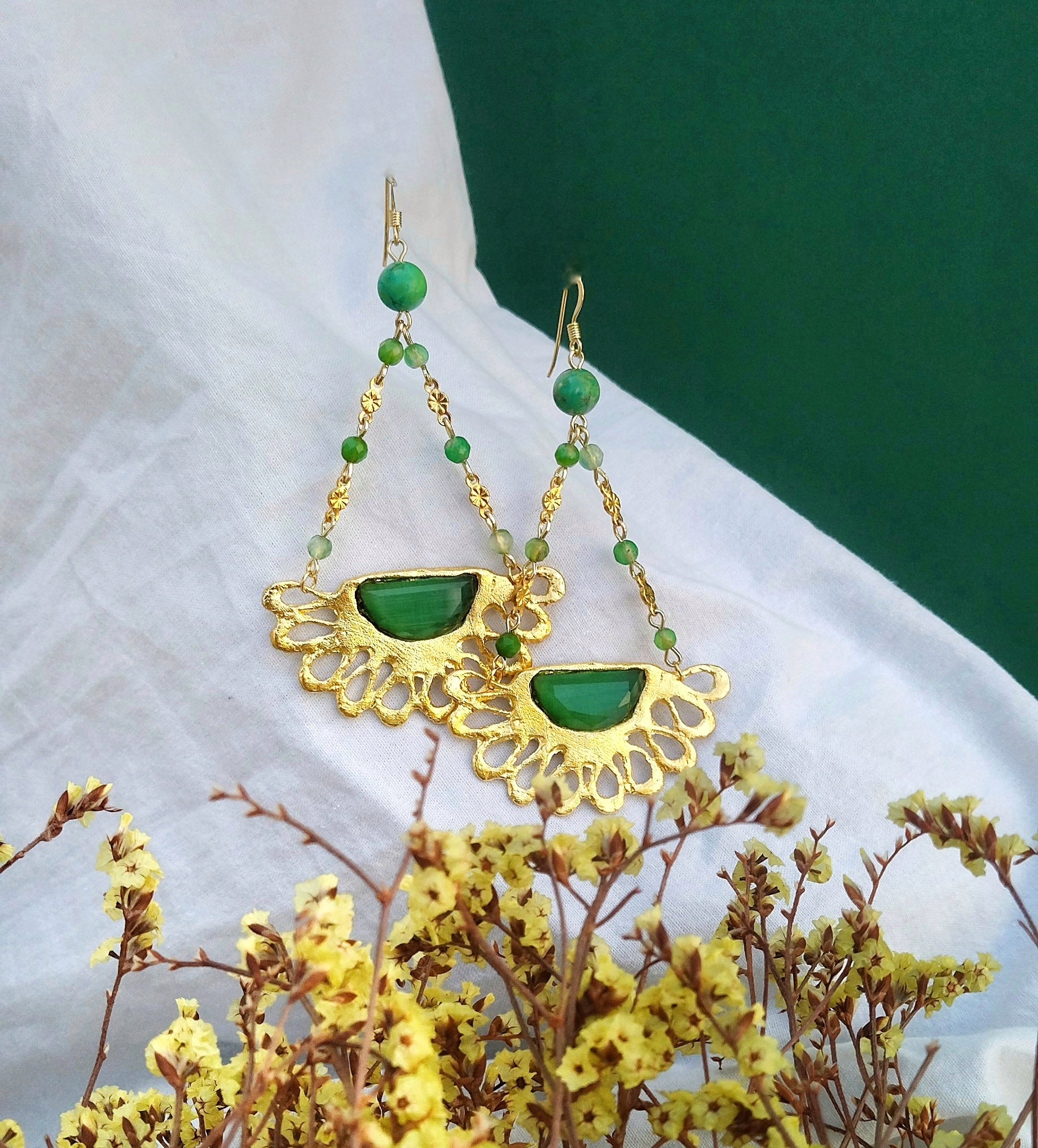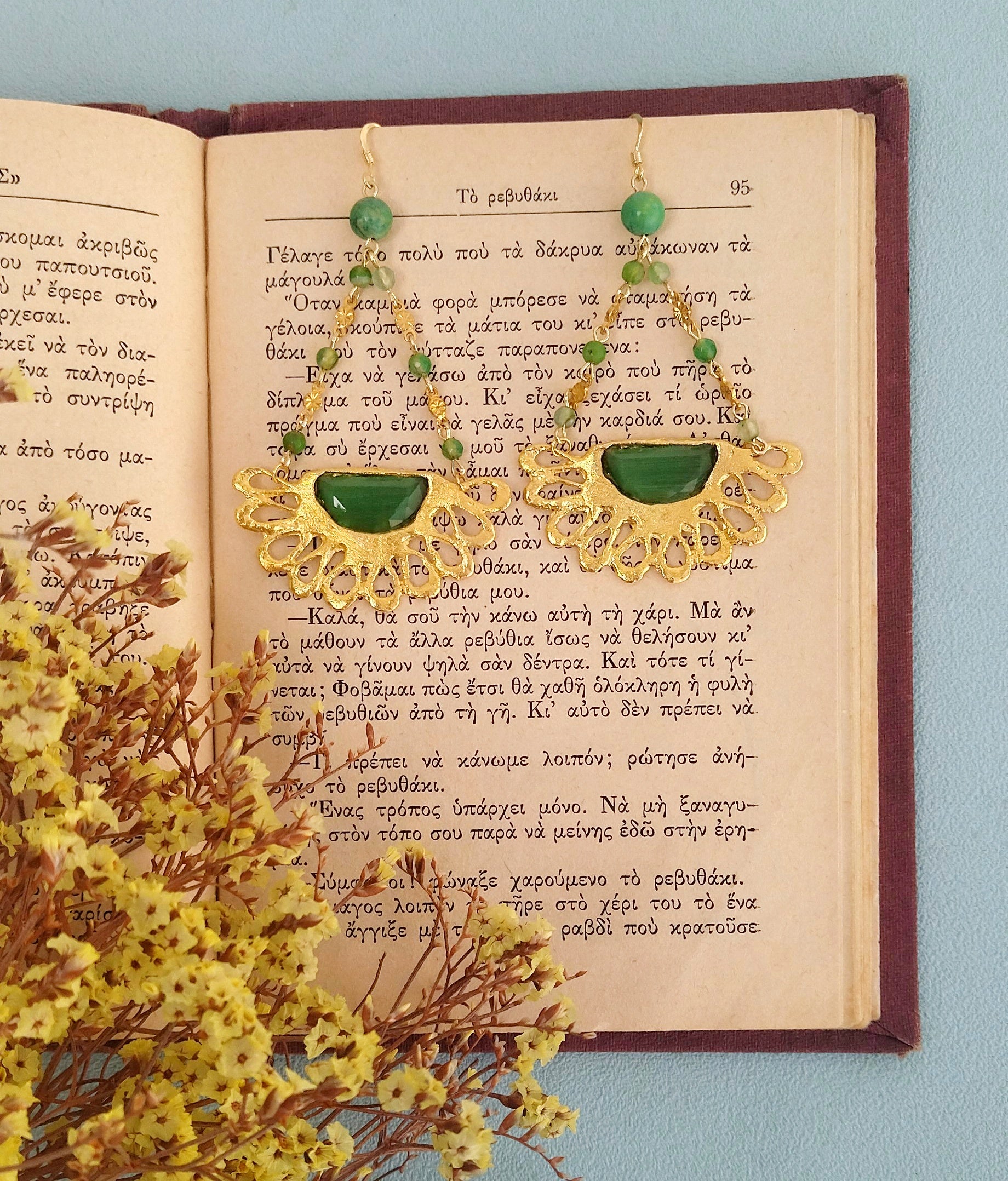 Τα δαντελωτά μας σκουλαρίκια είναι βγαλμένα μέσα από την ελληνική μας παράδοση. Φτιαγμένα από ορείχαλκο, επιχρυσωμένο με 22 καράτια χρυσό και διακοσμημένα με ημιπολύτιμες πέτρες Cat's Eye, Jade και πράσινα κρύσταλλα. Εμπνευσμένα από τα σεμεδάκια και τα κεντήματα της μαμάς τα οποία πάντα με μάγευαν. Τόση προσοχή στη λεπτομέρεια, τόση ομοιομορφία, σαν κύματα από κλωστές! Θέλοντας λοιπόν να τιμήσουμε αυτή την δεξιοτεχνία μαζί με την αγαπημένη Effie Smyri, δώσαμε νέα ζωή στα σεμεδάκια της μαμάς και της γιαγιάς. Και συνδυάζοντας τα με ημιπολύτιμες πέτρες και κρυστάλλους φτιάξαμε τη νέα μας συλλογή!
