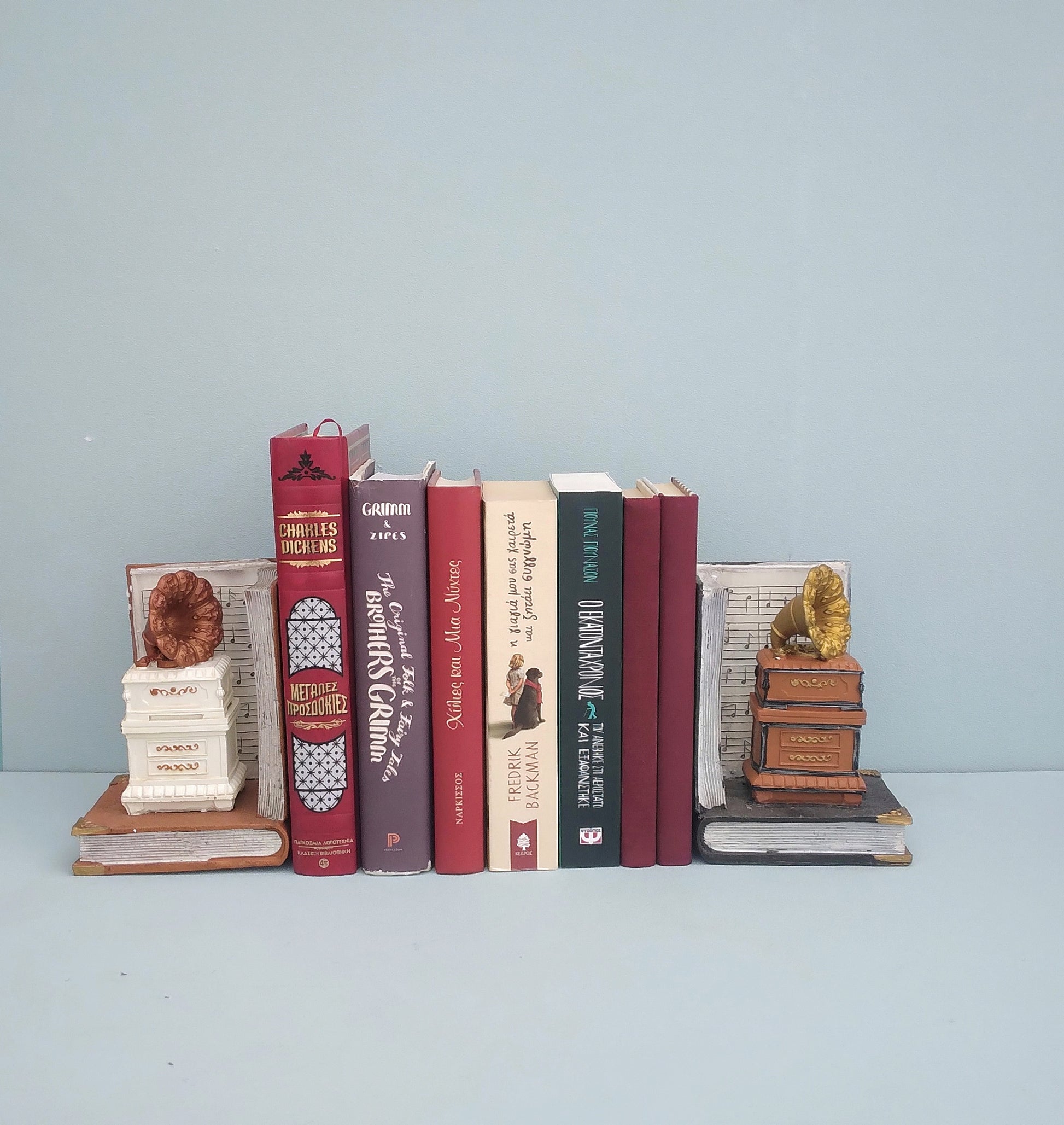 Δώστε ένα στυλ μοναδικό στη βιβλιοθήκη σας με αυτούς τους πρωτότυπους βιβλιοστάτες! Φτιαγμένοι από ρητίνη και με σχέδιο παλιού γραμμόφωνου, θα δώσουν στο χώρο σας έναν αέρα σοφιστικέ και συνάμα παιχνιδιάρικο. Ιδανικό δώρο για έναν μουσικό παραγωγό ή έναν DJ !