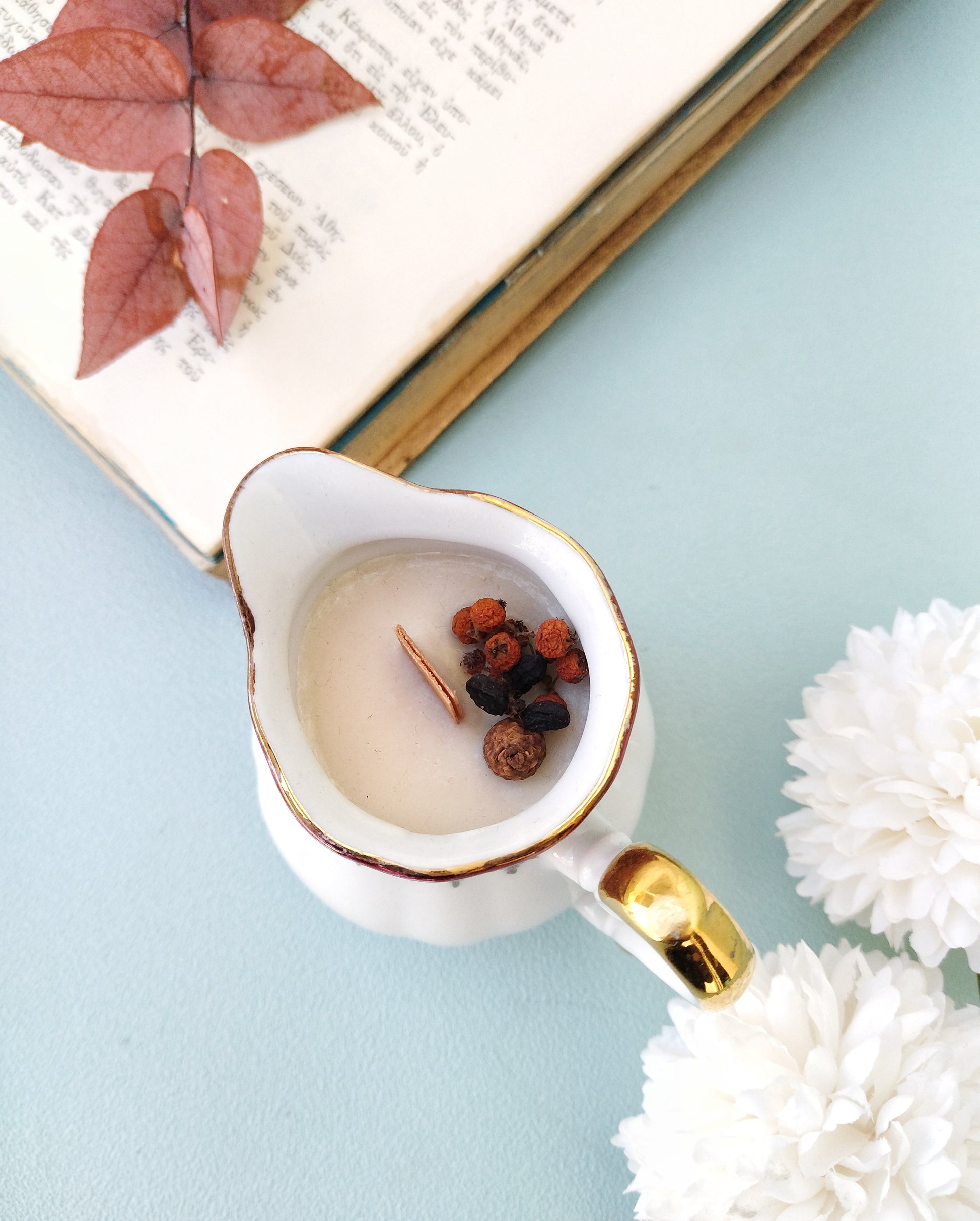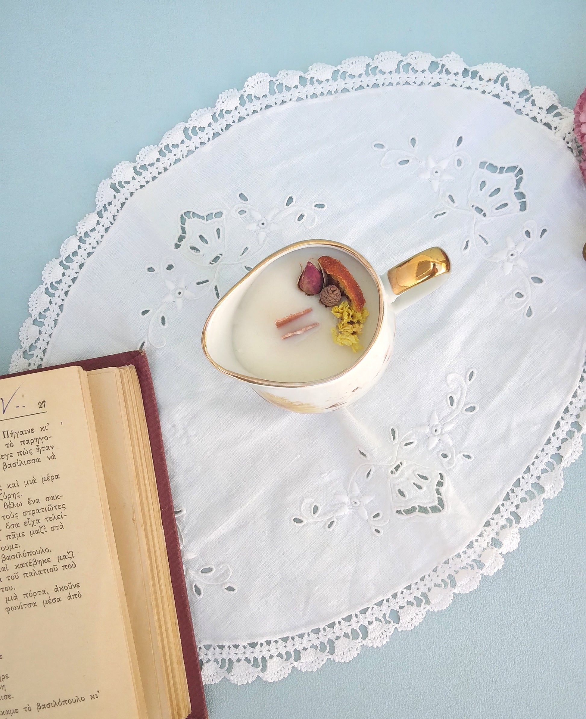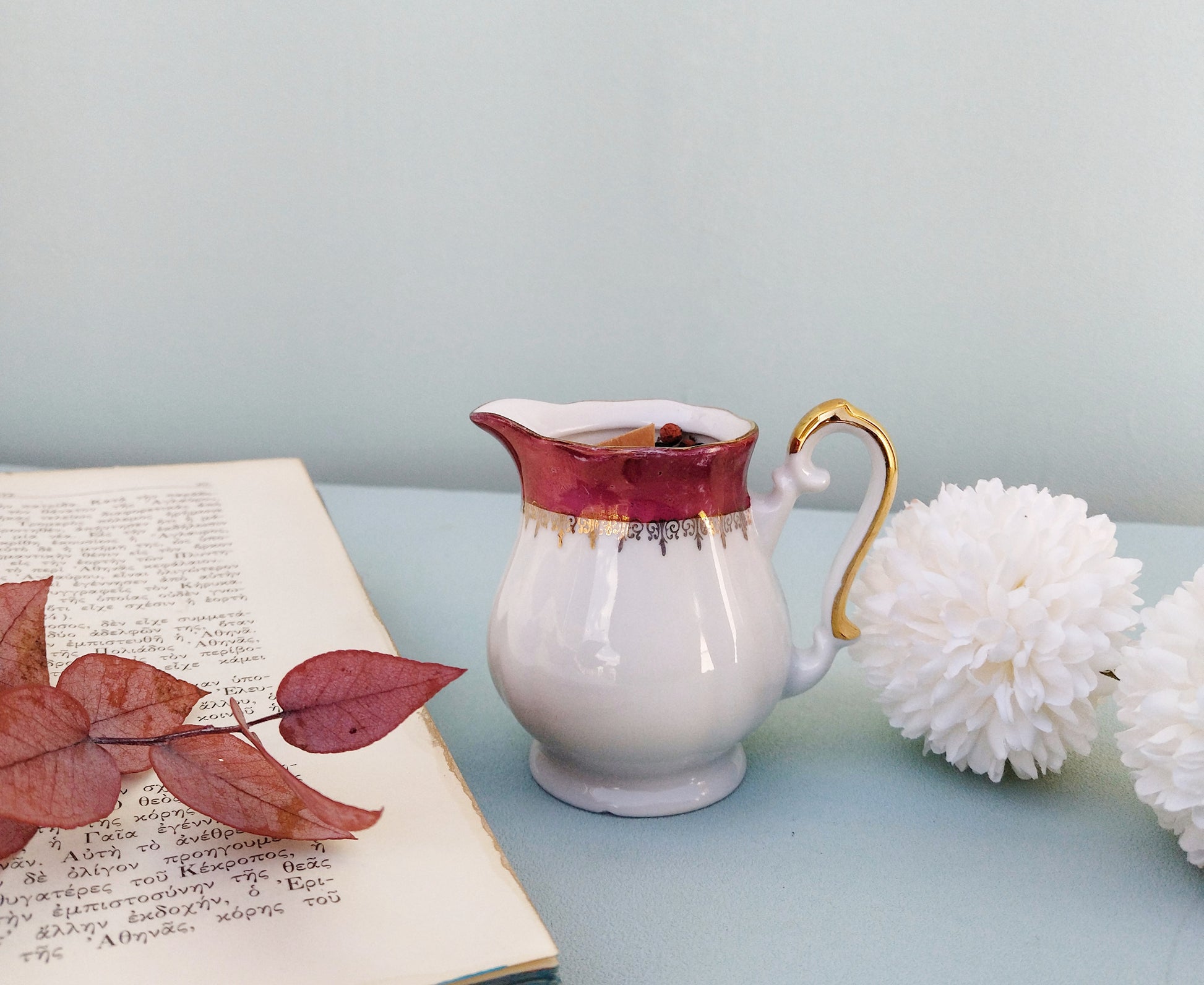 Υπέροχη πορσελάνινη vintage γαλατιέρα με χειροποίητο κερί σόγιας. Μια εναλλακτική χρηστική χρήση για το παλιό σερβίτσιο της γιαγιάς! Με αιθέρια έλαια βανίλιας, κανέλας και γαρύφαλλου. Όταν τελειώσει το κερί μπορείτε απλά να το καθαρίσετε και να το χρησιμοποιήσετε σαν γαλατιέρα ή να σας το ξαναγεμίσουμε!