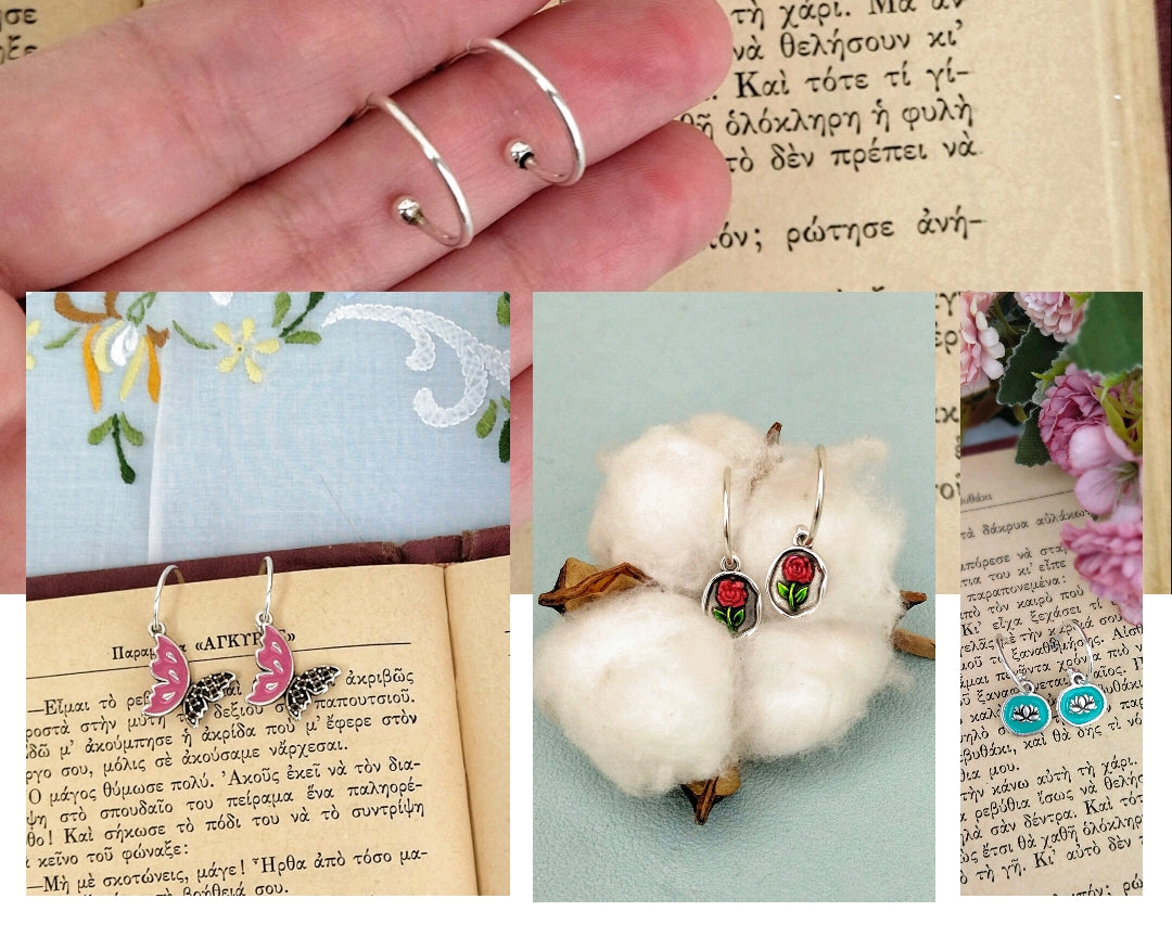Το απόλυτο σχέδιο για εκείνες που τους αρέσει να παίζουν με το στύλ τους! 4 σκουλαρίκια σε ένα. Απλά ατσάλινα κρικάκια για όλες τις ώρες. Προσθέστε τις πεταλούδες για μια πιο ανέμελη διάθεση. Το σχέδιο του λωτού με τα τυρκουάζ σμαλτάκια θα τονίσουν τις λεπτομέρειες του προσώπου σας ενώ τα γλυκύτατα τριανταφυλλάκια μας θα αναβαθμίσουν το βραδινό σας ντύσιμο..