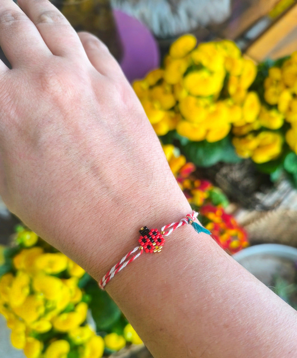 Κόκκινη κλωστή δεμένη...Μαρτάκι για να μην μας κάψει ο ήλιος! Με πασχαλίτσα φτιαγμένη από υψηλής ποιότητας χάντρες Miyuki και σε βραχιολάκι με μακραμέ κλείσιμο για να αυξομειώνεται στα μέτρα σας. Επιλέξτε το στο χαριτωμένο ξύλινο καρτελάκι της φωτογραφίας για να το δωρίσετε στους αγαπημένους σας!