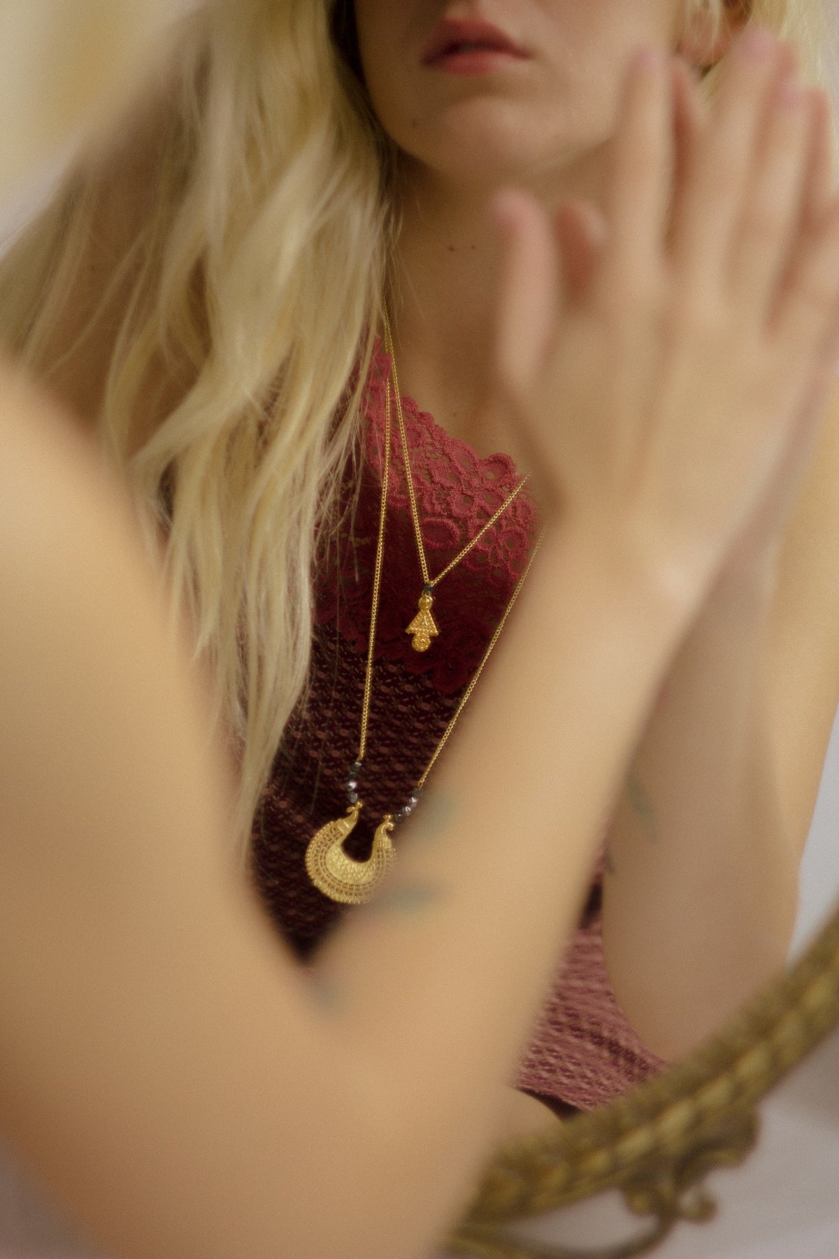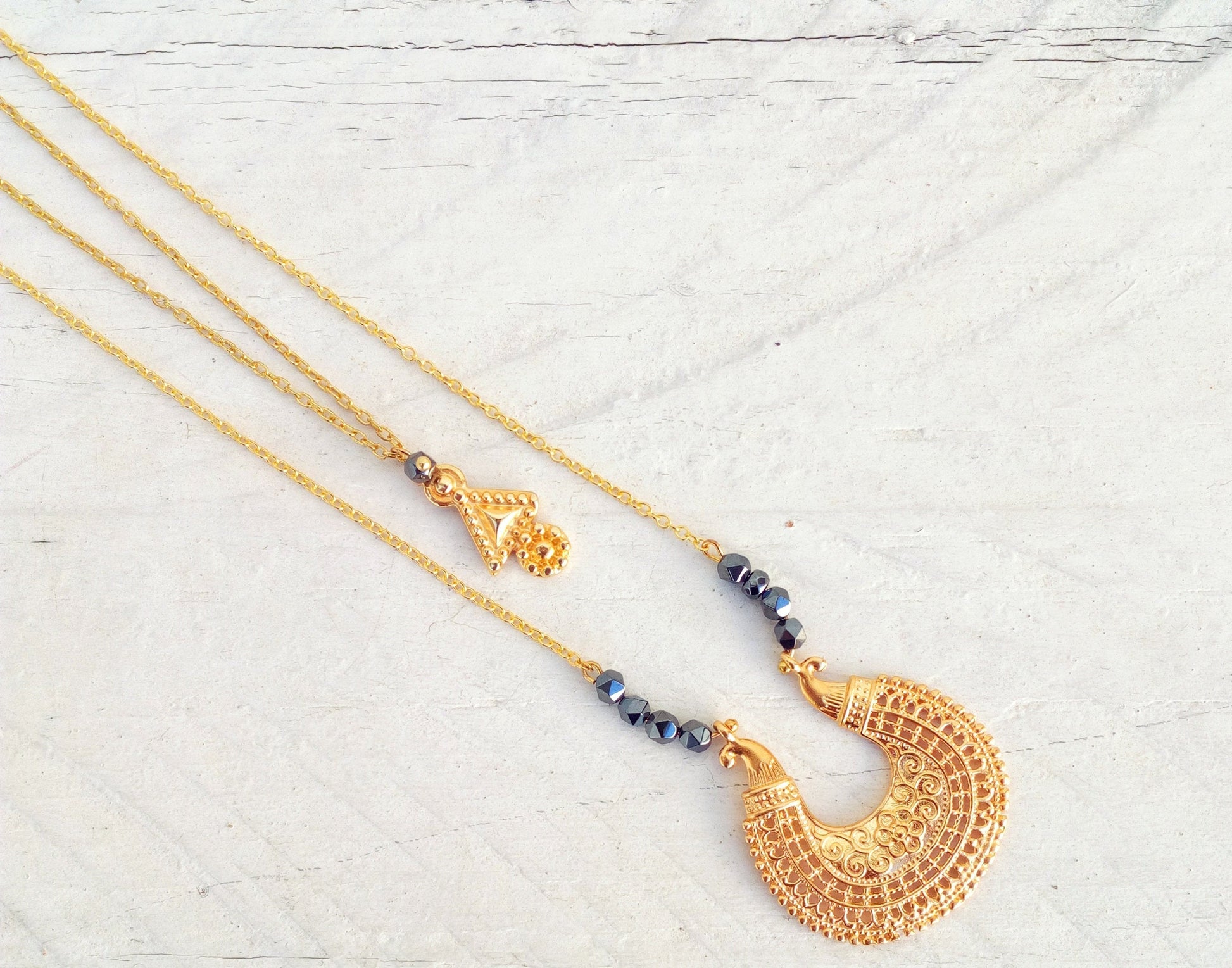 ❊ Υλικό: Μπρούτζος, επιχρυσωμένος με χρυσό 22 καρατίων ❊ Μέγεθος μεγάλου μενταγιόν: 4*3.5 εκατοστά ❊ Μέγεθος μικρου μενταγιόν: 3.7*1.4 εκατοστά ❊ Μάκρος : Μεγάλου κολιέ: 76.2 εκατοστά Μικρότερου κολιέ: 63.5 εκατοστά