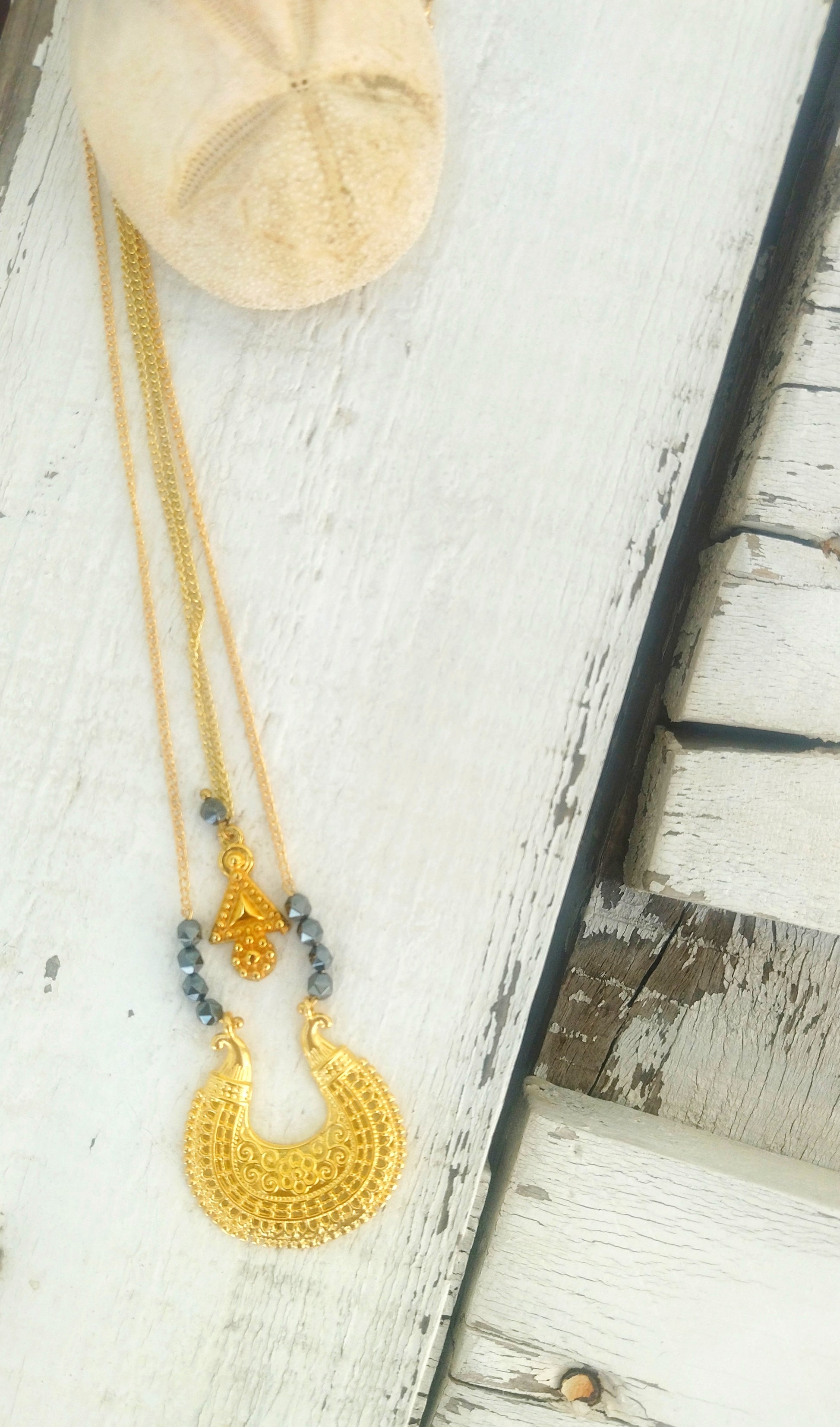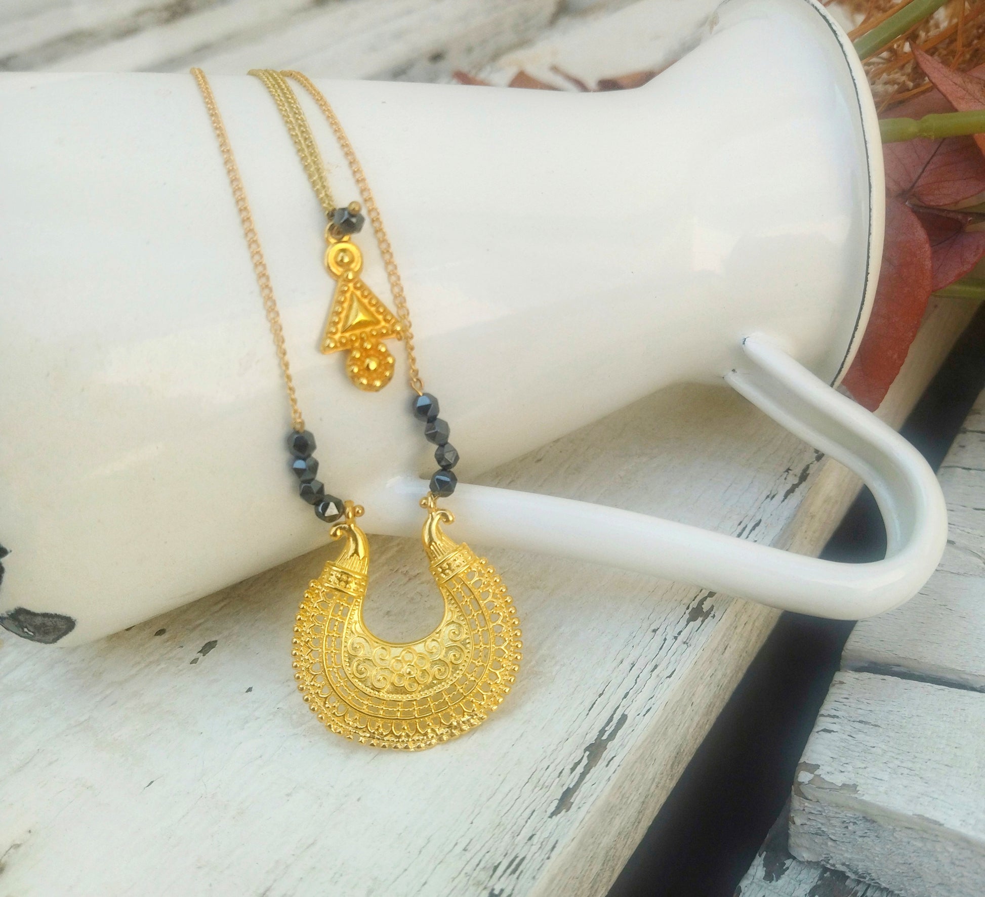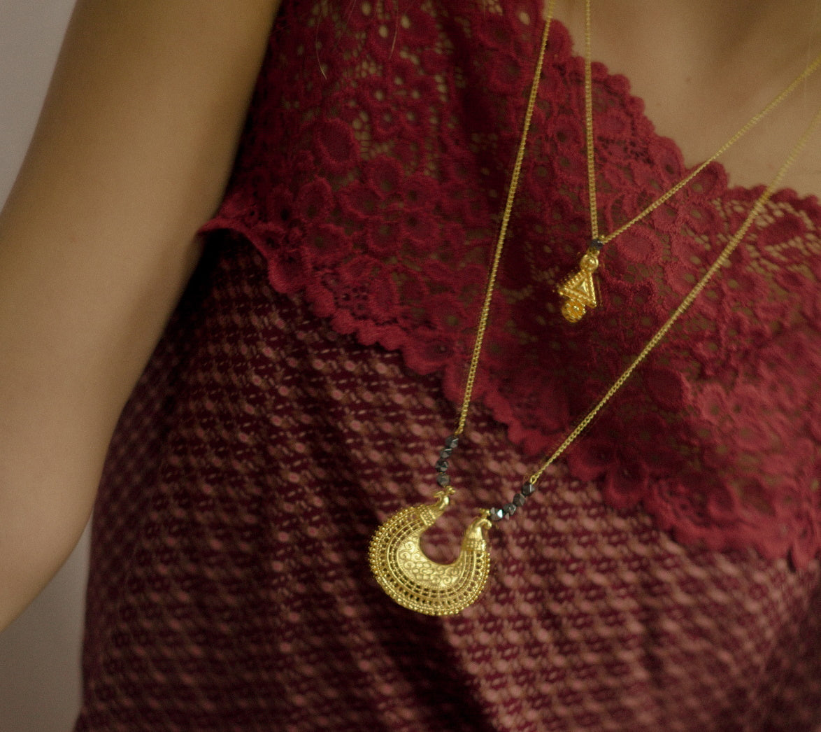 Βυζαντινό κολιέ, επιχρυσωμένο με 22 καράτια χρυσό. Φτιαγμένο με παραδοσιακές τεχνικές δημιουργίας βυζαντινών κοσμημάτων. Με μαύρους ημιπολύτιμους λίθους αιματίτη, φτιαγμένο ειδικά για γυναίκες δυνατές, με αυξημένη συναισθηματική νοημοσύνη...