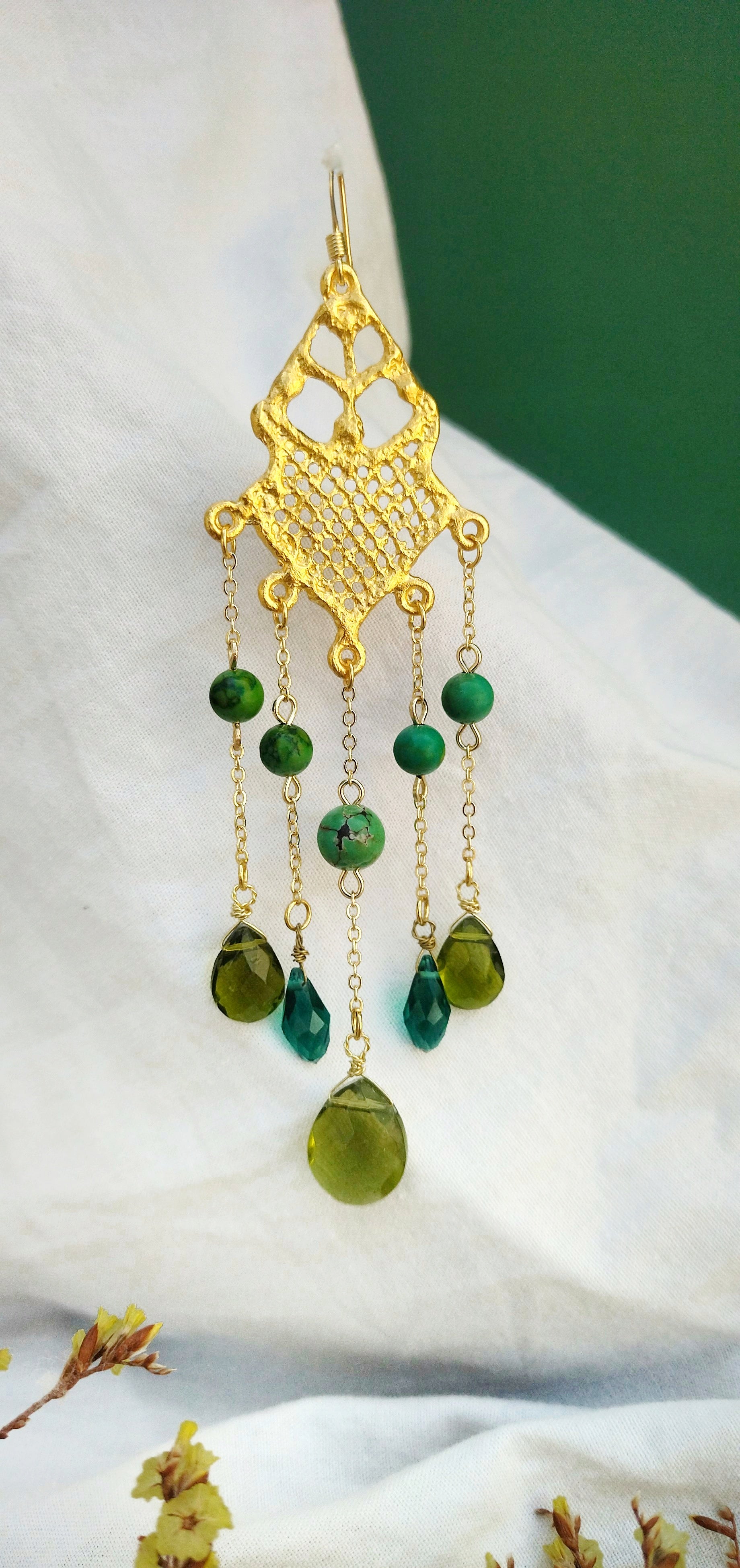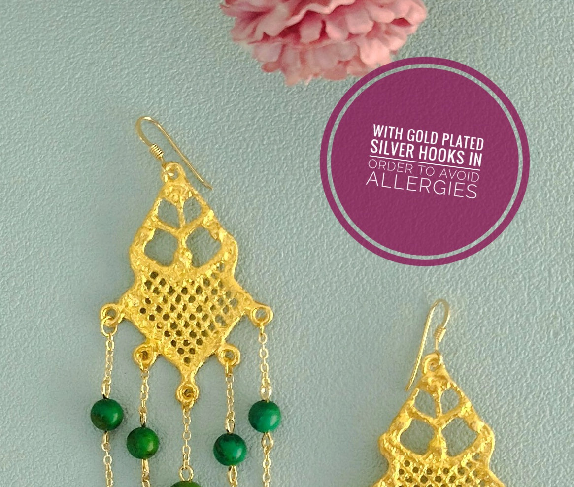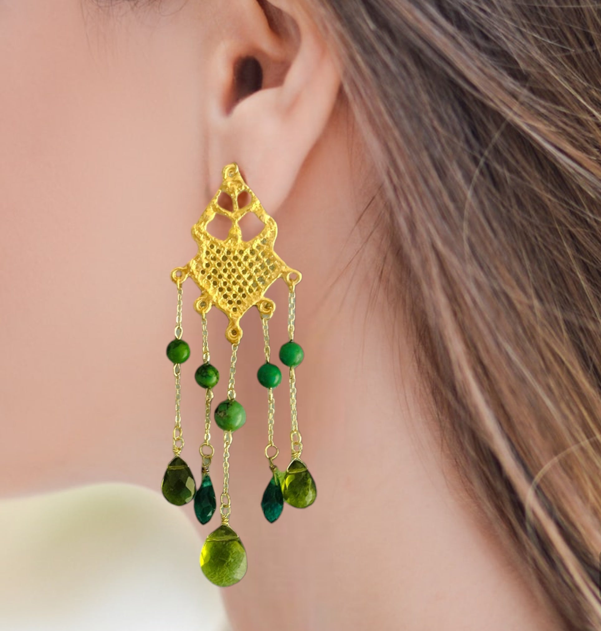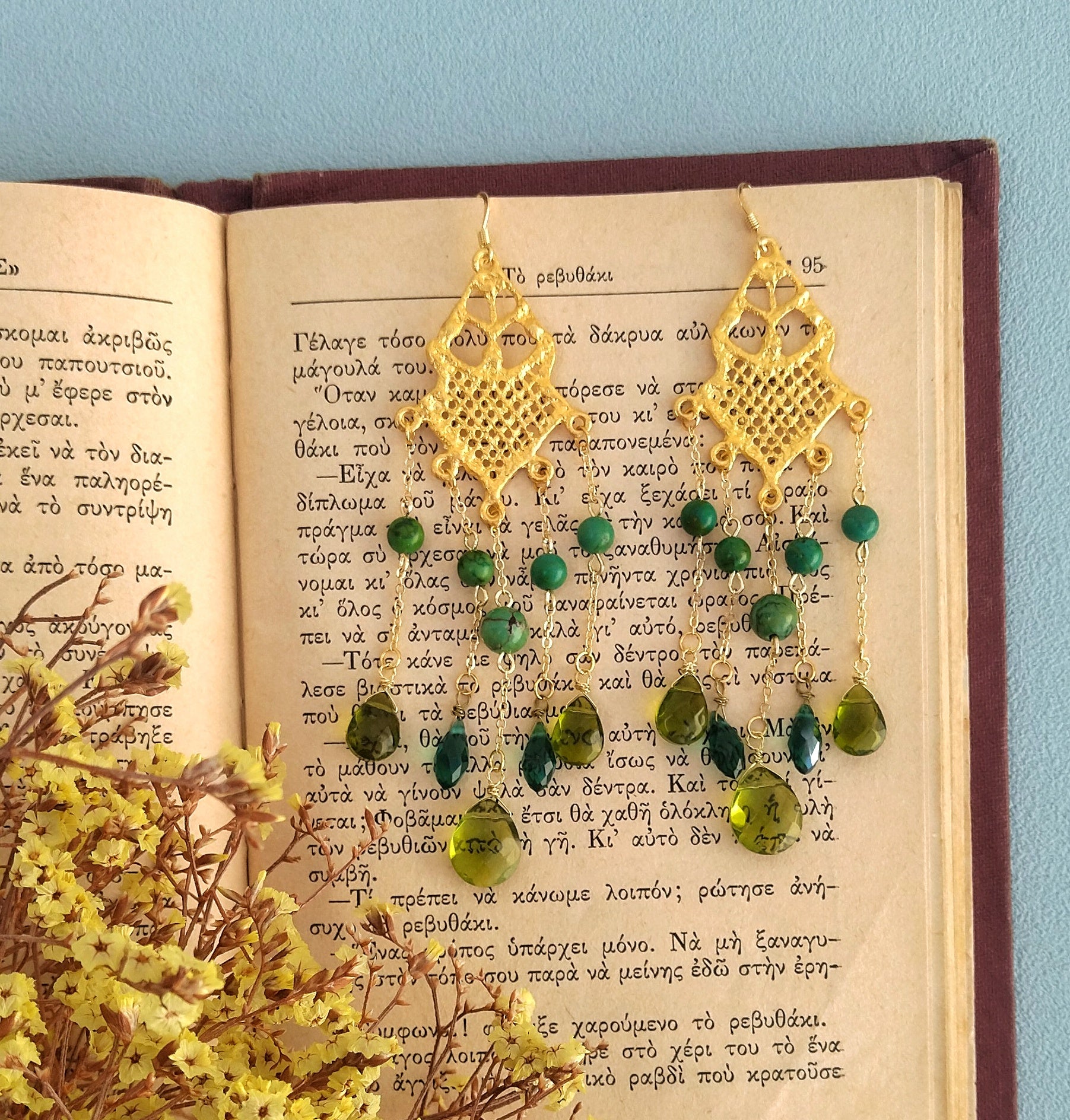 Tα δαντελωτά μας σκουλαρίκια είναι βγαλμένα μέσα από την ελληνική μας παράδοση. Φτιαγμένα από ορείχαλκο, επιχρυσωμένο με 24 καράτια χρυσό και διακοσμημένα με ημιπολύτιμες πέτρες χαολίτη και πράσινα κρύσταλλα. Εμπνευσμένα από τα σεμεδάκια και τα κεντήματα της μαμάς τα οποία πάντα με μάγευαν. Τόση προσοχή στη λεπτομέρεια, τόση ομοιομορφία, σαν κύματα από κλωστές! Θέλοντας λοιπόν να τιμήσουμε αυτή την δεξιοτεχνία μαζί με την αγαπημένη Effie Smyri, δώσαμε νέα ζωή στα σεμεδάκια της μαμάς και της γιαγιάς. Και συνδυάζοντας τα με ημιπολύτιμες πέτρες και κρυστάλλους φτιάξαμε τη νέα μας συλλογή!