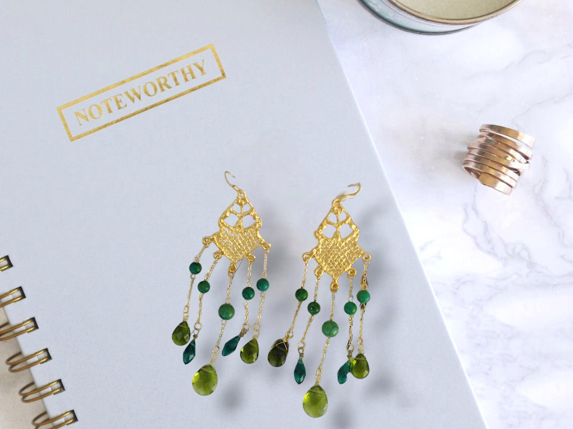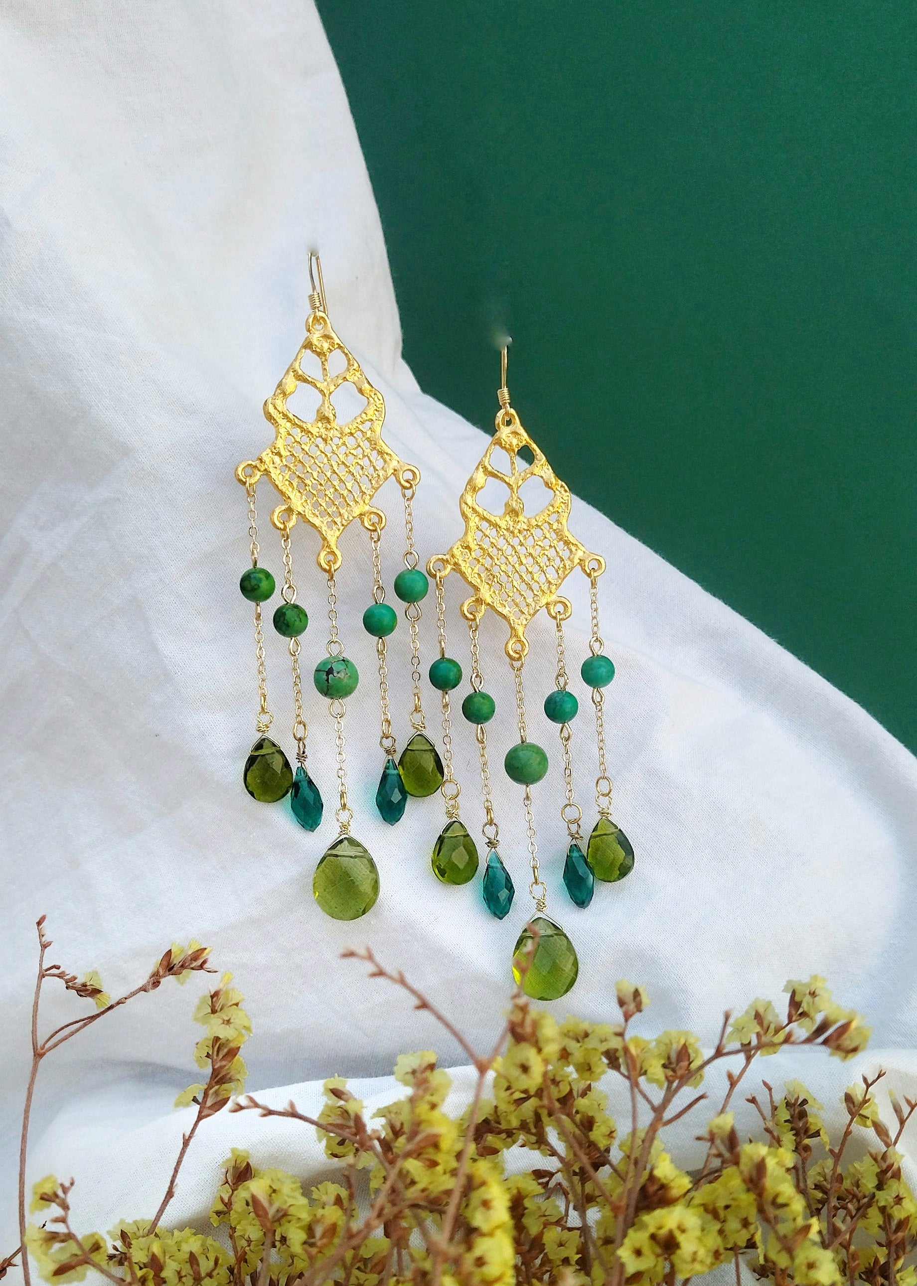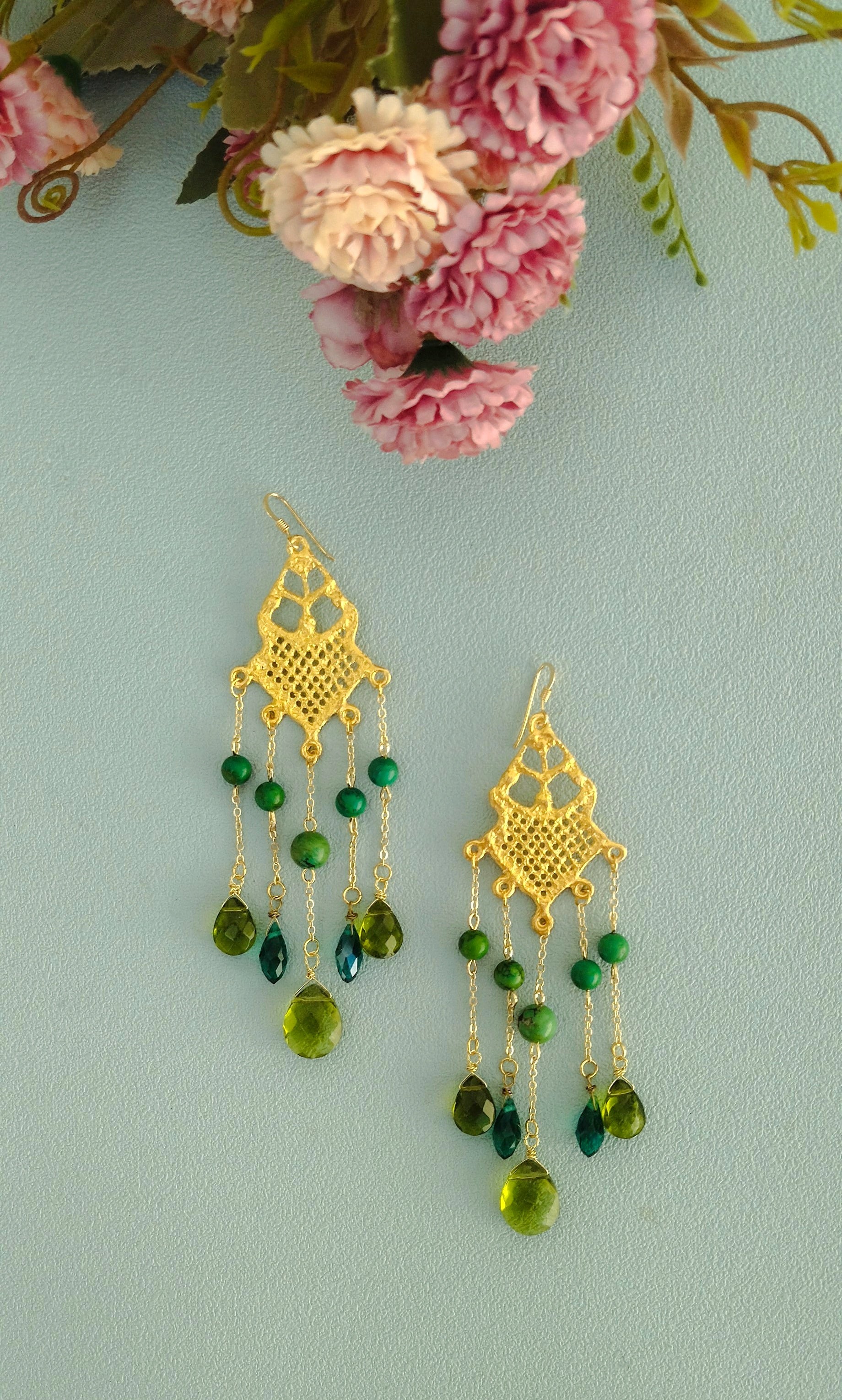 Tα δαντελωτά μας σκουλαρίκια είναι βγαλμένα μέσα από την ελληνική μας παράδοση. Φτιαγμένα από ορείχαλκο, επιχρυσωμένο με 24 καράτια χρυσό και διακοσμημένα με ημιπολύτιμες πέτρες χαολίτη και πράσινα κρύσταλλα. Εμπνευσμένα από τα σεμεδάκια και τα κεντήματα της μαμάς τα οποία πάντα με μάγευαν. Τόση προσοχή στη λεπτομέρεια, τόση ομοιομορφία, σαν κύματα από κλωστές! Θέλοντας λοιπόν να τιμήσουμε αυτή την δεξιοτεχνία μαζί με την αγαπημένη Effie Smyri, δώσαμε νέα ζωή στα σεμεδάκια της μαμάς και της γιαγιάς. Και συνδυάζοντας τα με ημιπολύτιμες πέτρες και κρυστάλλους φτιάξαμε τη νέα μας συλλογή!