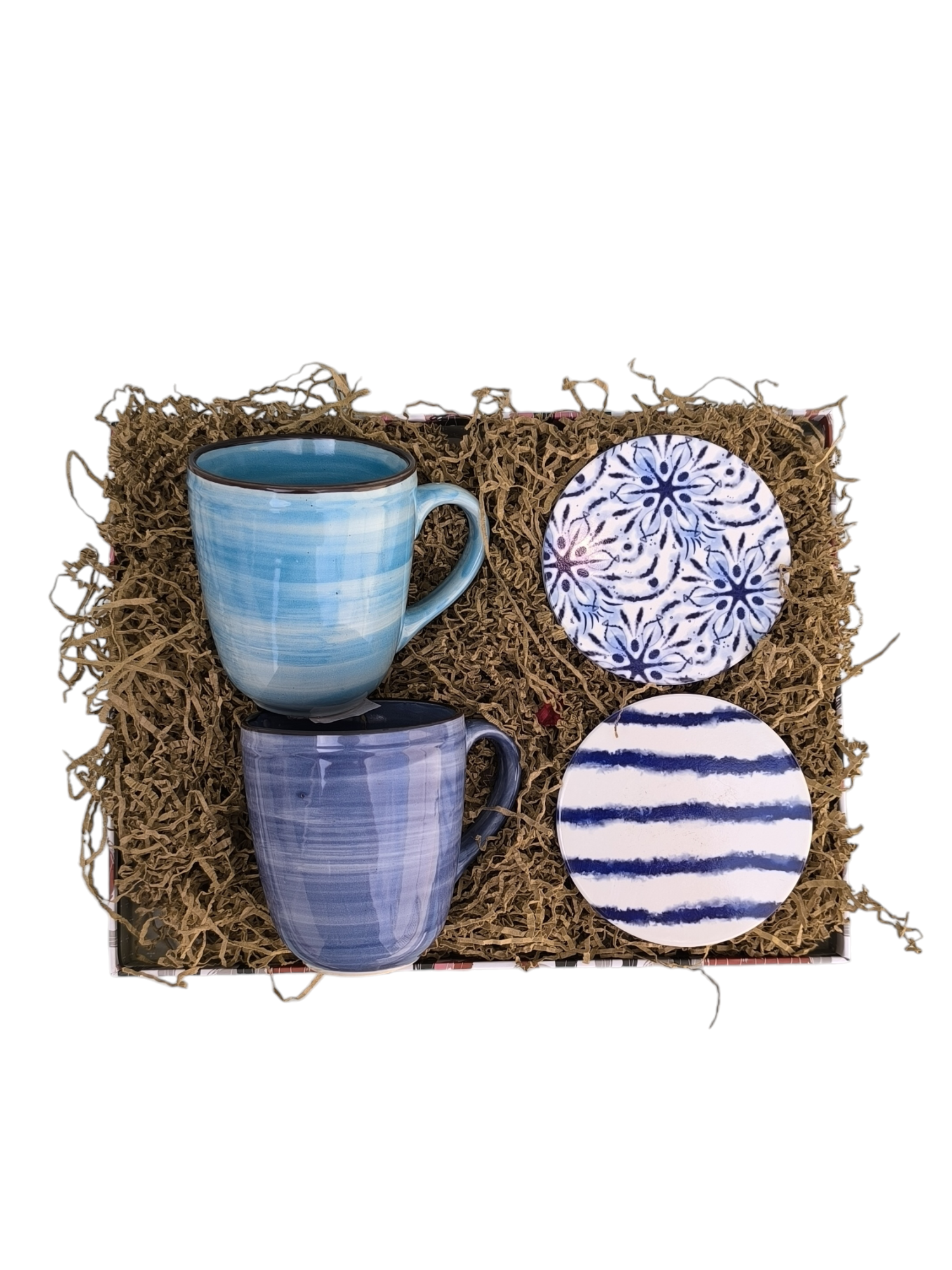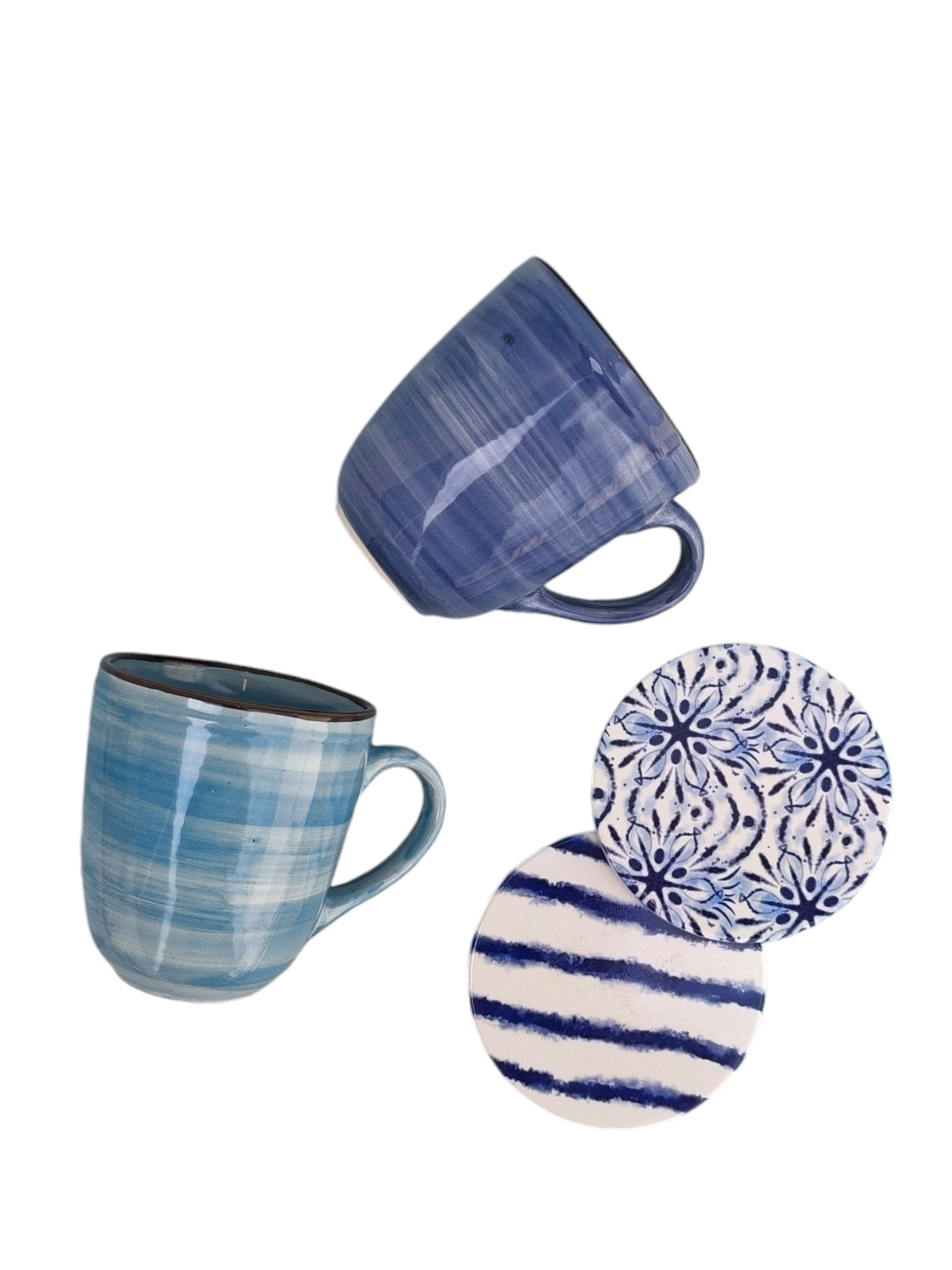 Ένα δώρο όμορφο και χρηστικό! Σετ κεραμικές κούπες από δολομίτη σε υπέροχα τυρκουάζ χρώματα ασορτί με 2 πορσελάνινα σουβέρ σε μεσογειακούς χρωματικούς συνδυασμούς. Μοναδικό δώρο για ένα καινούργιο σπίτι ή για δώρο γάμου! Το παραλαμβάνεται σε κουτί πολυτελείας έτοιμο για να το προσφέρετε ως δωράκι. ❊ Μέγεθος Σουβέρ: 10 εκατοστά διάμετρος
