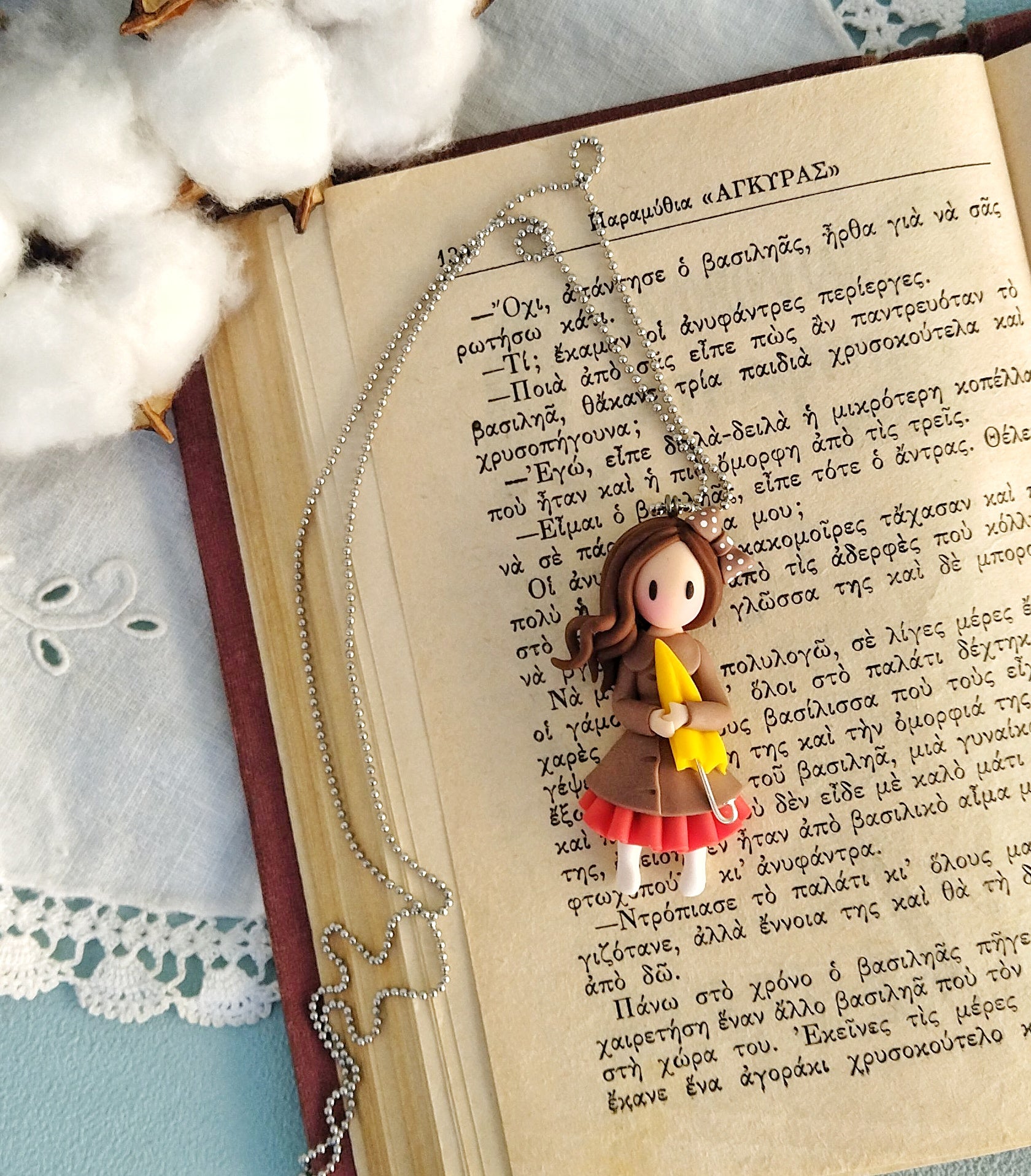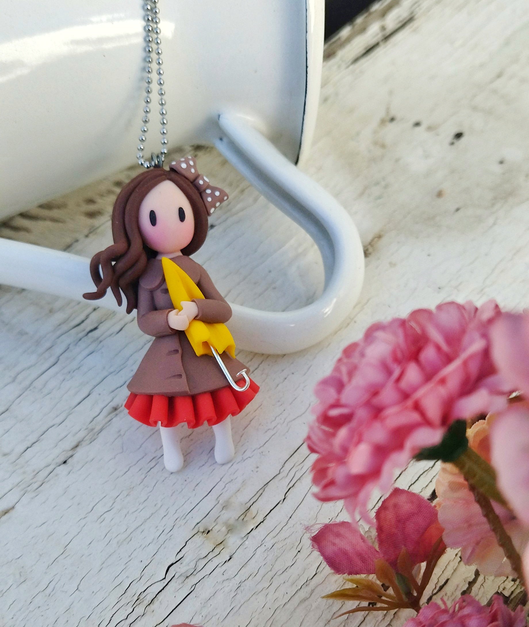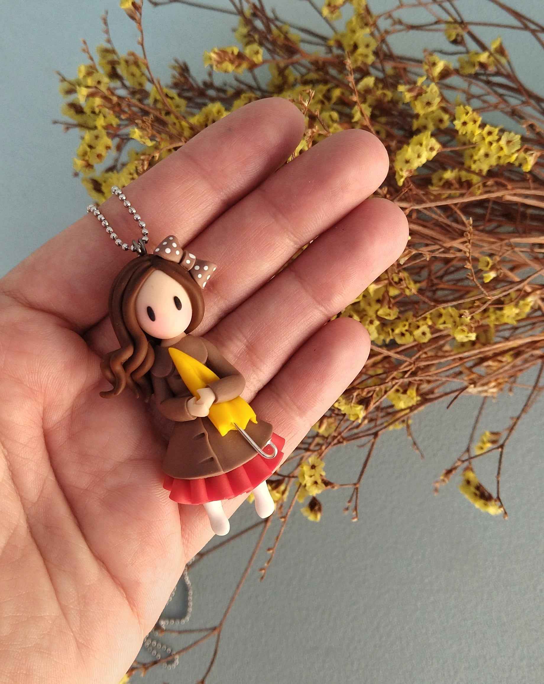 Μοναδικό κολιέ κοριτσάκι φτιαγμένο εξολοκλήρου στο χέρι από πολυμερικό πηλό. Μια μικροσκοπική κουκλίτσα που κρατά την πιο χαριτωμένη κίτρινη ομπρελίτσα που θα δείς ποτέ σου! Είναι περίπου 6.5 εκατοστά σε ύψος και συνοδεύεται από 80 εκατοστά ατσάλινη αλυσίδα.