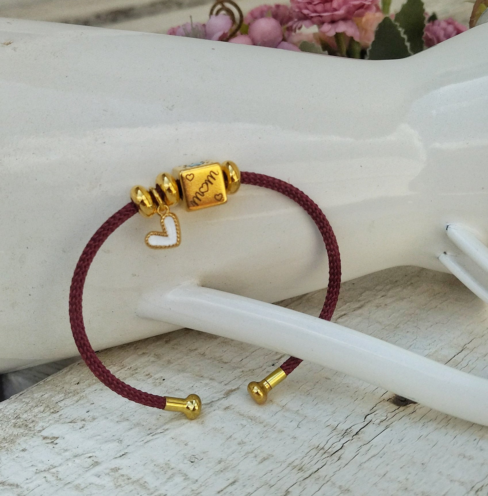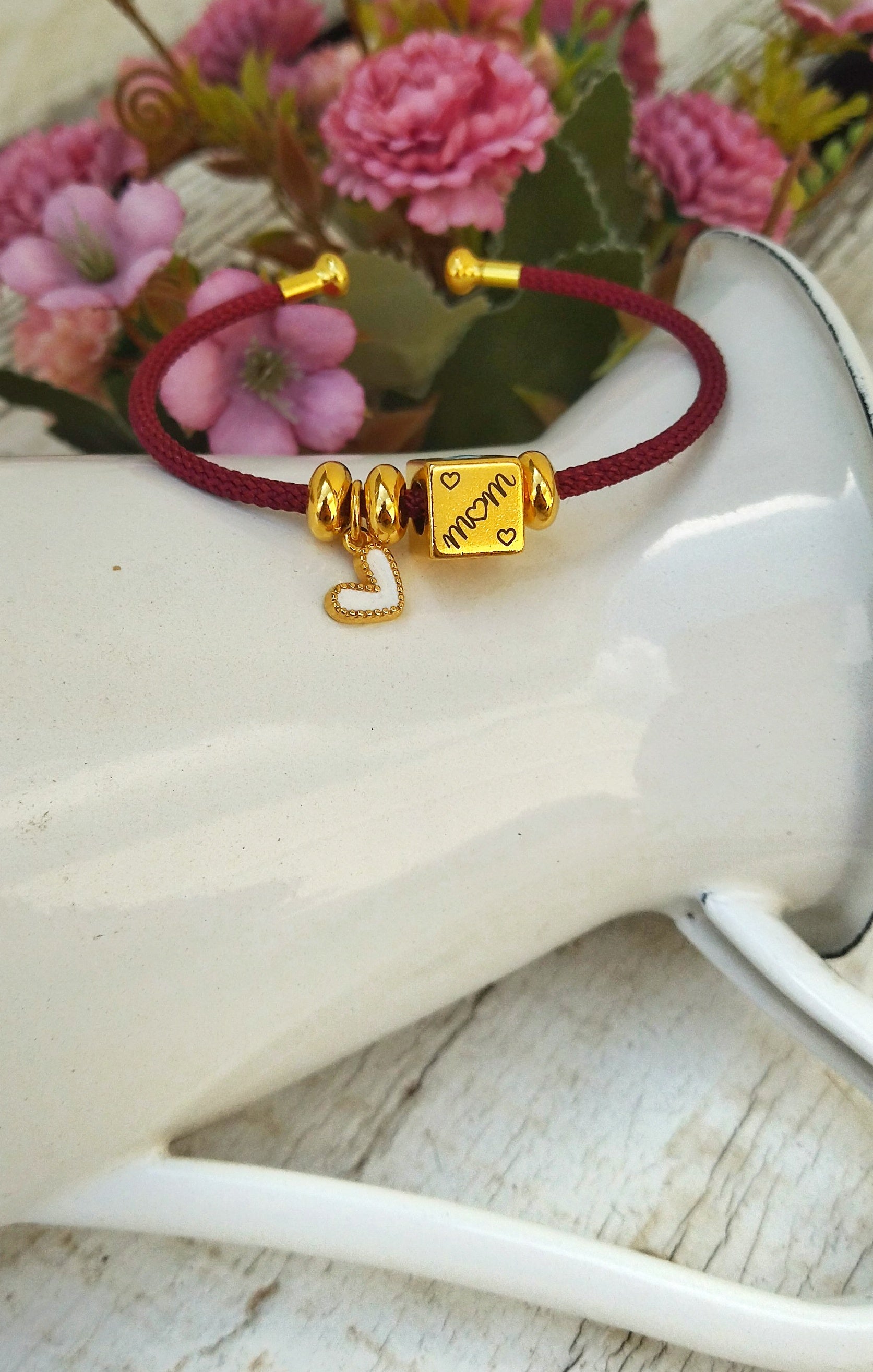 Υπέροχο βραχιόλι σε στύλ χειροπέδας για την ημέρα της μητέρας ή ένα γλυκό δώρο για μια μανούλα που μόλις γέννησε! Διάλεξε το χρώμα που επιθυμείς στο κορδόνι του βραχιολιού ανάλογα με την προσωπικότητα της μανούλας. Κάθε πλευρά του κύβου έχει διαφορετικό σχεδιάκι. Λουλούδι, αστέρι και η λέξη "mom (μαμά) με δύο διαφορετικούς τρόπους. Η μικροσκοπική καρδούλα στο πλάι προσθέτει μια τσαχπινιά αλλά και αμέριστη τρυφερότητα στο σύνολο.
