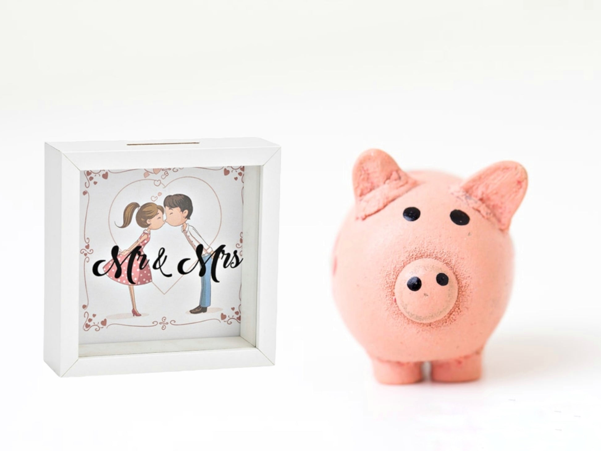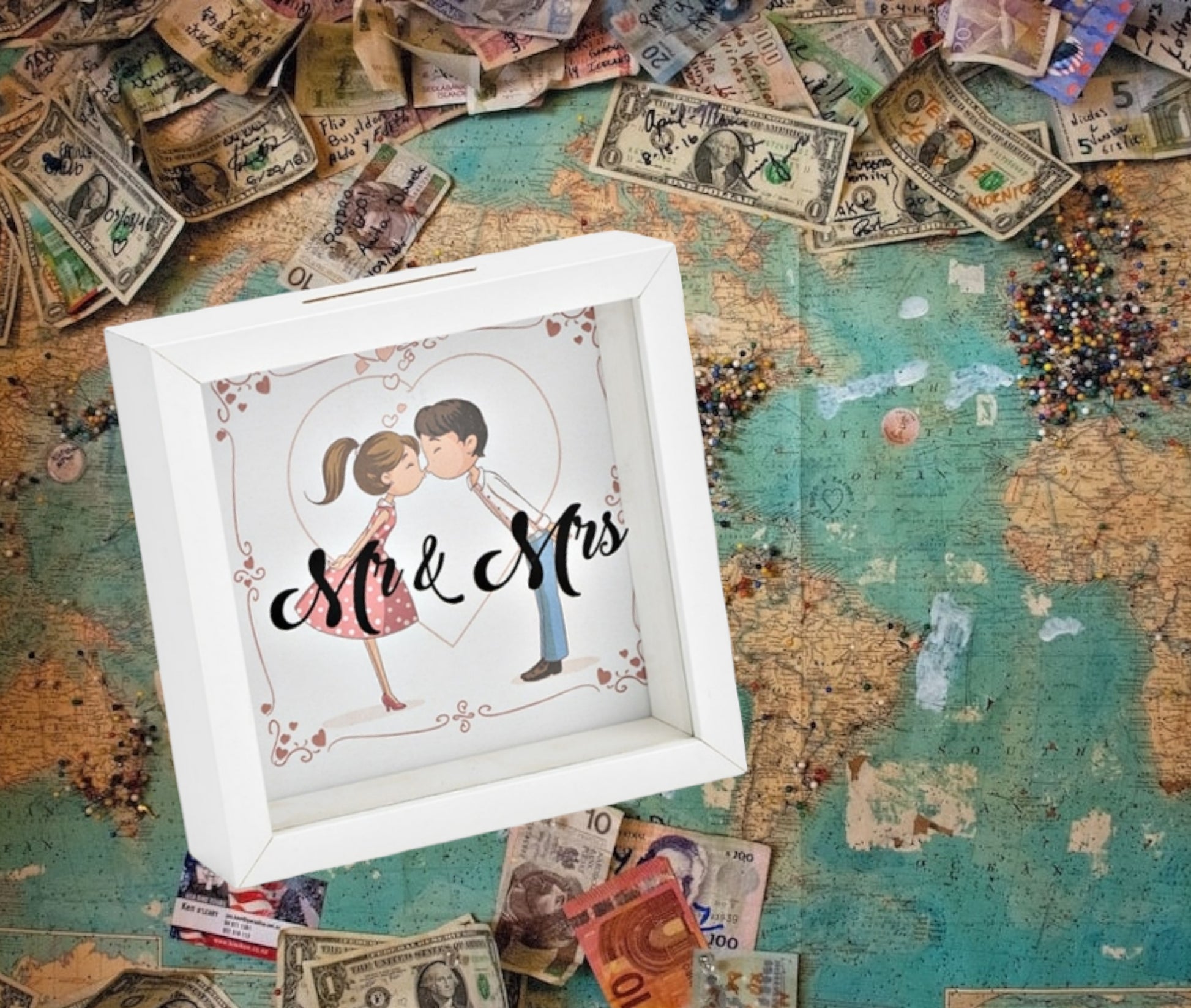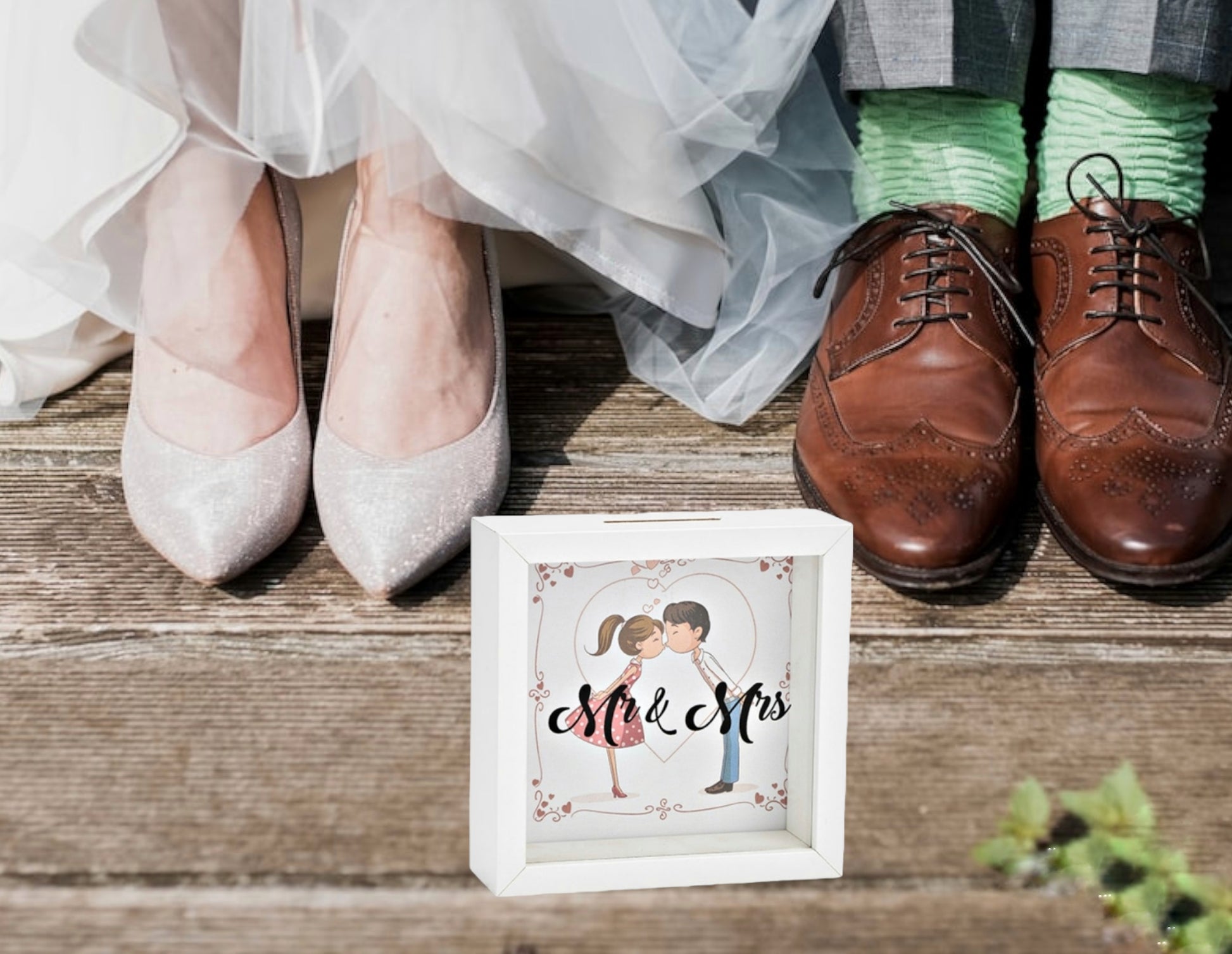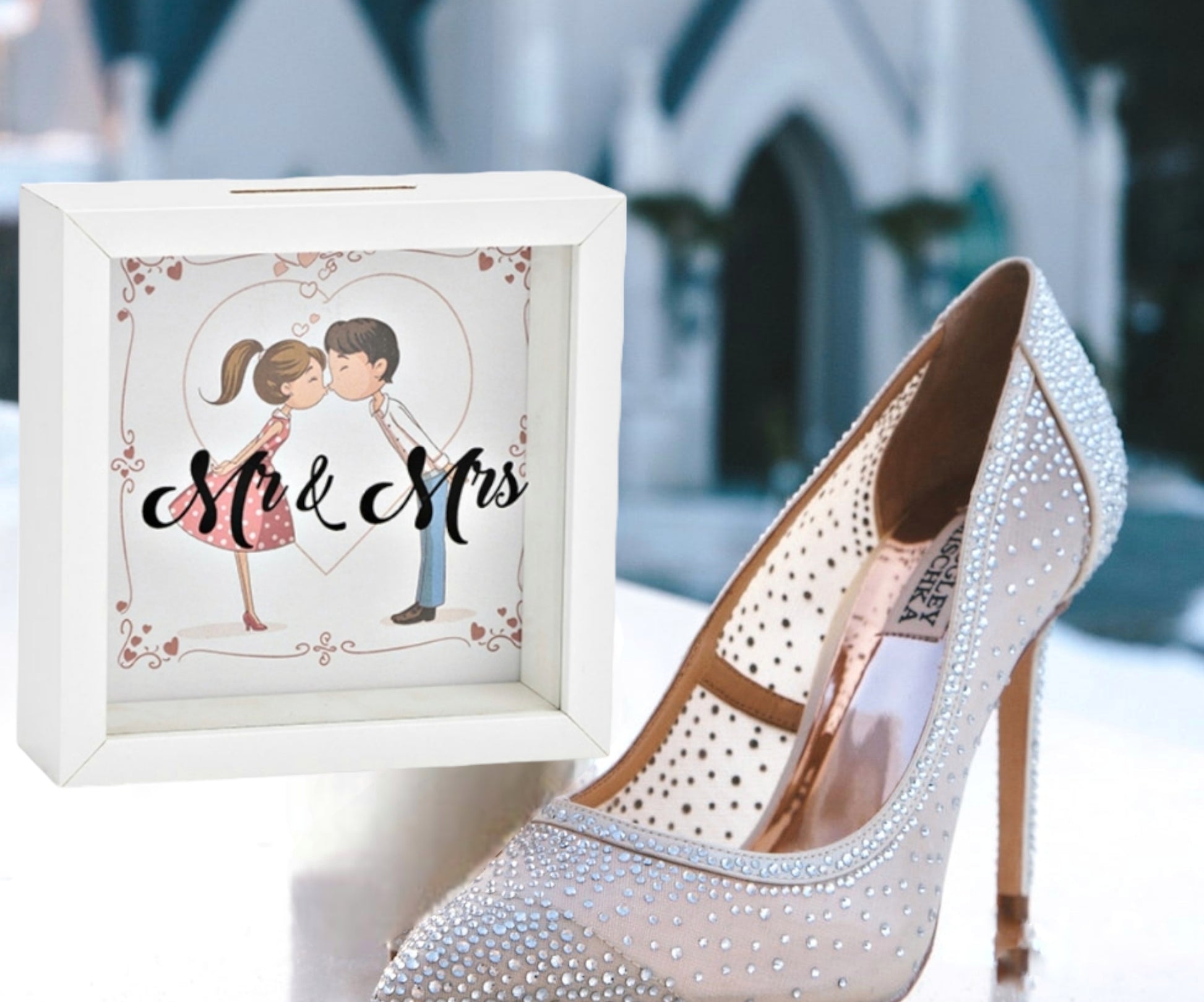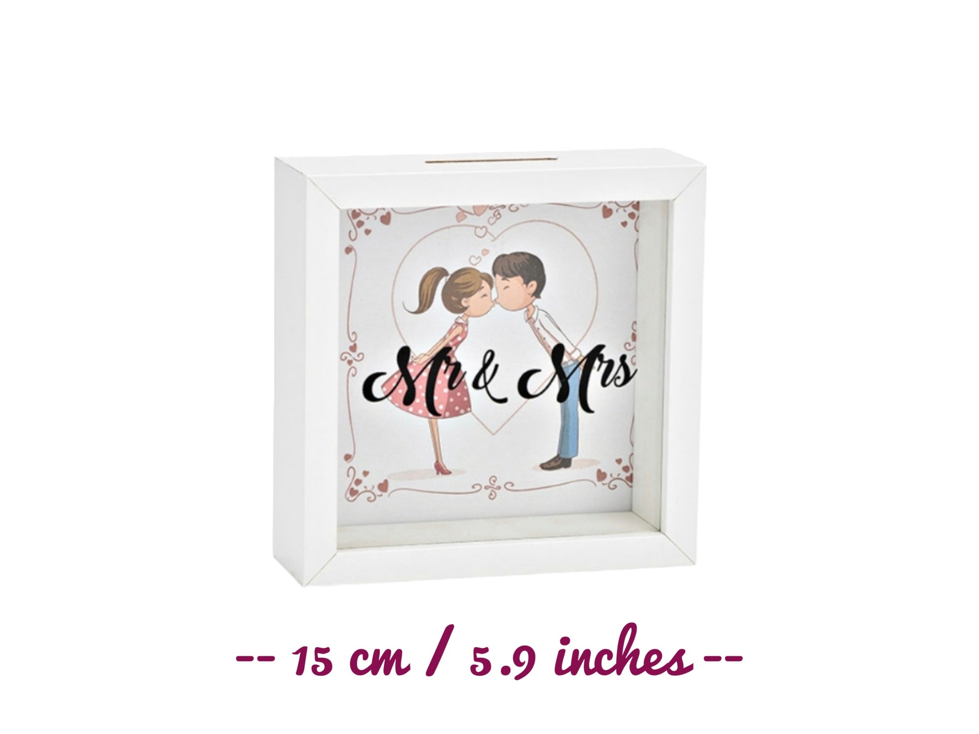 Το πιο πρωτότυπο δώρο γάμου! Κουμπαράς κουτάκι με γραμμένο μπροστά στο τζάμι "Mr & Mrs" και στο βάθος του ένα χαριτωμένο ζευγαράκι γαμπρός-νύφη! Ιδανικό για την πρώτη αποταμίευση του ζευγαριού ή για τη συγκέντρωση χρημάτων για το γαμήλιο ταξίδι. Ταιριάζει απόλυτα στο τραπέζι με το βιβλίο ευχών, ώστε οι καλεσμένοι να ρίχνουν μέσα τα φακελάκια τους.