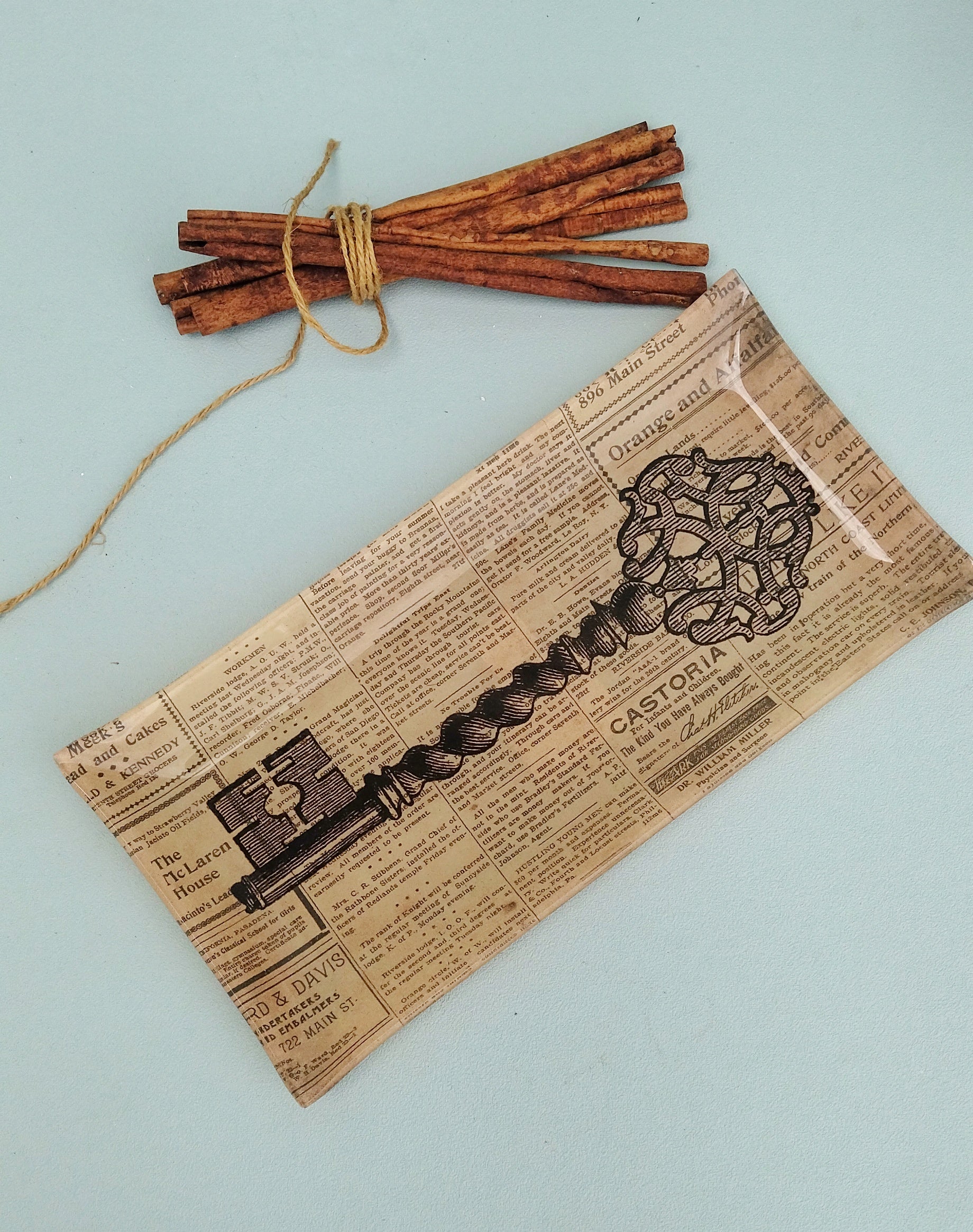 Υπέροχη πιατέλα από γυαλί με σχέδιο από παλιές εφημερίδες και ένα μεγάλο αντικέ κλειδί. Ιδανική για να την διακοσμήσετε στο τραπέζι του σαλονιού ή της εισόδου του σπιτιού με τα αγαπημένα σας κεριά ή να τη γεμίσετε ποτ πουρί για μια λουλουδάτη αίσθηση.