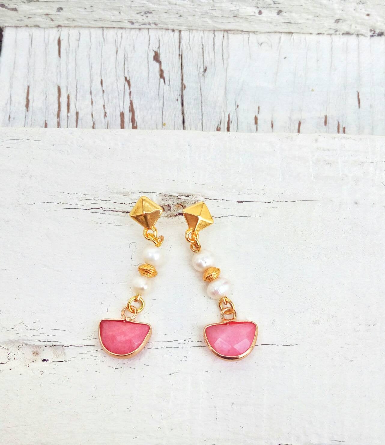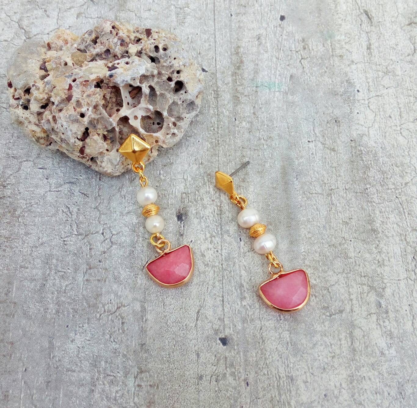 Βυζαντινά σκουλαρίκια, επιχρυσωμένα με 22 καράτια χρυσό. Φτιαγμένα με παραδοσιακές τεχνικές δημιουργίας βυζαντινών κοσμημάτων. Με ροζ ημιπολύτιμους λίθους jade και μικροσκοπικά μαργαριτάρια.