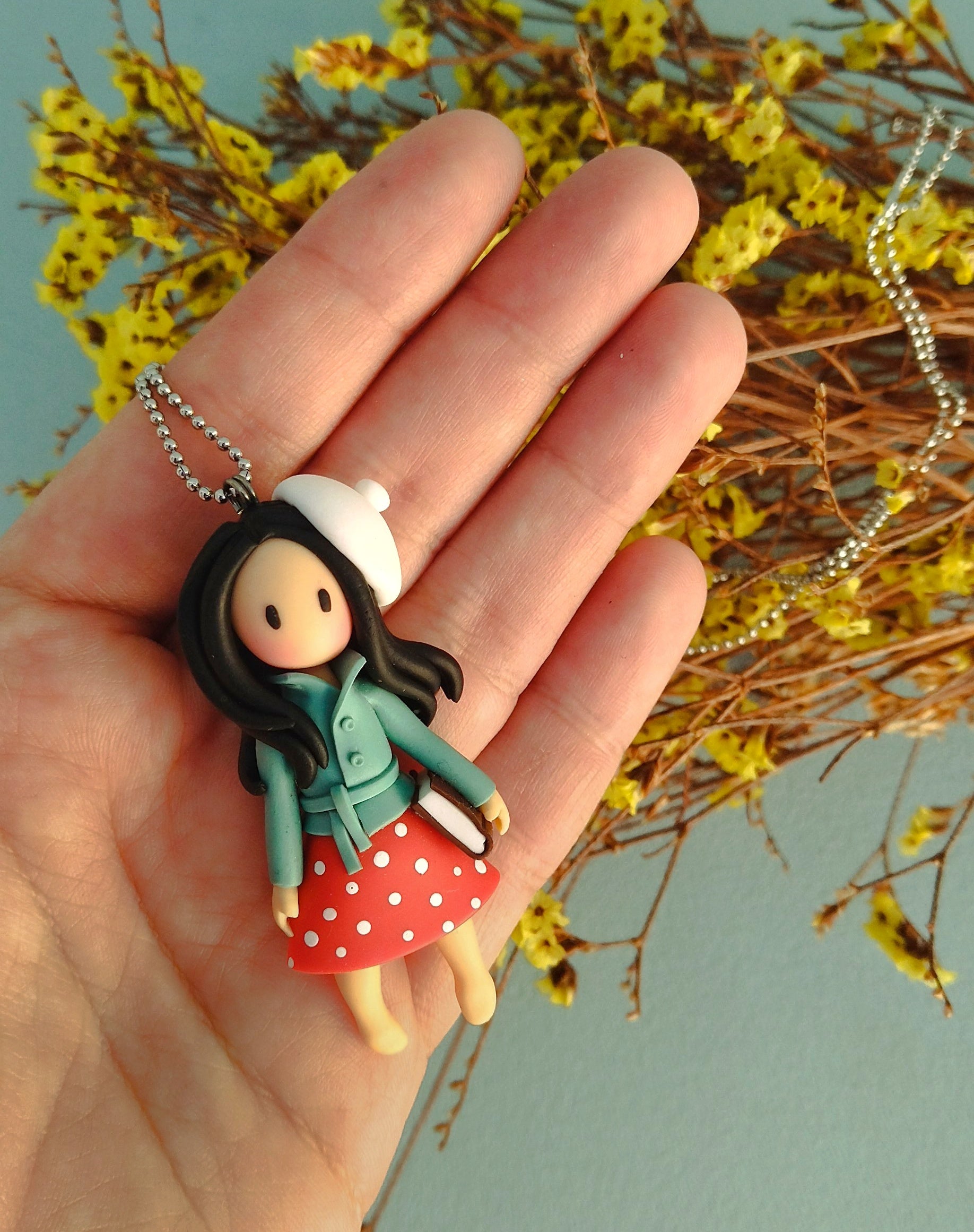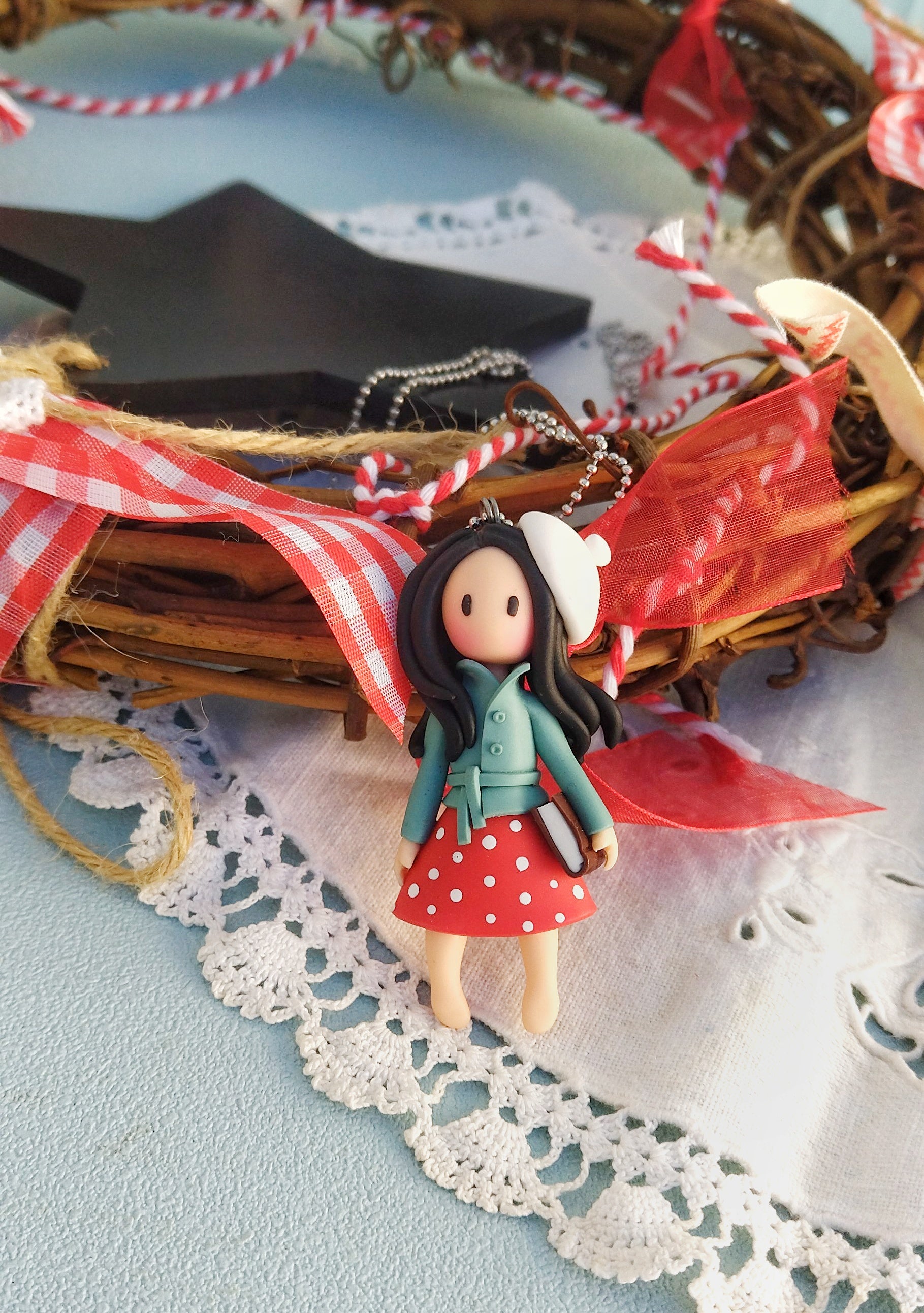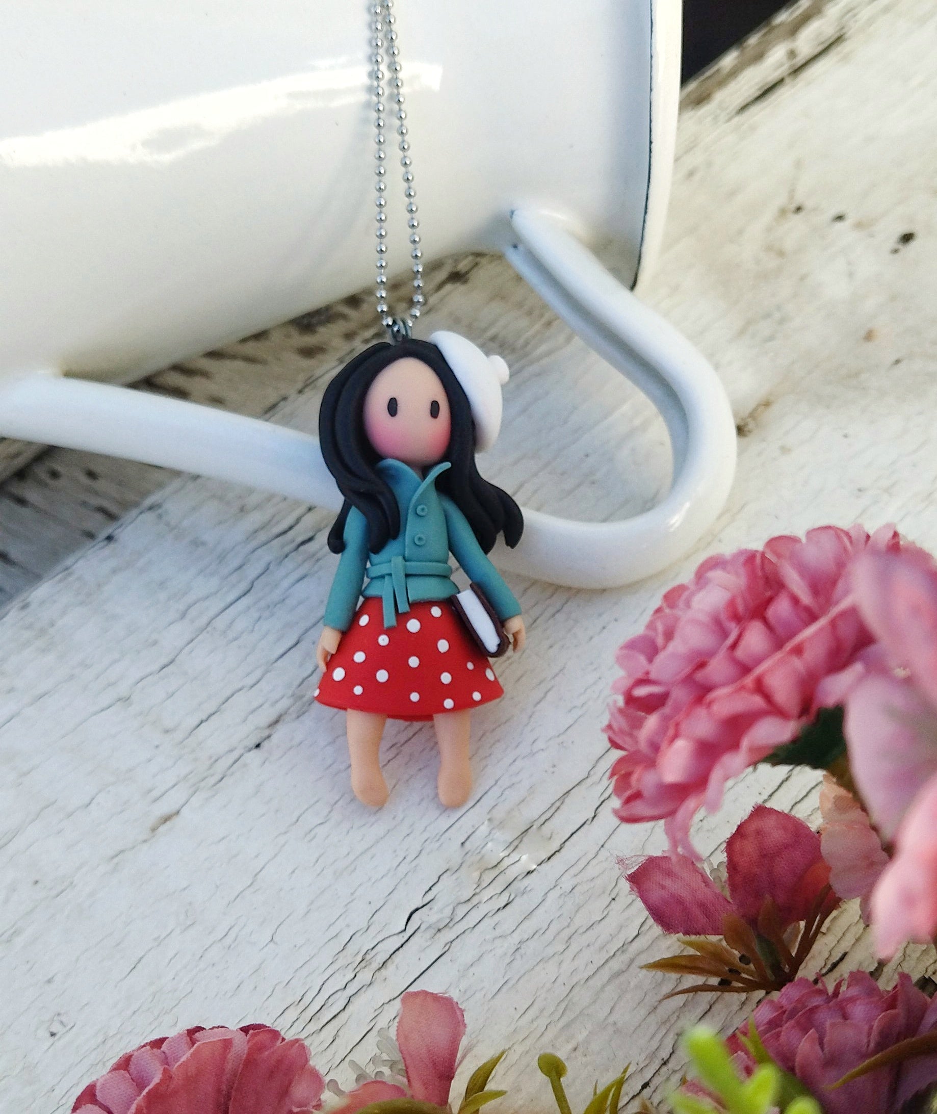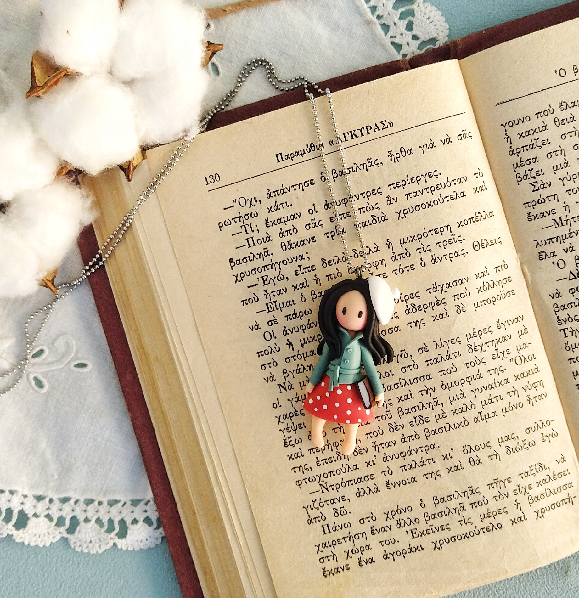 Μοναδικό κολιέ κοριτσάκι φτιαγμένο εξολοκλήρου στο χέρι από πολυμερικό πηλό. Μια μικροσκοπική κουκλίτσα που κρατά βιβλία στο χέρι της, ιδανικό δώρο για δασκάλα ή μια λάτρη των βιβλίων. Είναι περίπου 6.5 εκατοστά σε ύψος και συνοδεύεται από 80 εκατοστά ατσάλινη αλυσίδα. **Αυτό το κολιέ φτιάχνεται κατά παραγγελία και έχει 3-4 περίπου εβδομάδες χρόνο κατασκευής**