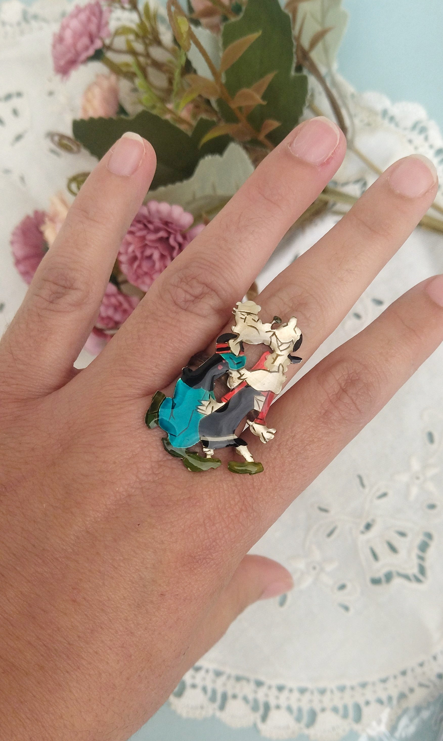 Αγαπημένο ζευγάρι από τον κόσμο των κόμιξ! Ο Ποπάυ κρατώντας στην αγκαλιά του την Όλιβ και δίνοντάς της ένα γλυκό φιλί... Φτιαγμένο από ασήμι 925 και ζωγραφισμένο με απίστευτη λεπτομέρεια με σμάλτο, αυτό το δαχτυλίδι είναι φτιαγμένο για να σας ανεβάσει τη διάθεση! Ιδανικό δώρο για το τσαχπίνικο κορίτσι σου την ημέρα του Αγίου Βαλεντίνου.. Με ανοιχτή βέρα ώστε να εφαρμόζει σωστά σε κάθε μέγεθος δαχτύλου.