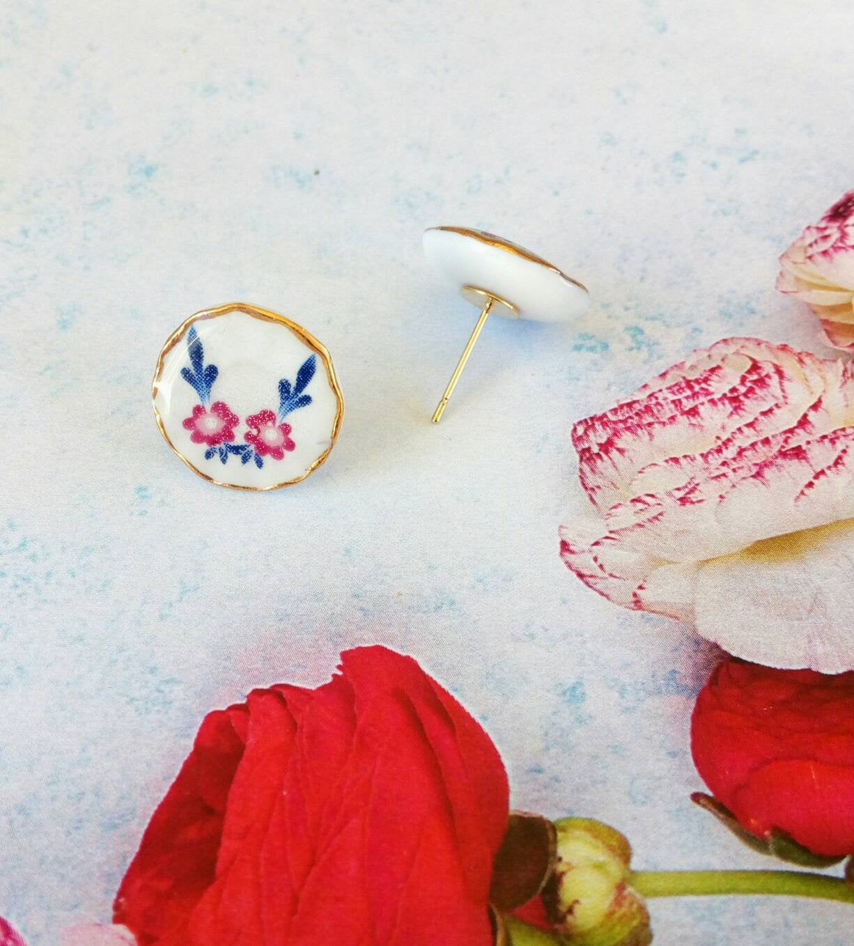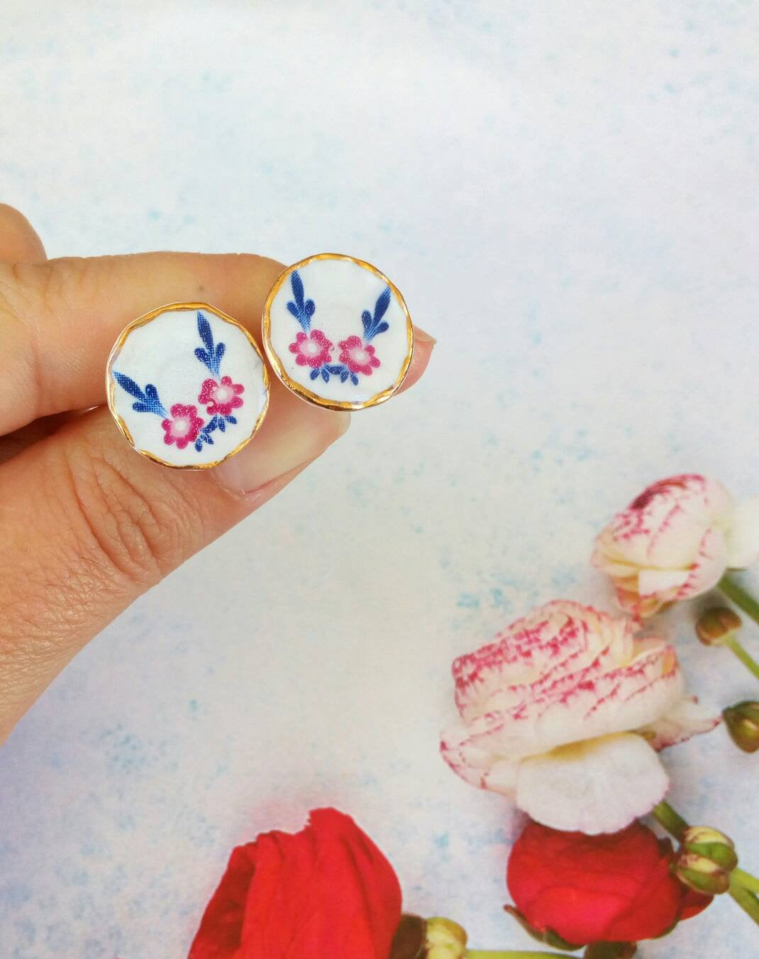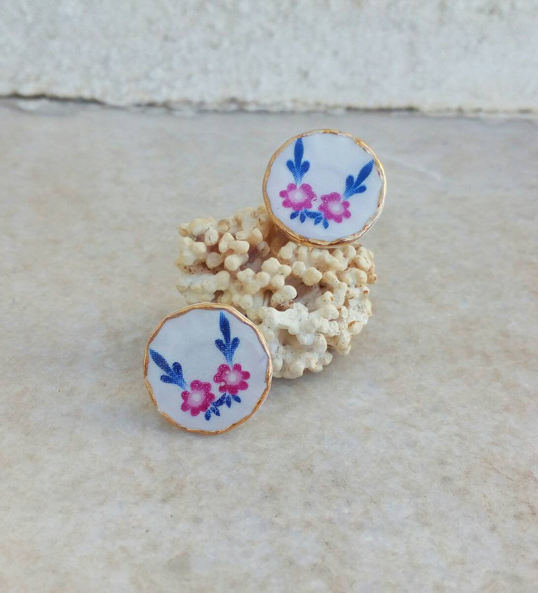 Πορσελάνινα σκουλαρικάκια με λουλουδάκια σε ροζ και μπλέ αποχρώσεις.