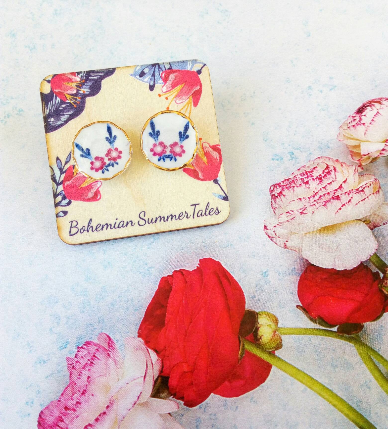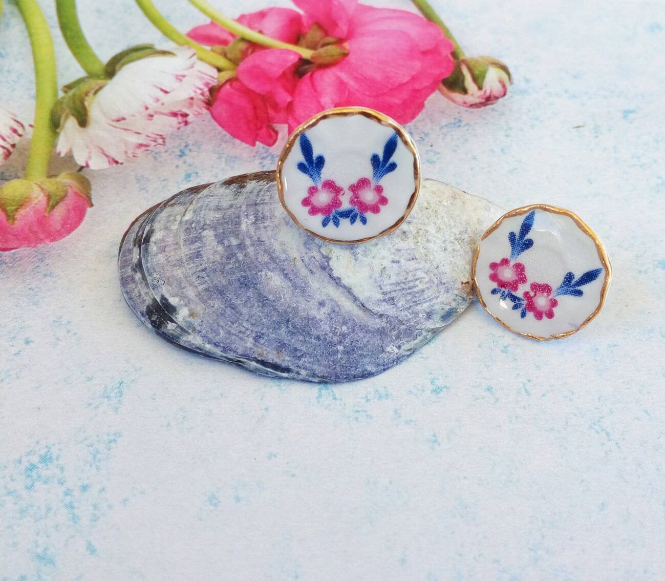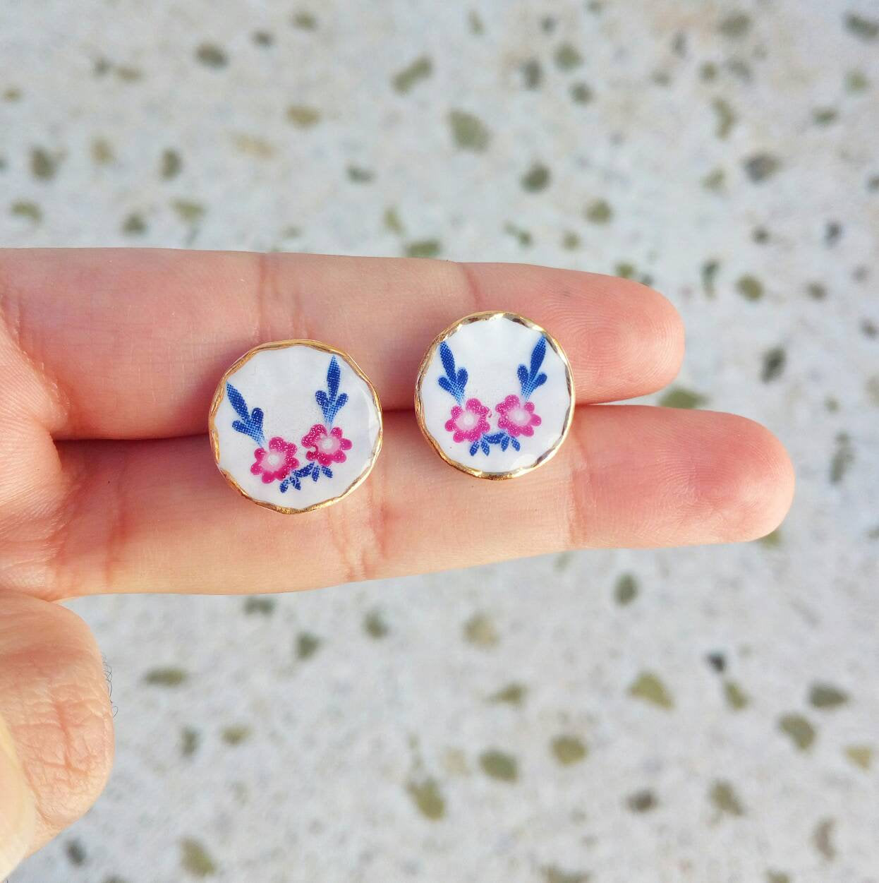 Πορσελάνινα σκουλαρικάκια με λουλουδάκια σε ροζ και μπλέ αποχρώσεις.
