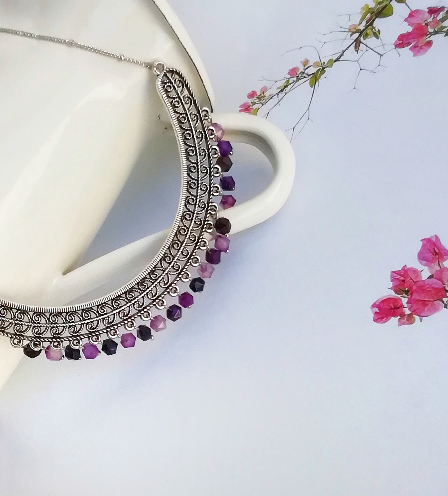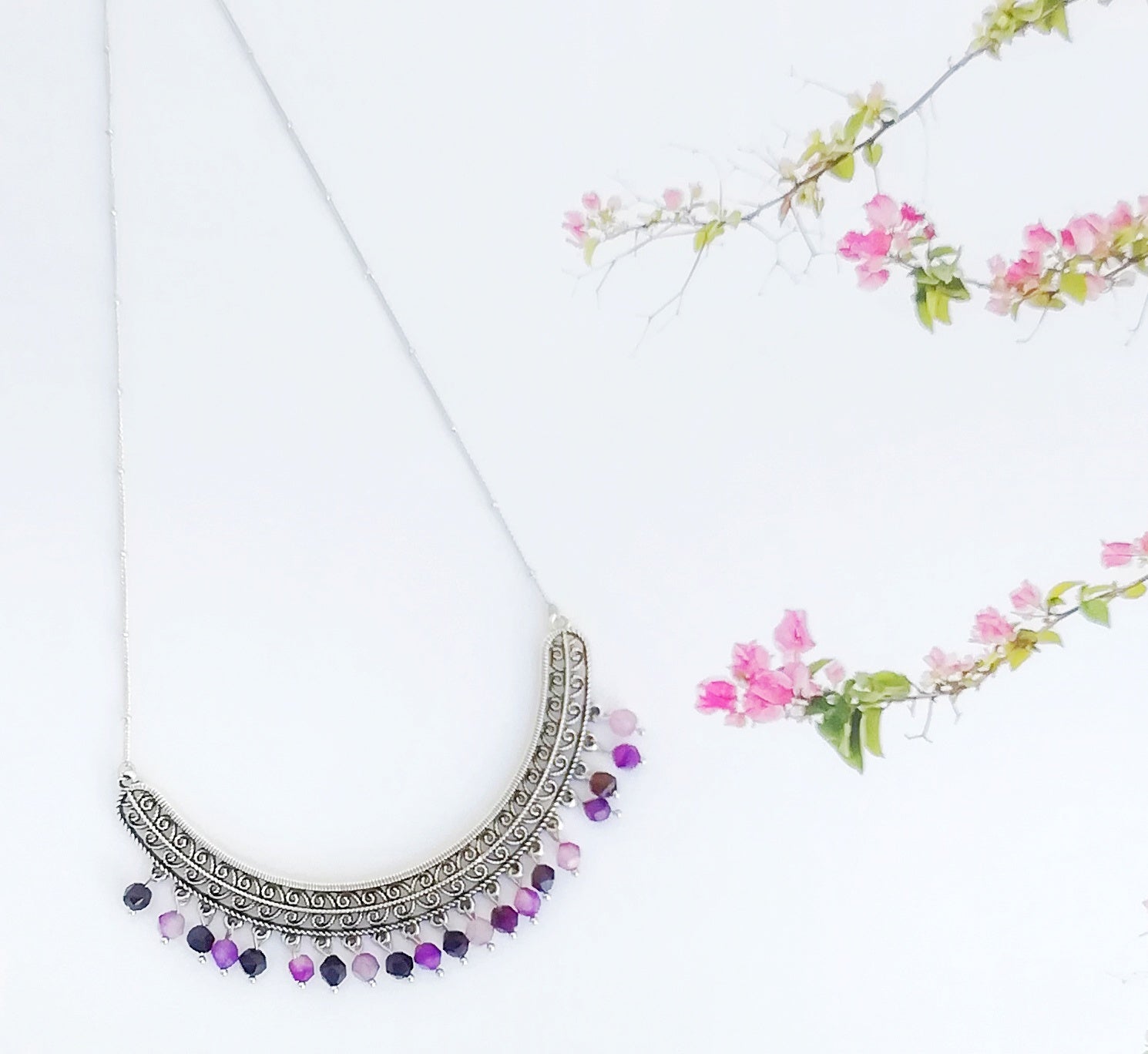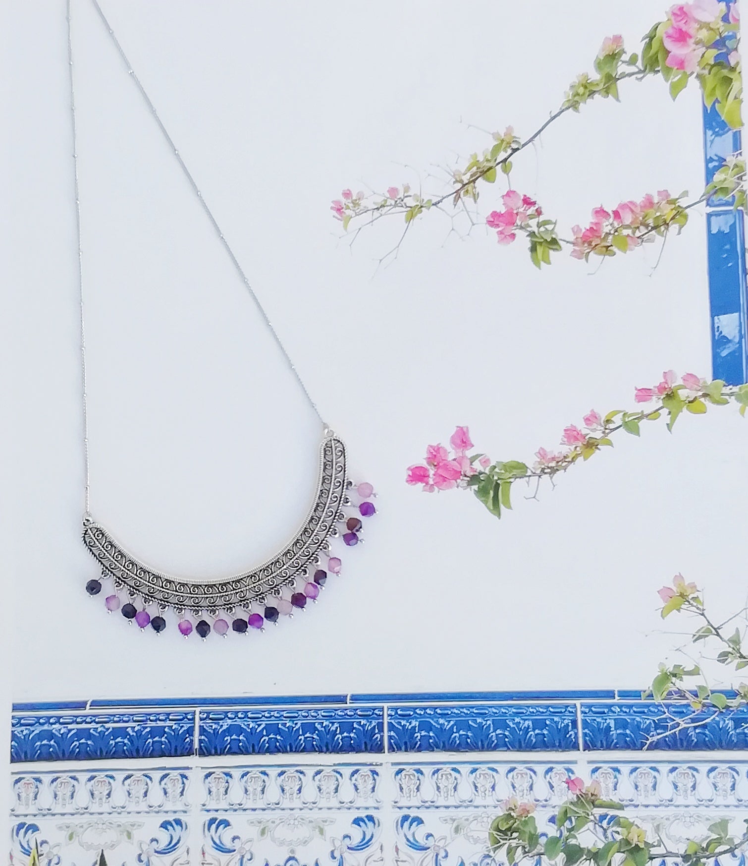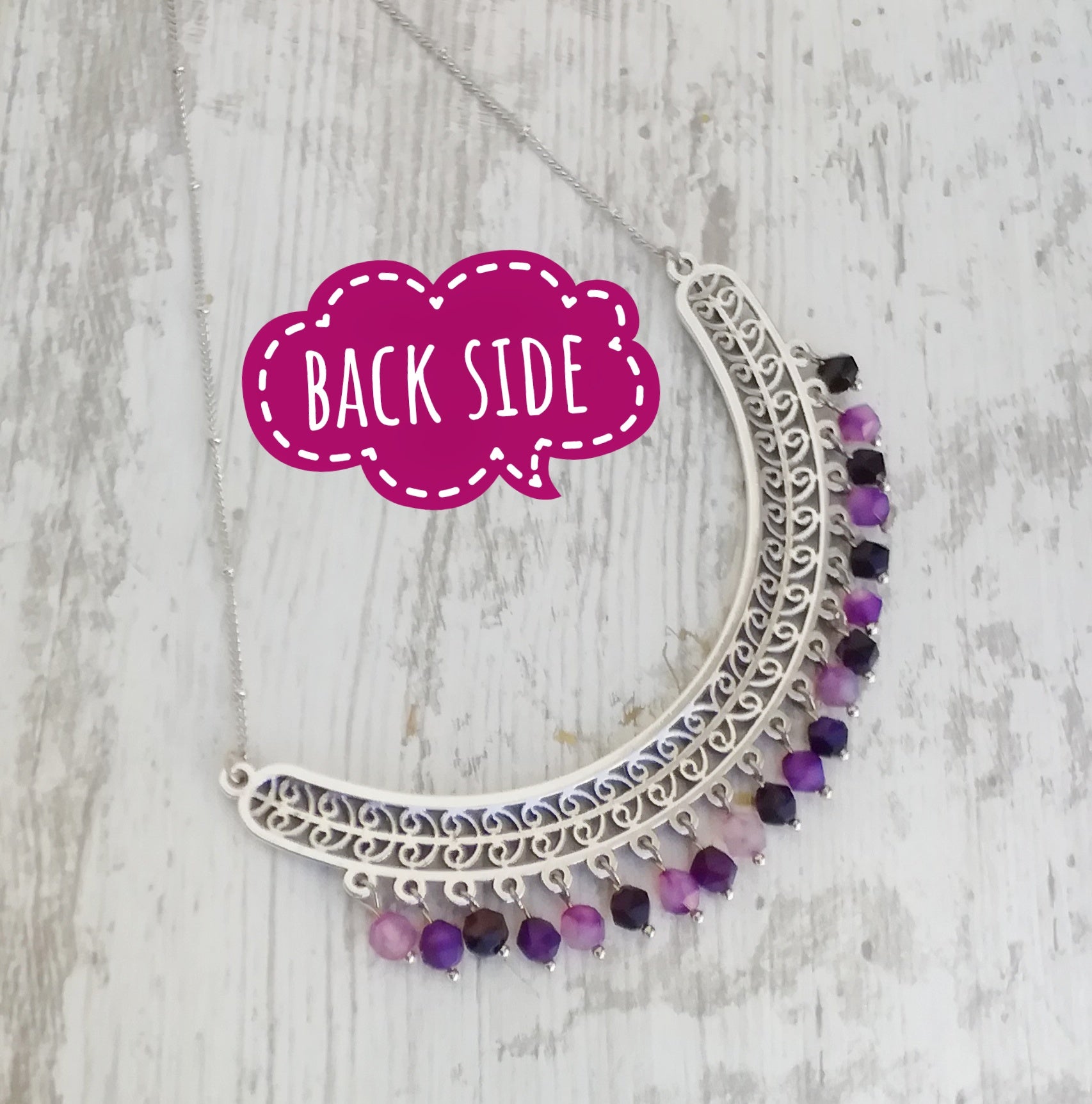 Εντυπωσιακό κολιέ με μωβ αχάτη σε επαργυρωμένο αντικέ μπρούτζο. Εμπνευσμένο από την βυζαντινή παράδοση..