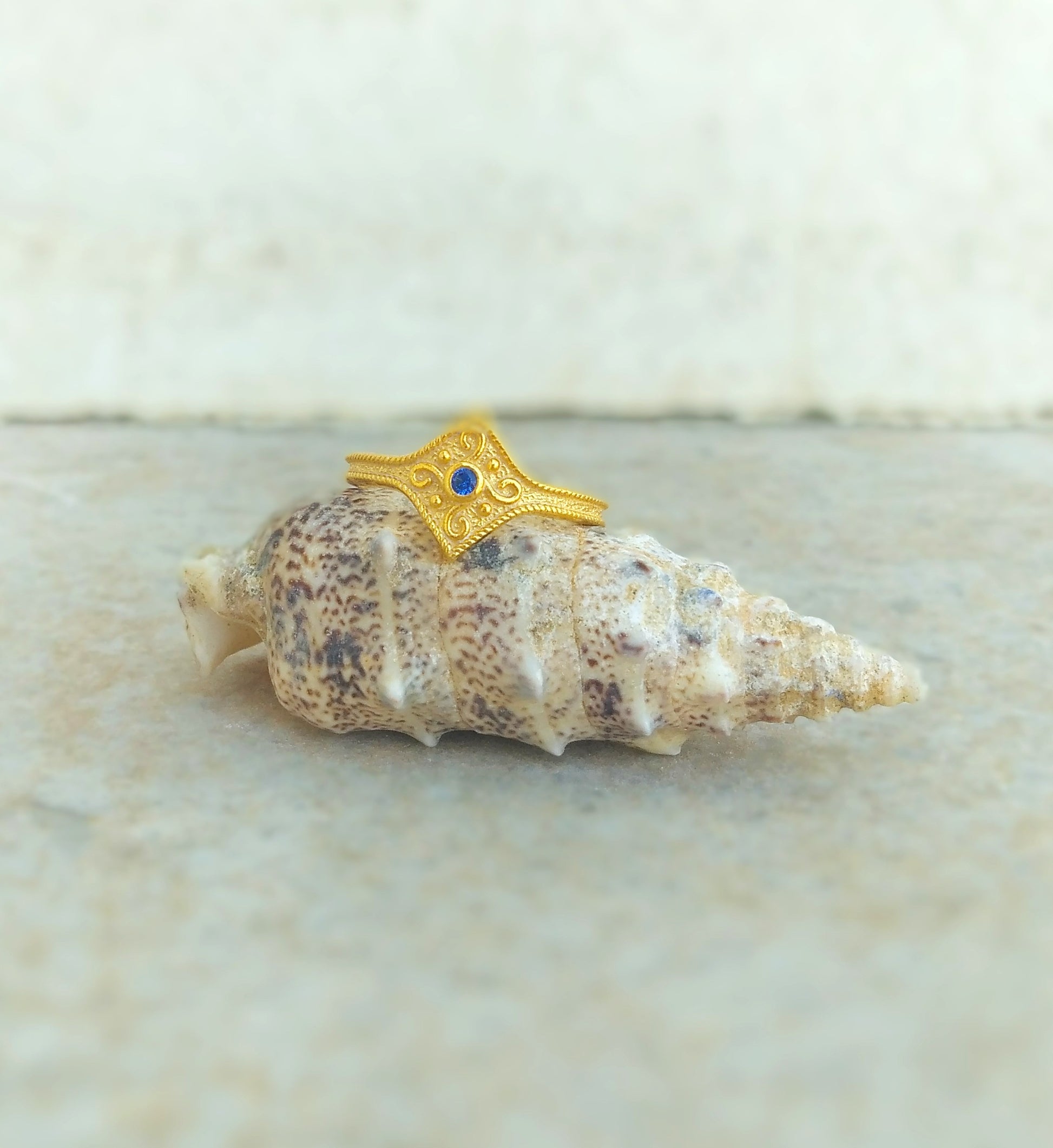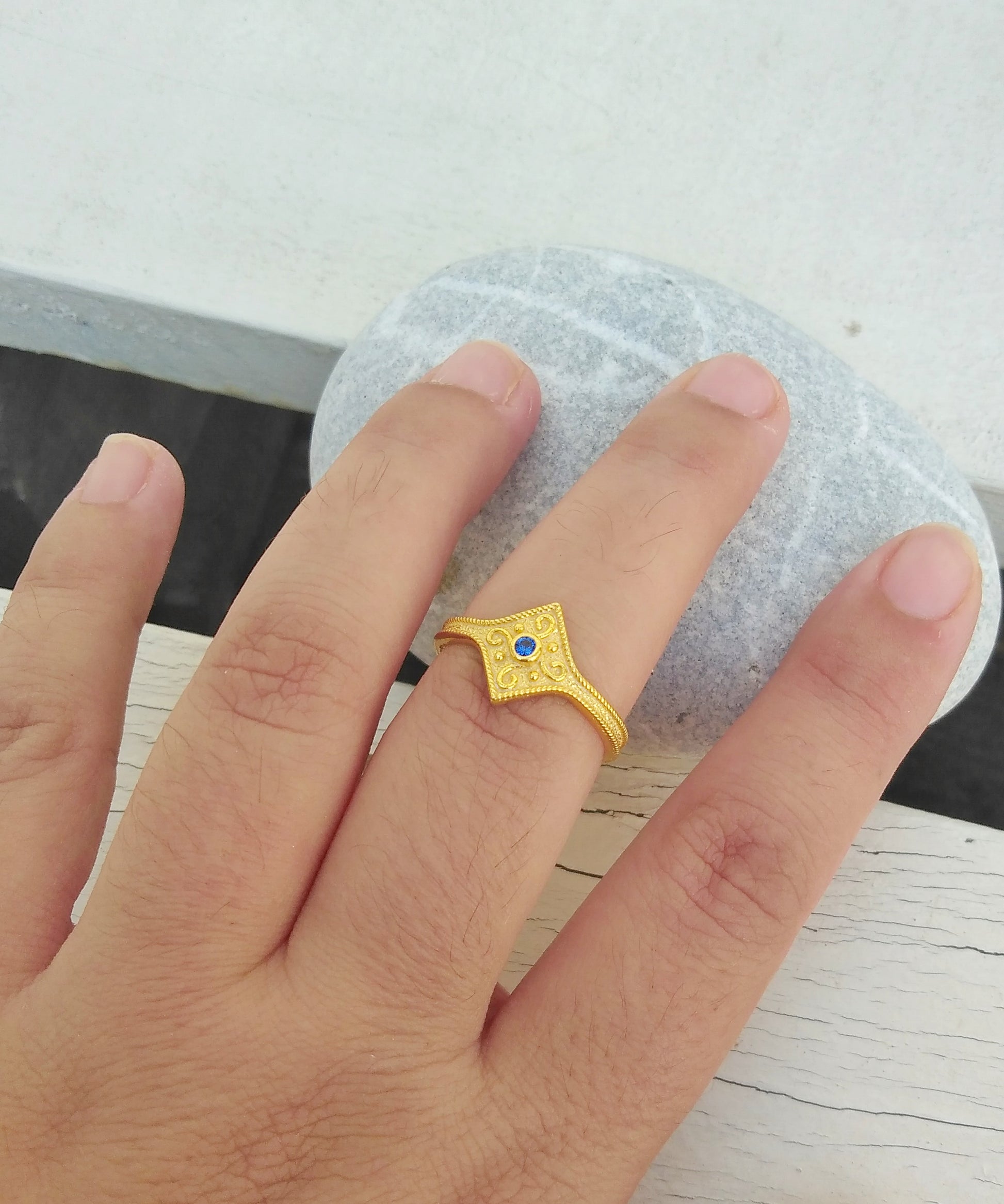 22Κ επίχρυσο δαχτυλίδι φτιαγμένο από ασήμι 925.Ένα μοναδικό κόσμημα βυζαντινής τέχνης! Ντελικάτο και εντυπωσιακό ταυτόχρονα, συνδυάζεται άνετα σε κάθε ώρα της ημέρας. Με χρωματιστό ζιρκόν στο κέντρο.