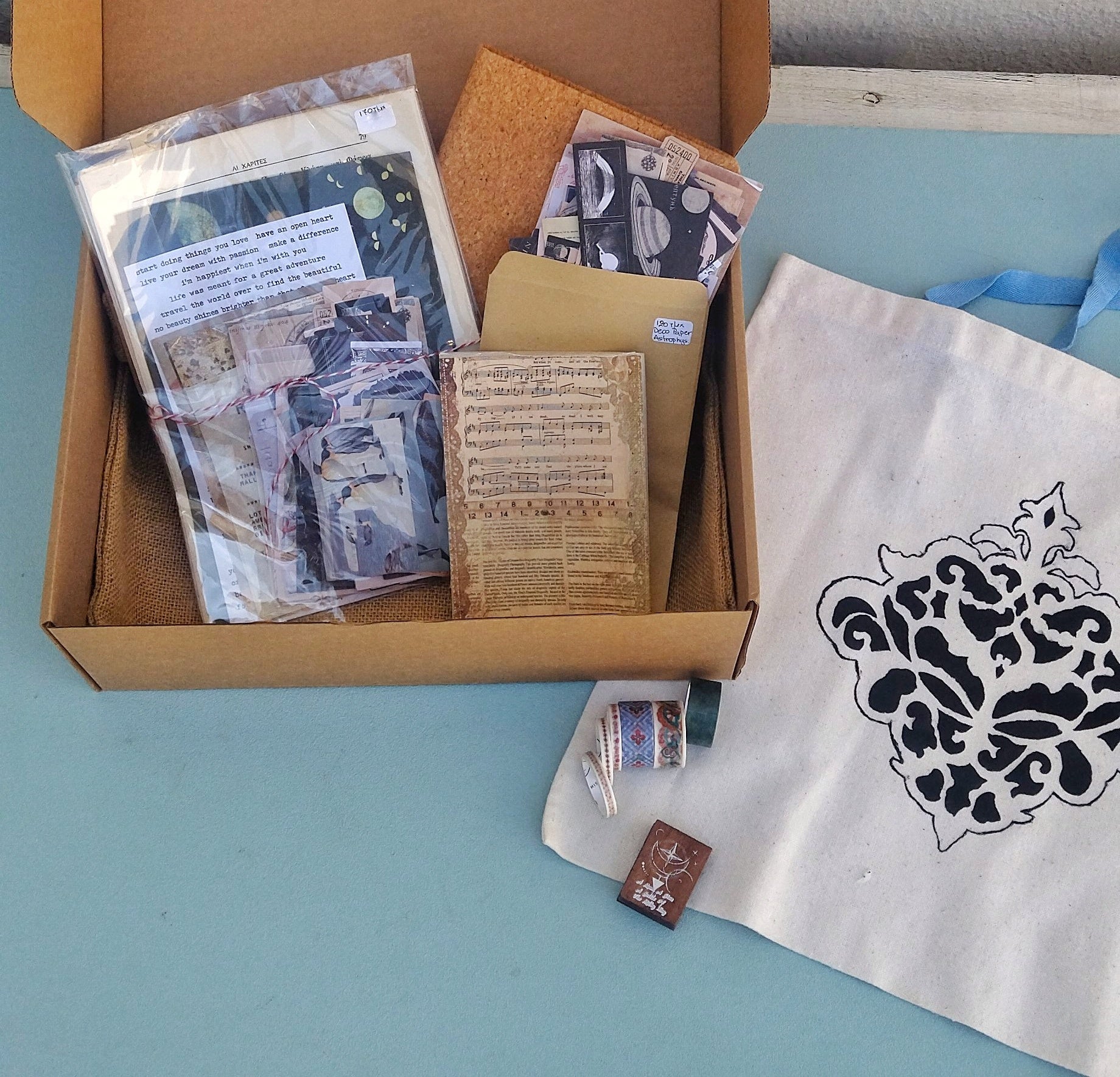 Ένα εισιτήριο χαλάρωσης και δημιουργίας! Ένα πακέτο για αρχάριους αλλά και για προxωρημένους που περιέχει ό,τι χρειάζεστε για να εξελίξετε την αγαπημένη χειροτεχνία του κολάζ. ❣ Το μικρό πακέτο περιέχει: ❊ 1 χειροποίητη λινή τσάντα ❊ 1 μικρό σημειωματάριο με λευκές σελίδες (τυχαία επιλογή από αυτά που βλέπετε στις φωτογραφίες) ❊ 2 σελίδες με γνωμικά αυτοκόλλητα ❊ 70+ αυτοκόλλητα ❊ 200+ χαρτιά για κολάζ ❊ 1 σφραγιδούλα από τη συλλογή μας ❊ 5 διαφορετικά σχέδια ταινίας αυτοκόλλητης ❣ Το μεγάλο πακέτο περιέχει: ❊ 1 χειροποίητη λινή τσάντα ❊ 1 μικρό σημειωματάριο με λευκές σελίδες (τυχαία επιλογή από αυτά που βλέπετε στις φωτογραφίες) ❊ 2 σελίδες με γνωμικά αυτοκόλλητα ❊ 140+ αυτοκόλλητα ❊ 270+ χαρτιά για κολάζ ❊ 1 σφραγιδούλα από τη συλλογή μας ❊ 5 διαφορετικά σχέδια ταινίας αυτοκόλλητης ❊ κόλλα ❊ 1 σετ εργαλείων για κολάζ ❊ 1 μινι διακορευτή ❊ μελάνι για τη σφραγίδα
