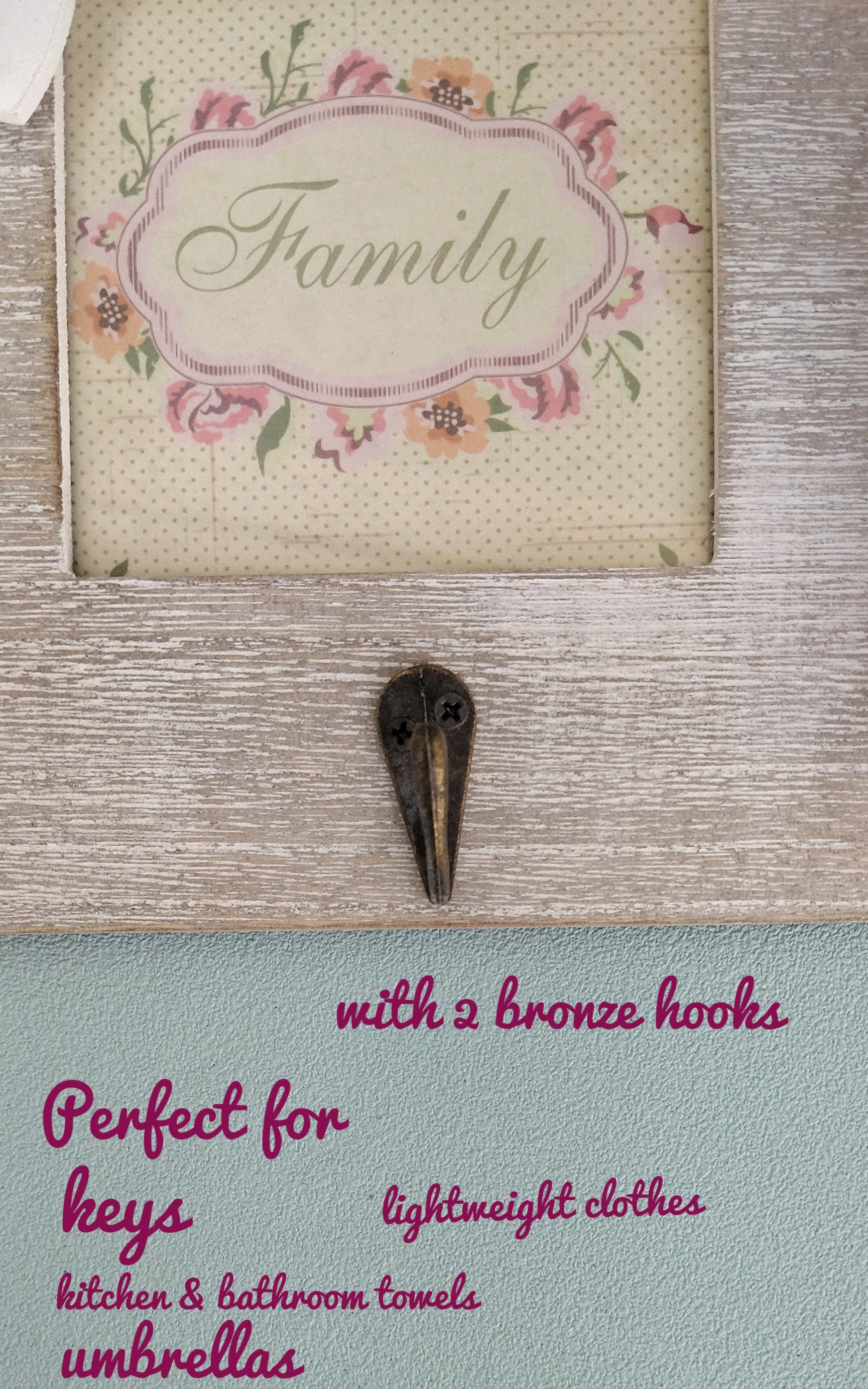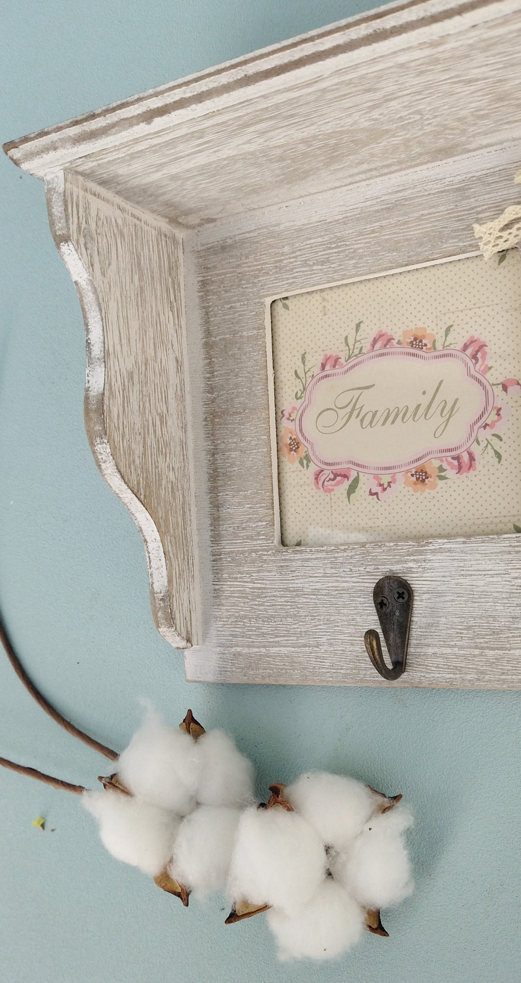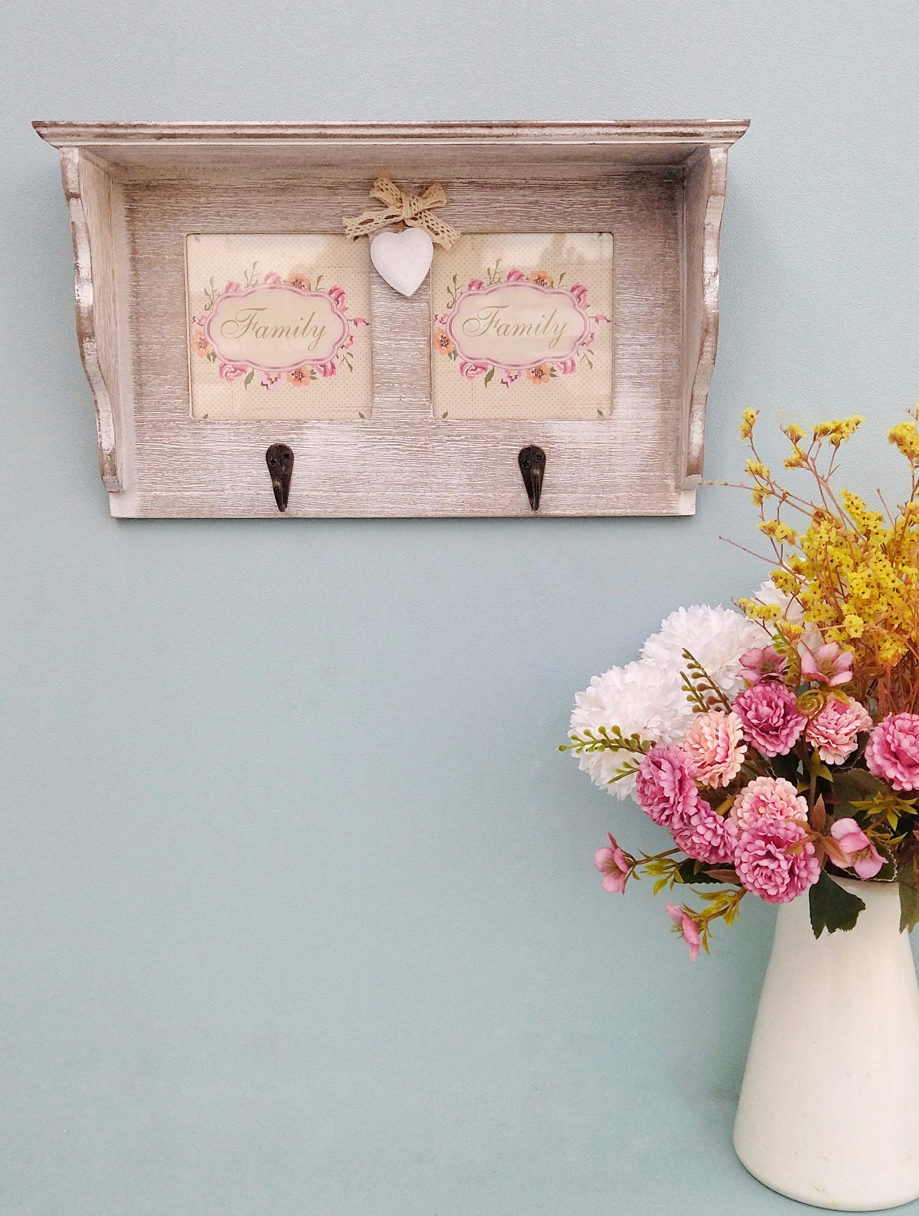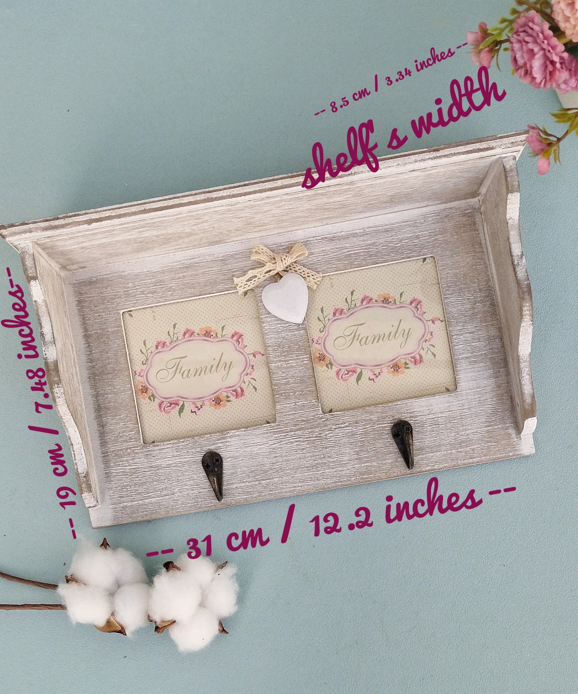 Χαριτωμένο ραφάκι για το παιδικό δωμάτιο ή την είσοδο του σπιτιού σας σε ρουστίκ στυλ. Με 2 κρεμαστράκια για να κρεμάτε τα κλειδιά σας ή ελαφριά ρουχαλάκια του μωρού σας και θέση για 2 μικρές φωτογραφίες.